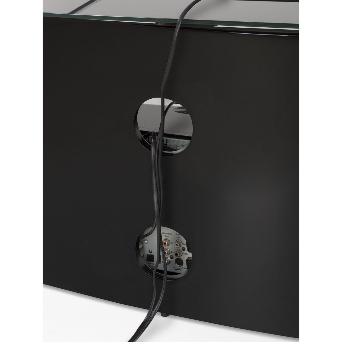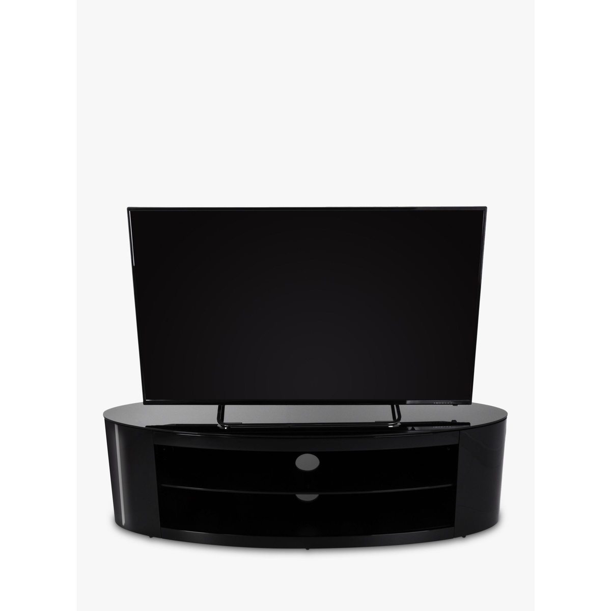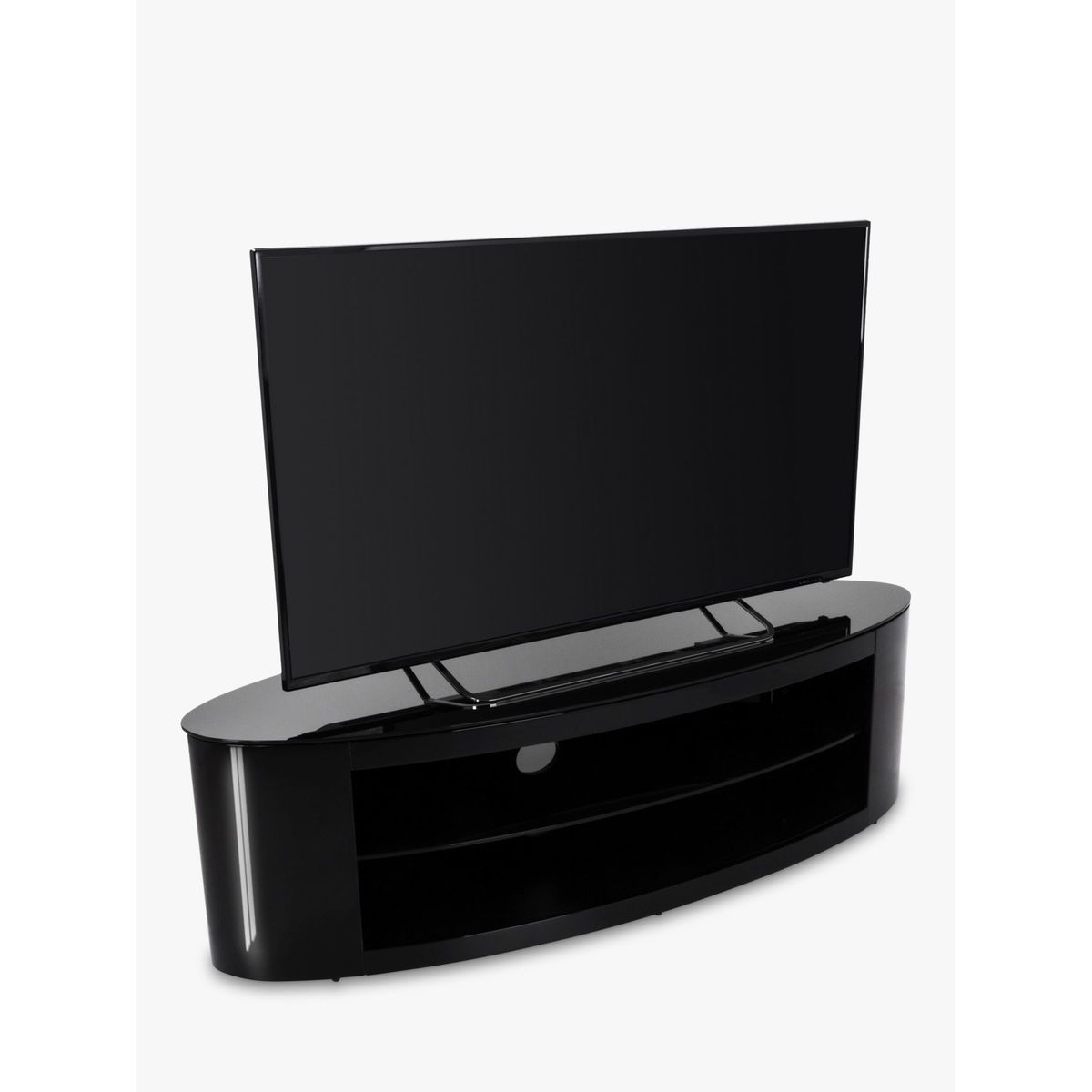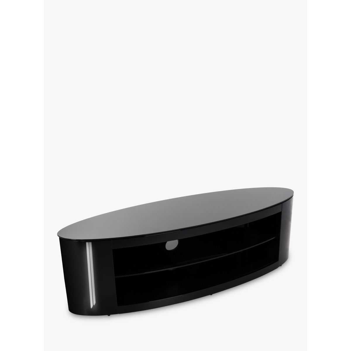 In a corner or flat against a wall, AVF's slick TV stand will be a seamless addition to living room. With its curvaceous oval shape, shiny black finish and versatile storage options, this is sure to make your home entertainment system sparkle. The Buckingham 1400 is easy-to-assemble too, so you'll have it set-up in no time. Sturdy Build Made of rock-solid wood veneer and black tempered glass, this open-shelf stand will give the support your TV and AV equipment needs. The top shelf can take a maximum weight of 60kg, while the two lower shelves can take 15kg each. This way, you'll have plenty of space to store your set top boxes, DVD players and games consoles. Versatile Storage No household's set-up is the same, so AVF have the made the central glass storage shelf adjustable to three heights. Just choose which height you'd like as you assemble it, or tinker with it as you go. Clean Cable Management There are two holes in the back of the stand to thread wires through. This way, you won't mar this sleek and stylish look with stray cables. Please note: Any maximum TV size quoted is a recommendation only and the exact dimensions of the TV's pedestal/feet should be checked to ensure it fits prior to purchase.