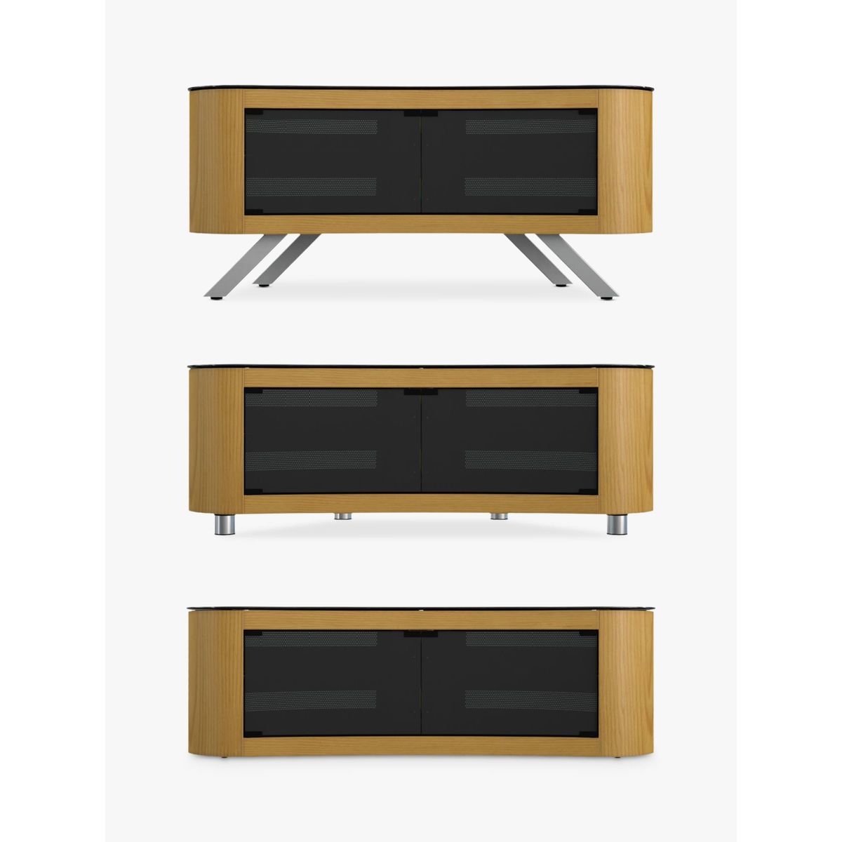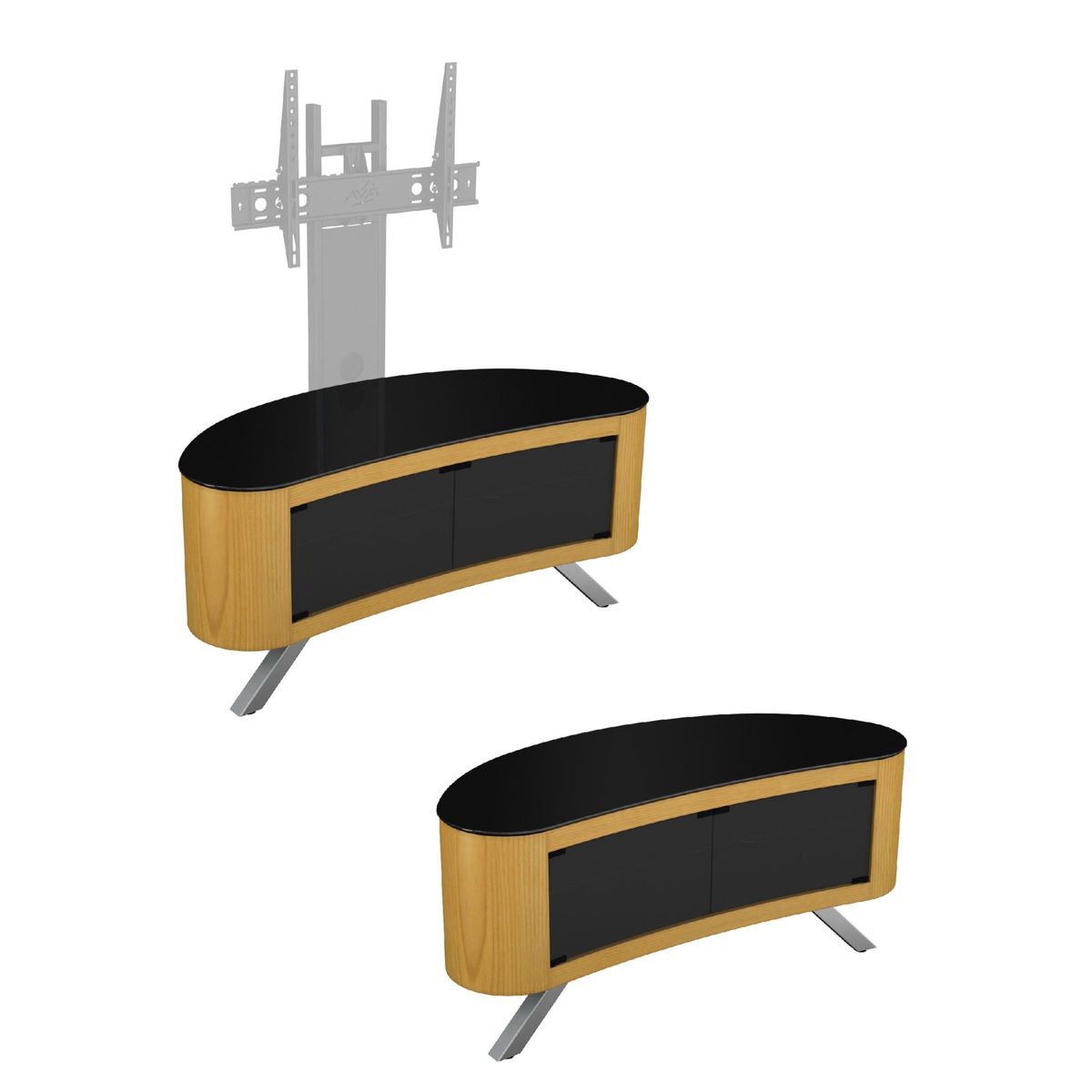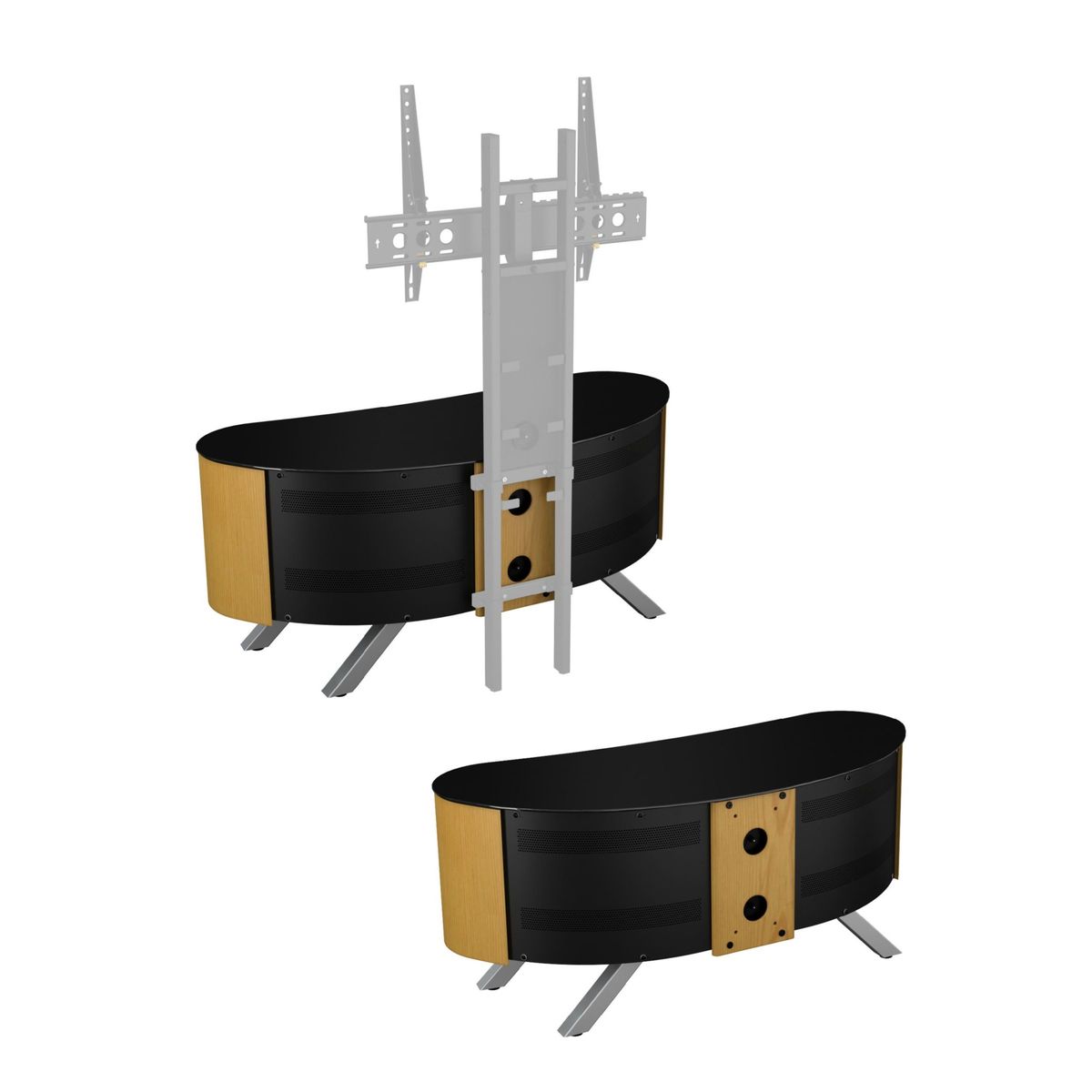 AVF's sleek TV stand has a unique, curved shape that's perfect for placing in corners or flat against walls. The smooth concave to the front perfectly complements curved TVs, but works just as well with flat screens. Solid & Sleek Build Beside its polished and elegant look, this stand is made of sturdy wood veneer with a 55kg maximum TV weight, giving stiff support for your TV. The two lower shelves can hold 15kg each too. This way, you'll store all of your AV equipment like set-top boxes, games consoles and DVD players with absolute security. Affinity Premium Back Panel The specially designed back panel lets you attach the AVF Mounting Column (sold separately) to the back and suspend your TV above the stand. This way, you'll get more space without having to drill into the wall. Match It To Your Living Room By tinkering with the included support legs, you'll have three height options to help you get the best viewing angle. Furthermore, it comes with a column that you can easily attach to the back and securely mount your TV above the stand (FL602KI. T mount required, sold separately). If you choose to leave the column out, you'll have a nifty cable management gap at the back to feed wires through and hide them from sight. The decision is yours. Practical Storage There are several storage options so you can get the best from your accessories, including fully closed with remote-friendly glass doors, open fronted or fully open. Please note: Any maximum TV size quoted is a recommendation only and the exact dimensions of the TV's pedestal/feet should be checked to ensure it fits prior to purchase.