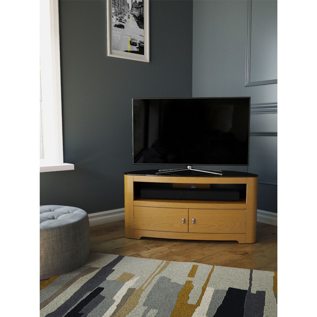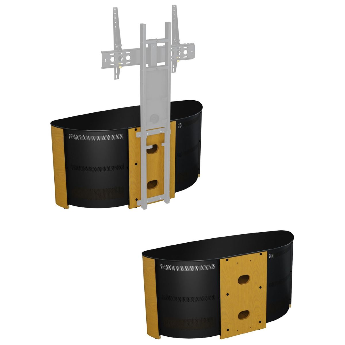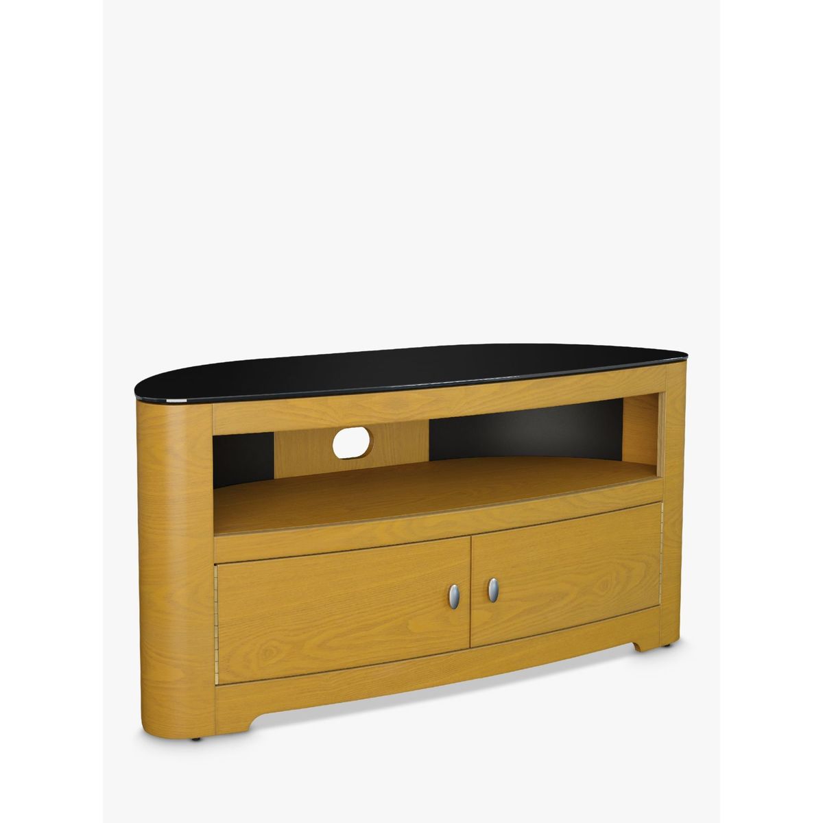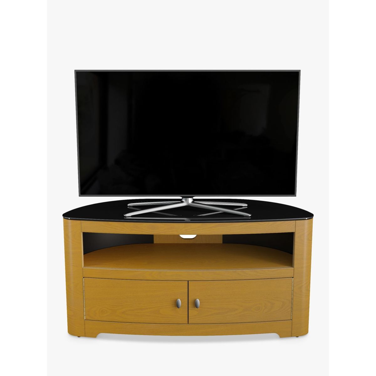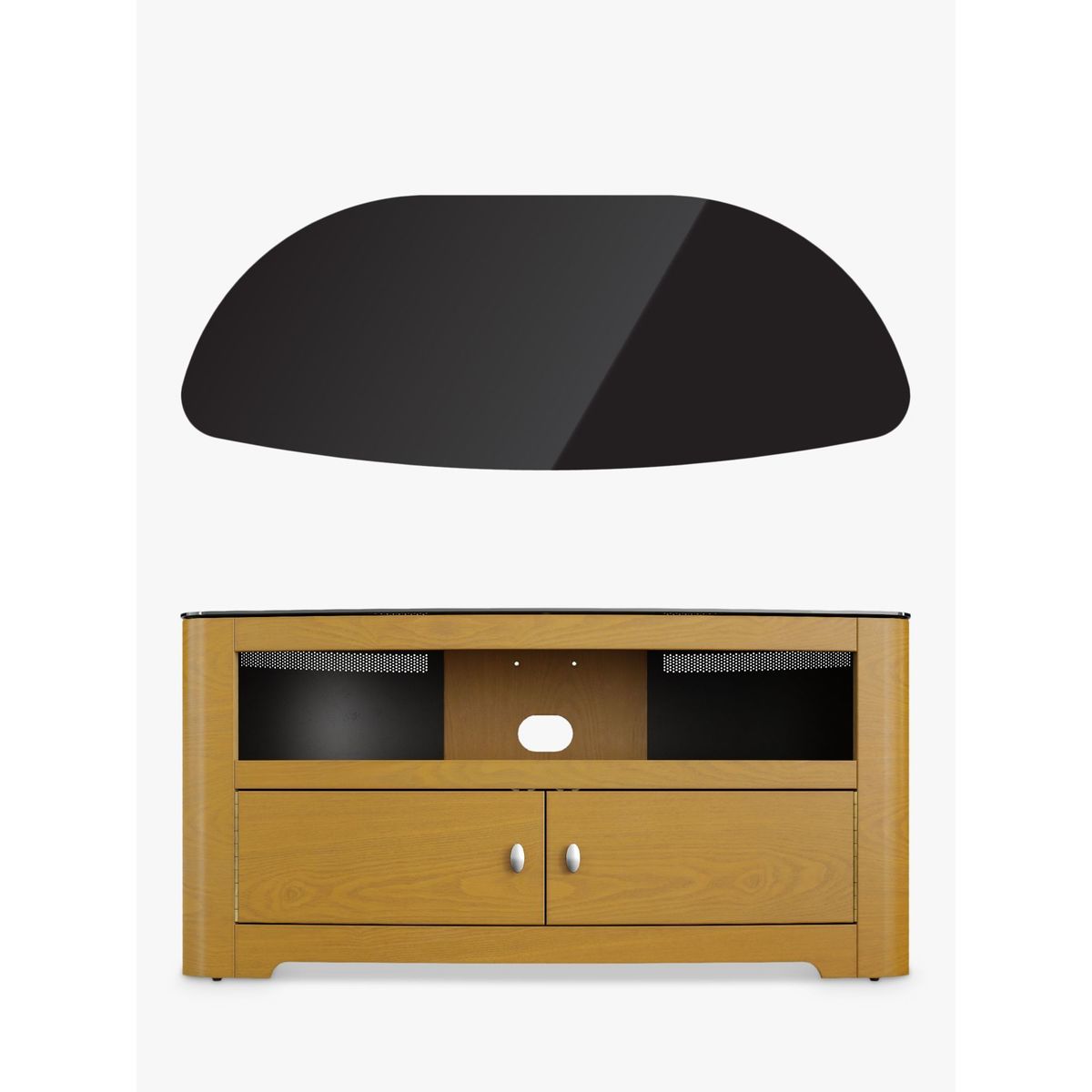 In a corner or flat against a wall, AVF's slick TV stand will be a seamless addition to living room. With its curvaceous oval shape, shiny finish and versatile storage options, this is sure to make your home entertainment system sparkle. The Affinity Premium Blenheim 1100 is easy-to-assemble too, so you'll have it set-up in no time. Affinity Premium Back Panel. The metal back panel lets you attach the AVF Mounting Column (sold separately) to the back and suspend your TV above the stand. This way, you'll get more space without having to drill into the wall. Also, as this back panel is well-ventilated, your kit will keep cool and audio from the likes of sound bars can circulate freely. Sturdy Build Made of rock-solid wood veneer and black tempered glass, this stand will give the support your TV and AV equipment needs. The top shelf can take a maximum weight of 55kg, while the two lower shelves can take 25kg each. This way, you'll have plenty of space to store your set top boxes, DVD players and games consoles. Versatile Storage With an open shelf and cabinet, you can decide what kit is on show. The double-door cabinet features 180 degree opening, giving clean and complete access to whatever you need. Clean Cable Management There is cable management available from the back. This way, you won't mar this sleek and stylish look with stray cables. Please note: Any maximum TV size quoted is a recommendation only and the exact dimensions of the TV's pedestal/feet should be checked to ensure it fits prior to purchase.
