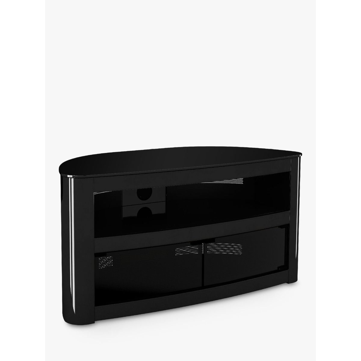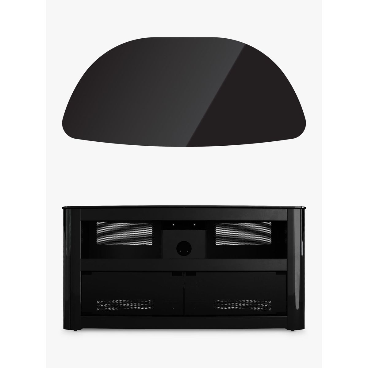 In a corner or flat against a wall, AVF’s slick TV stand will be a seamless addition to the living room. With its sleek half-moon shape, shiny finish and versatile storage options, this is sure to make your home entertainment system sparkle. Boosted by a ventilated metal back panel and a mounting column compatibility (sold separately), the Affinity Premium Burghley 1000 is an awesome storage option. Affinity Premium Back Panel The metal back panel lets you attach the (sold separately) to the back and suspend your TV above the stand. This way, you'll get more space without having to drill into the wall. Also, as this back panel is well-ventilated, your kit will keep cool and audio from the likes of sound bars can circulate freely. Sturdy Build Made of rock-solid wood veneer and black tempered glass, this open-shelf stand will give the support your TV and AV equipment needs. The top shelf can take a maximum weight of 45kg, while the two lower shelves can take 15kg each. This way, you’ll have plenty of space to store your set top boxes, DVD players and games consoles. Versatile Storage With both open-or-closed storage and remote-friendly safety glass, you'll keep your gear out of sight and still be able to operate it. Clean Cable Management Cable management is provided through the back. This way, you won’t mar this sleek and stylish look with stray cables. Please note : Any maximum TV size quoted is a recommendation only and the exact dimensions of the TV's pedestal/feet should be checked to ensure it fits prior to purchase.