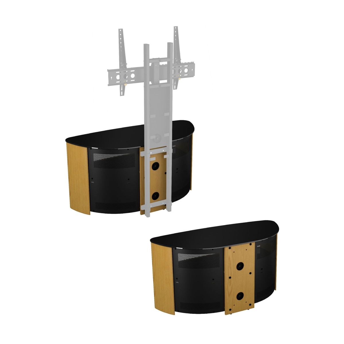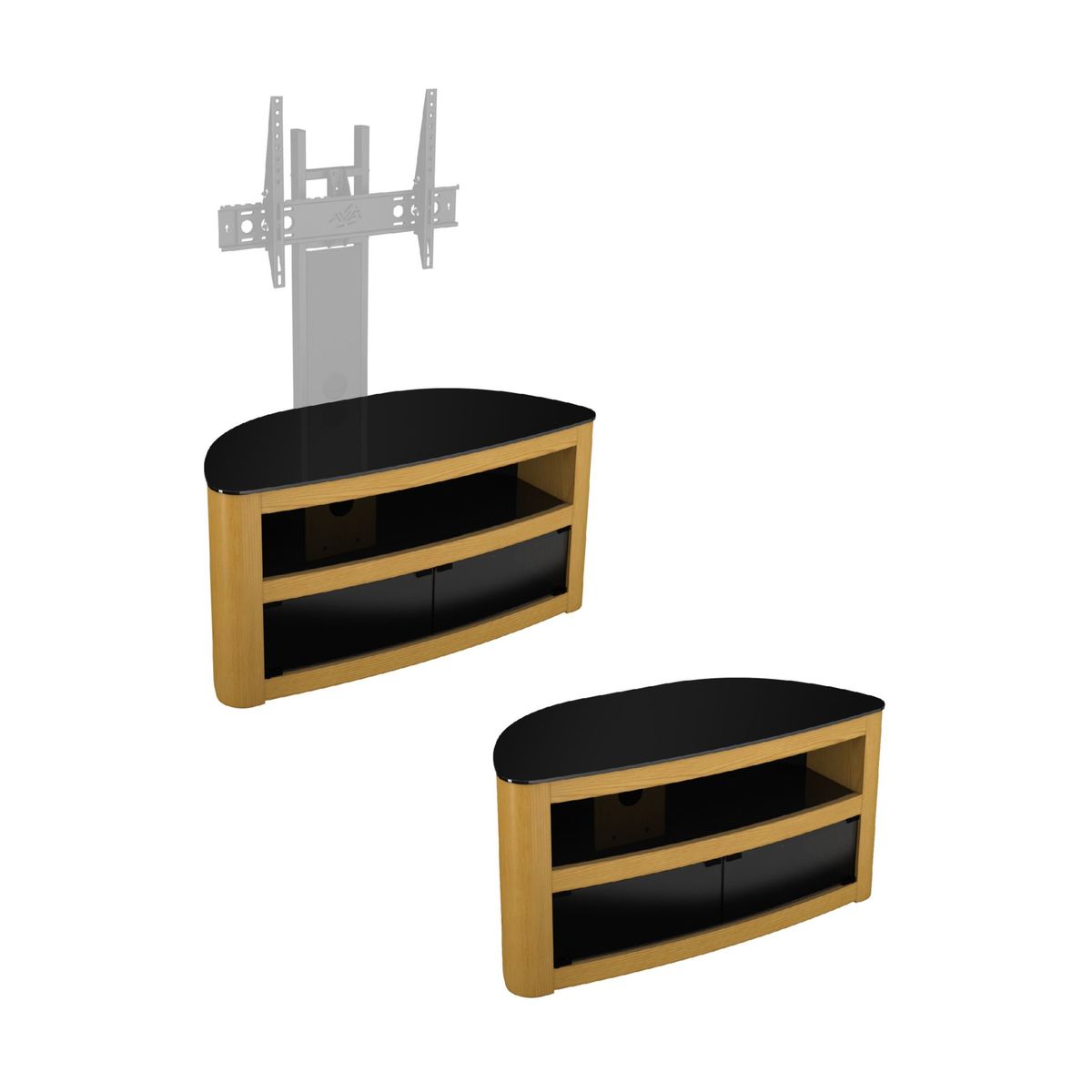 In a corner or flat against a wall, AVF's slick TV stand will be a seamless addition to the living room. With its sleek half-moon shape, shiny finish and versatile storage options, this is sure to make your home entertainment system sparkle. Boosted by a ventilated metal back panel and a mounting column compatibility (sold separately), the Affinity Premium Burghley 1000 is an awesome storage option. Affinity Premium Back Panel. The metal back panel lets you attach the AVF Mounting Column (sold separately) to the back and suspend your TV above the stand. This way, you'll get more space without having to drill into the wall. Also, as this back panel is well-ventilated, your kit will keep cool and audio from the likes of sound bars can circulate freely. Sturdy Build. Made of rock-solid wood veneer and black tempered glass, this open-shelf stand will give the support your TV and AV equipment needs. The top shelf can take a maximum weight of 45kg, while the two lower shelves can take 15kg each. This way, you'll have plenty of space to store your set top boxes, DVD players and games consoles. Versatile Storage. With both open-or-closed storage and remote-friendly safety glass, you'll keep your gear out of sight and still be able to operate it. Clean Cable Management Cable management is provided through the back. This way, you won't mar this sleek and stylish look with stray cables. Please note: Any maximum TV size quoted is a recommendation only and the exact dimensions of the TV's pedestal/feet should be checked to ensure it fits prior to purchase.