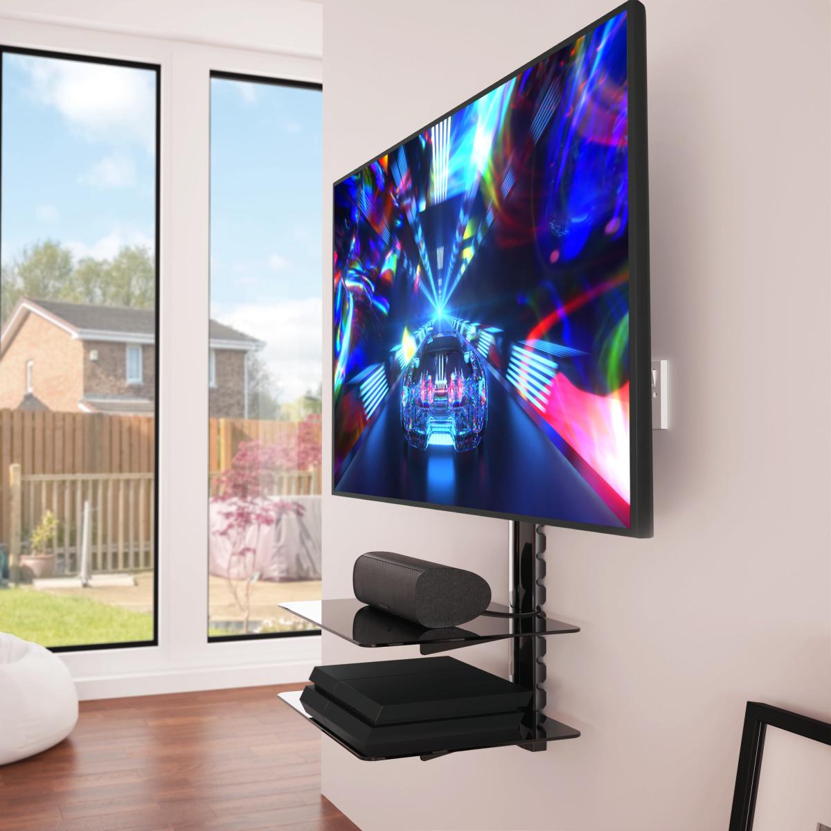 I’m a big fan of this all-in-one mount for its clean, pared-back look and cable-management column - it suits contemporary, Scandinavian or industrial schemes equally well. The matt-black finish creates a sharp contrast on pale walls or exposed brick, while the integrated shelves are ideal for a streaming box, soundbar or a few curated books. For styling, keep the surrounding area uncluttered: hang slim-framed prints or photos at eye level either side to balance the screen, and place a low console or bench beneath in a complementary material (think pale wood or metal). Tuck cables discreetly into the column, and add a small plant or sculptural object on one shelf to soften the tech-heavy feel.