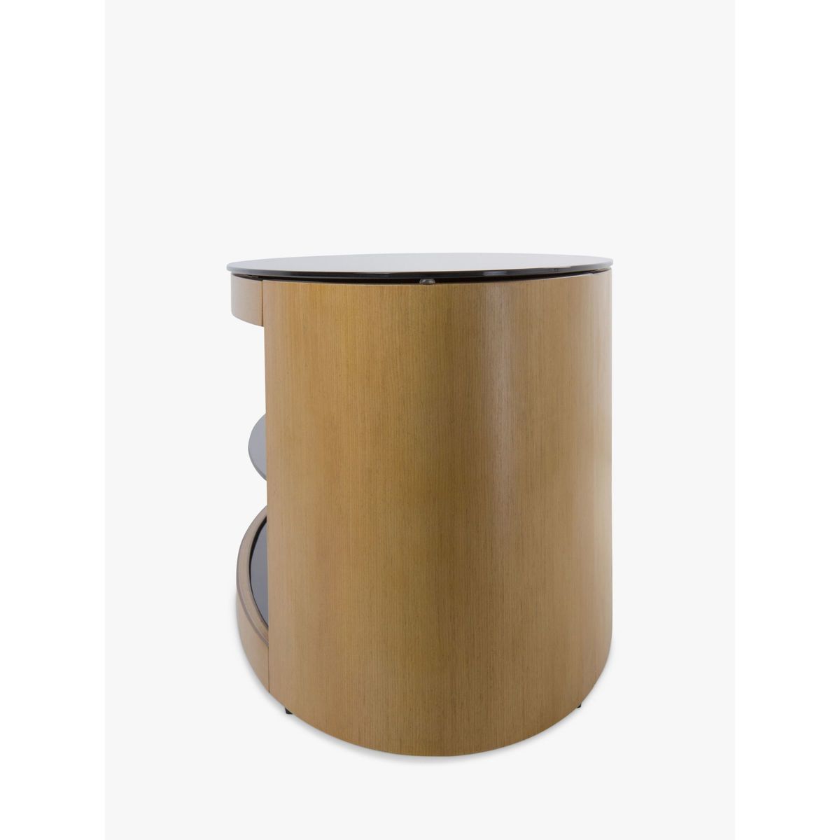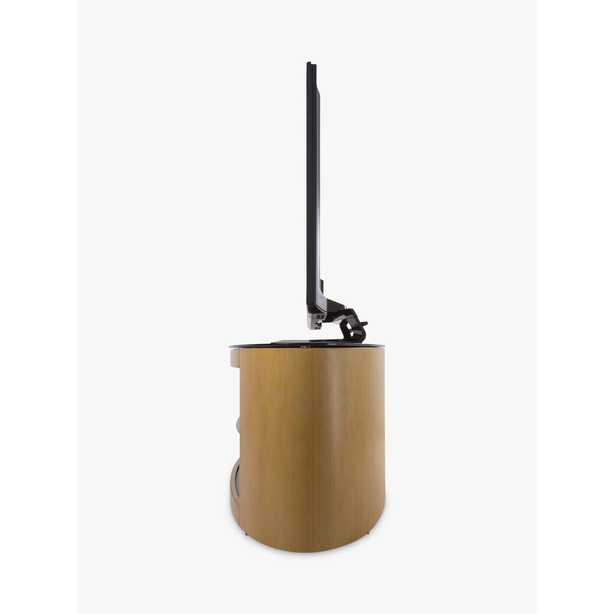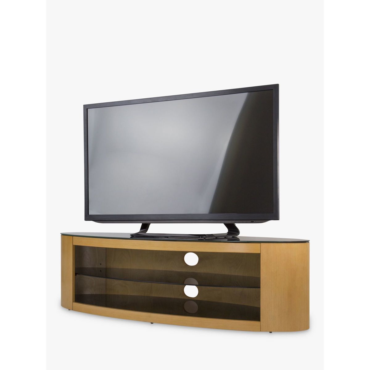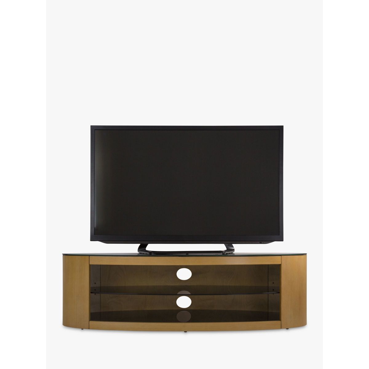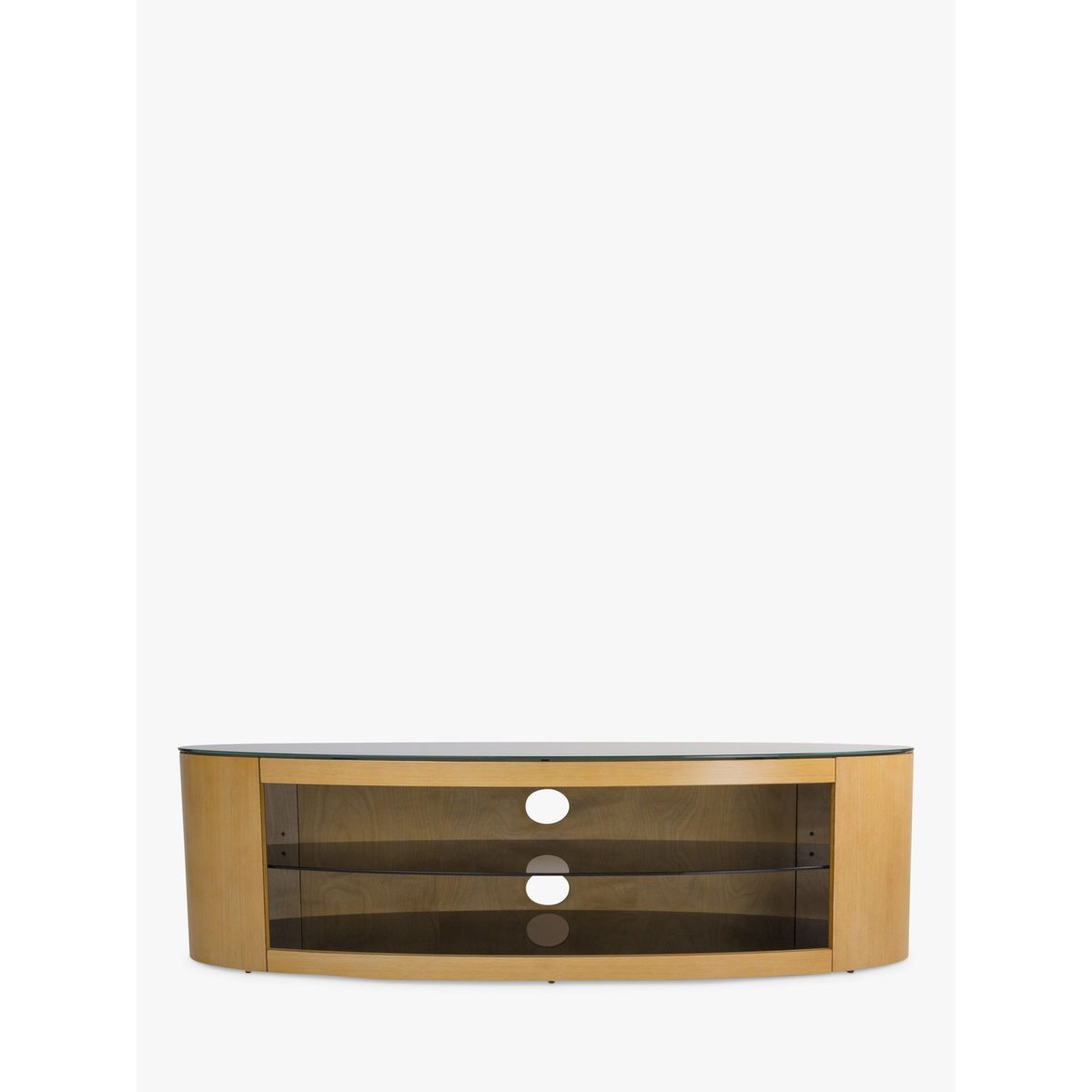 The AVF Buckingham 1400 TV stand completes any space with its unique oval design and modern feel. Its rounded back makes it ideal for corner positioning, and its sleek design helps to keep unsightly cables out of the way. Key features: This open shelf TV stand, in wood veneer and black glass, features a full width back panel and is perfect for positioning in the corner or flat to the wall. This cabinet has been safety glass tested to British Standard 6202a for your peace of mind. Cable management is provided to route TV and accessory cables. Easy to assemble. Please note : Any maximum TV size quoted is a recommendation only and the exact dimensions of the TV's pedestal/feet should be checked to ensure it fits prior to purchase.