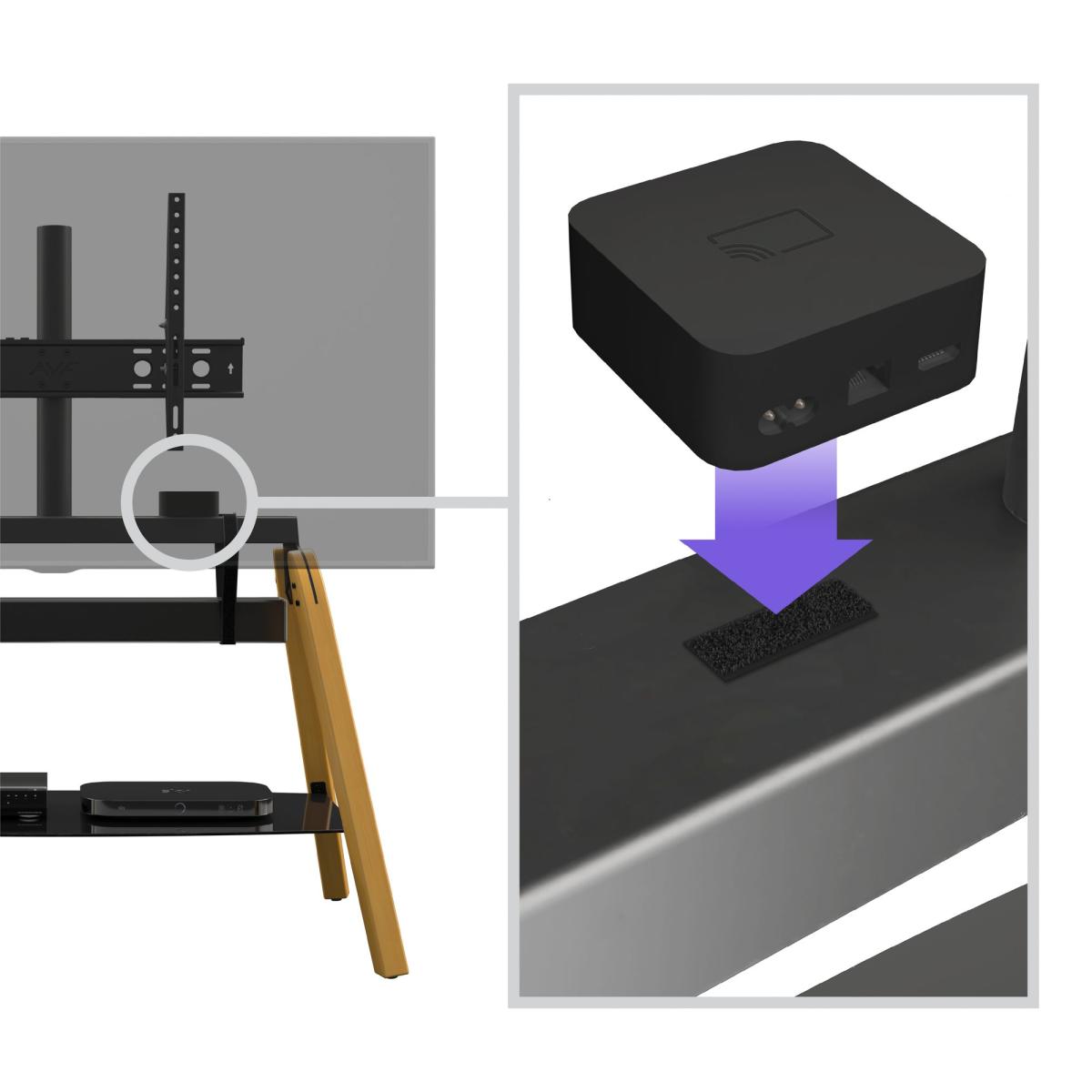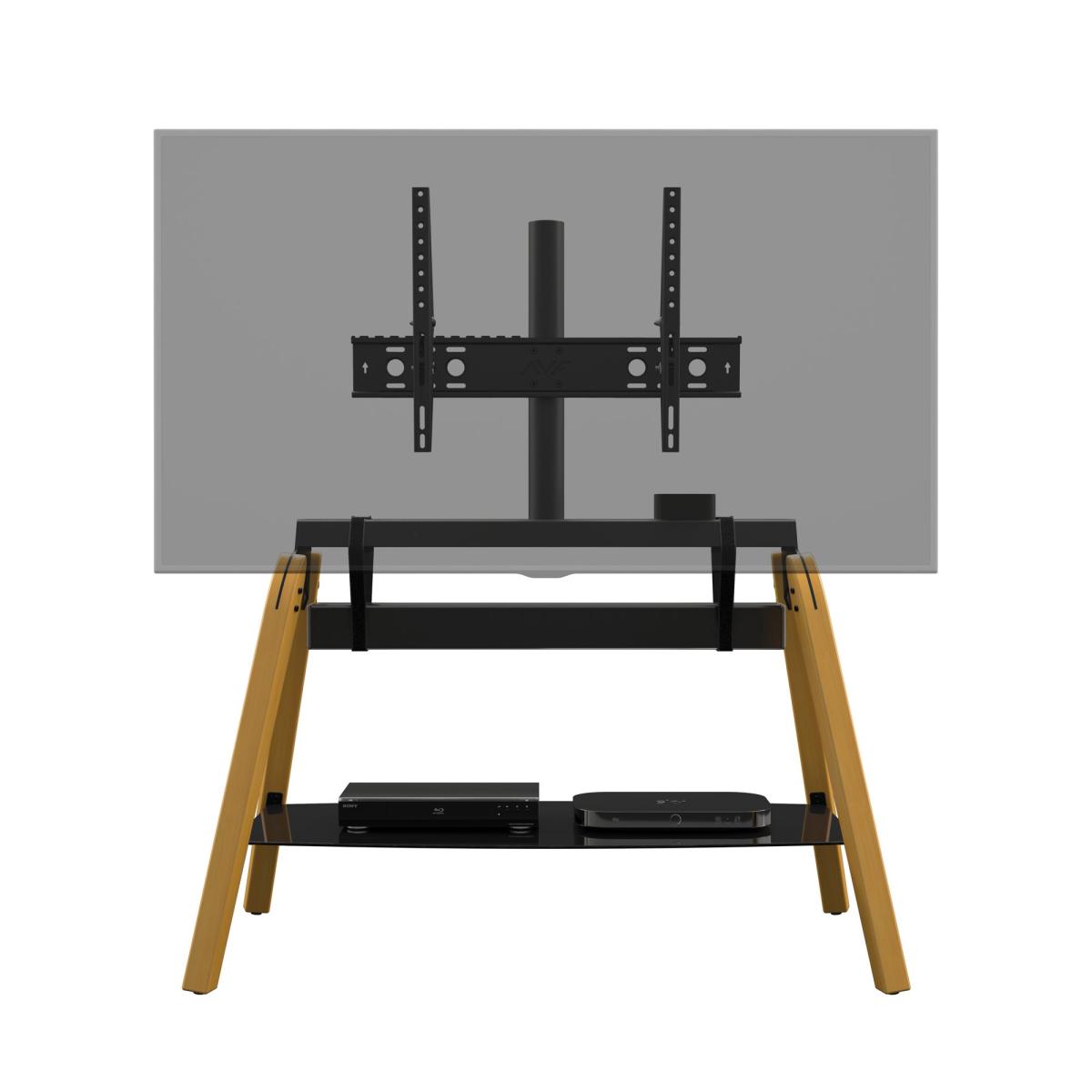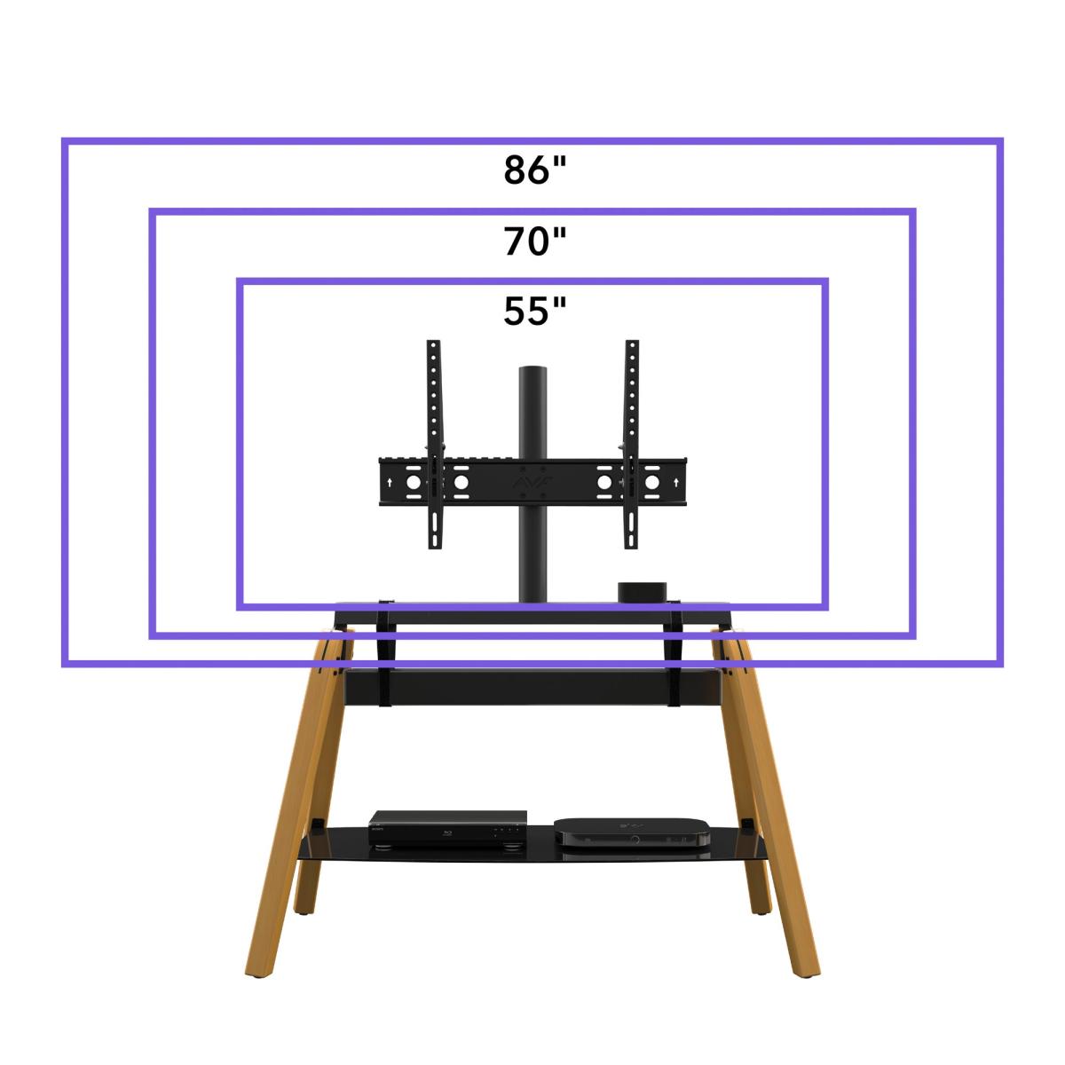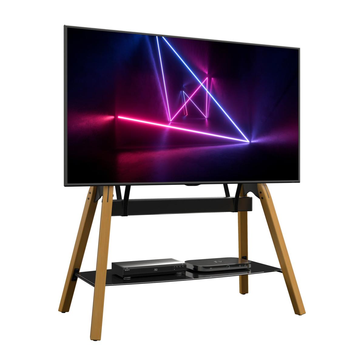 * Suitable for TVs from 32-86” * Free-standing * Height adjustable * 15 degree tilt * Straps included for sound bar A modern TV stand with serious presence, the Hoxton quad supports screens from 32" to 86" (up to 50kg). With height adjustment and 15° tilt, it's easy to find the perfect viewing setup. A built-in strap allows you to suspend your soundbar neatly under the screen, while a discreet shelf and cable clips keep your space organised.
