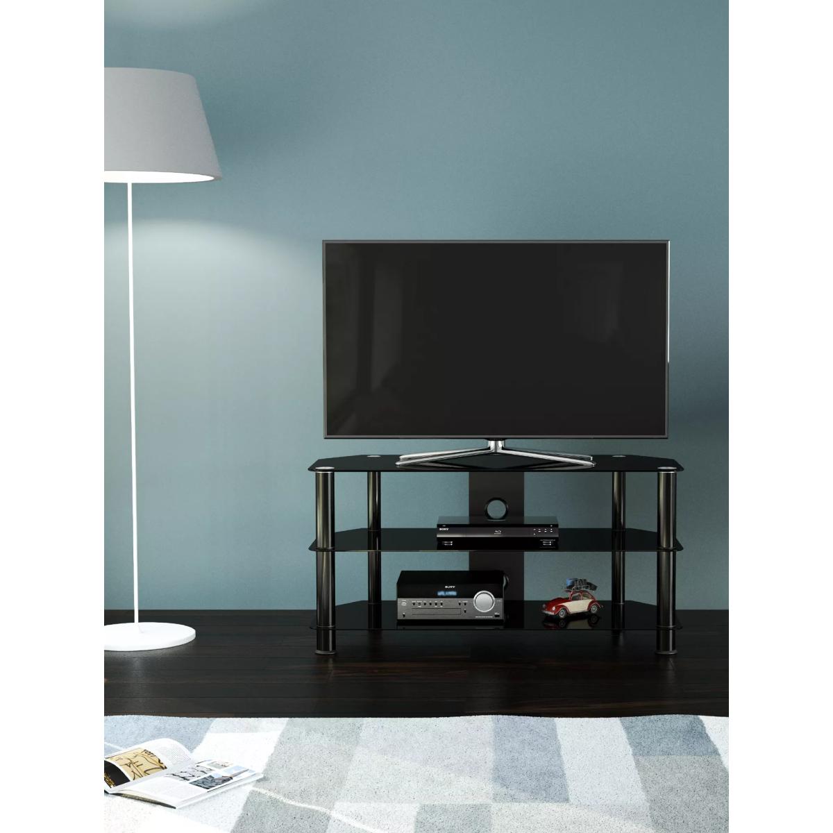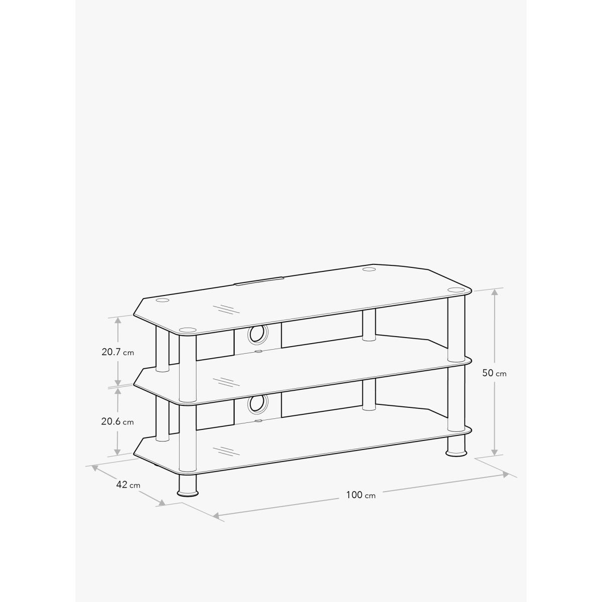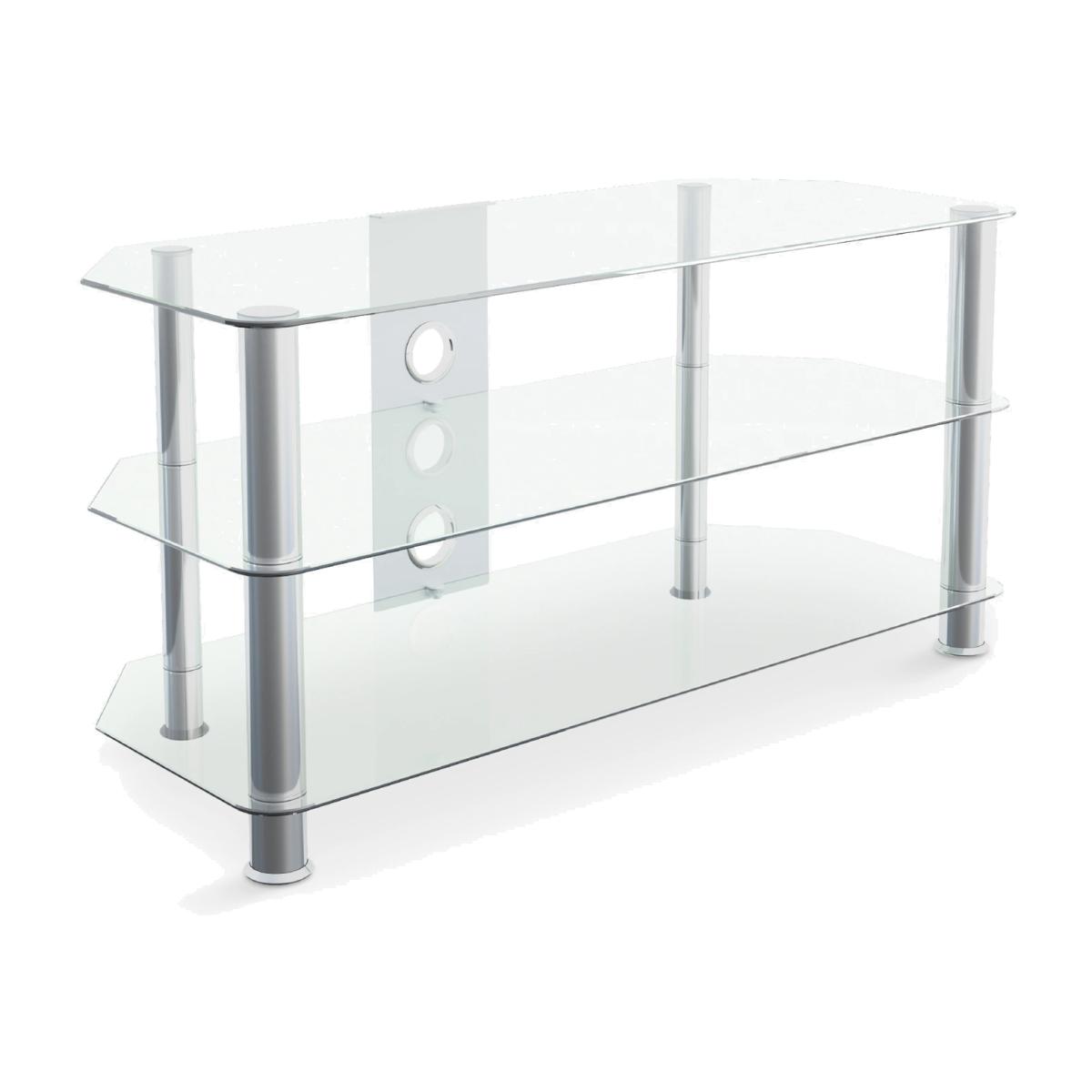 Easy to construct, this versatile home entertainment unit has contemporary styling. Clear, tempered safety glass and durable stainless steel legs bring a modernity to any interior, while angled corners save space by making it ideal for the corner of the room. Two lower shelves offer ample room for your media players and AV equipment, and the built-in cable management column at the rear keeps unsightly wires out of view. Features an open-back design and is perfect for corners Cable management features keep wires neatly out of sight Easy to assemble Any maximum TV size quoted is a recommendation only and the exact dimensions of the TV's pedestal/feet should be checked to ensure it fits prior to purchase.