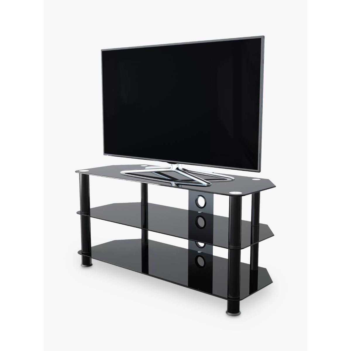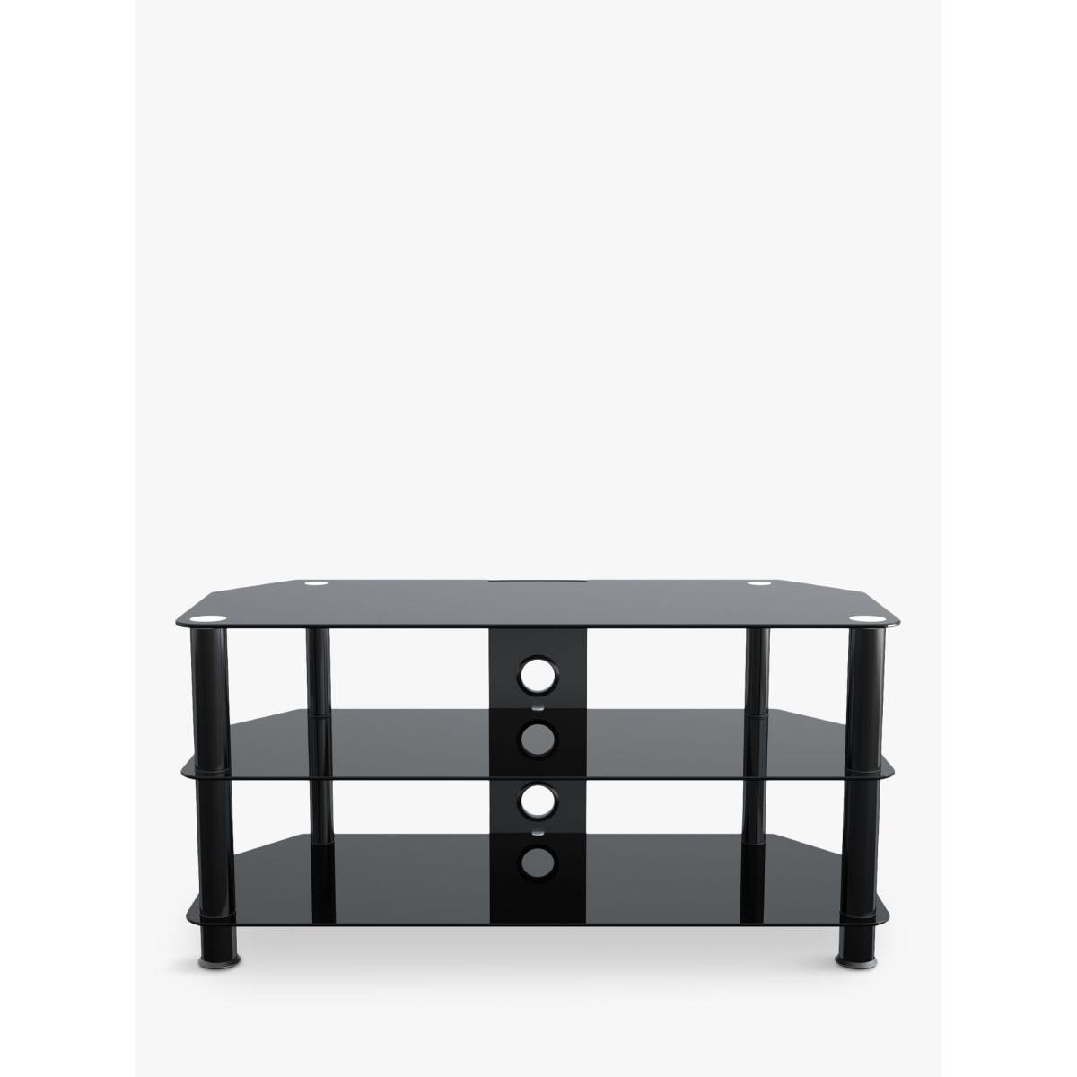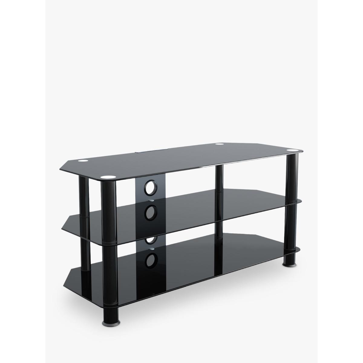 Easy to construct, this versatile home entertainment unit has contemporary styling. Clear, tempered safety glass and durable stainless steel legs bring a modernity to any interior, while angled corners save space by making it ideal for the corner of the room. Two lower shelves offer ample room for your media players and AV equipment, and the built-in cable management column at the rear keeps unsightly wires out of view. Features an open-back design and is perfect for corners Cable management features keep wires neatly out of sight Easy to assemble Any maximum TV size quoted is a recommendation only and the exact dimensions of the TV's pedestal/feet should be checked to ensure it fits prior to purchase.