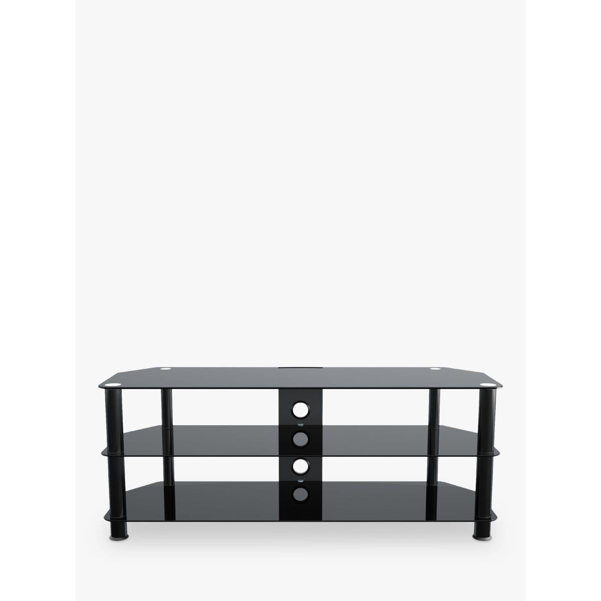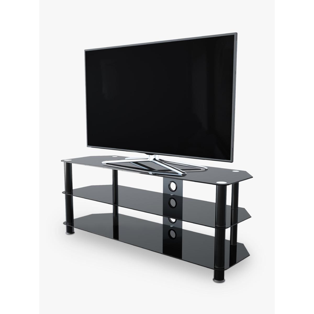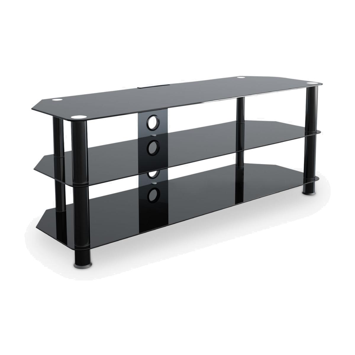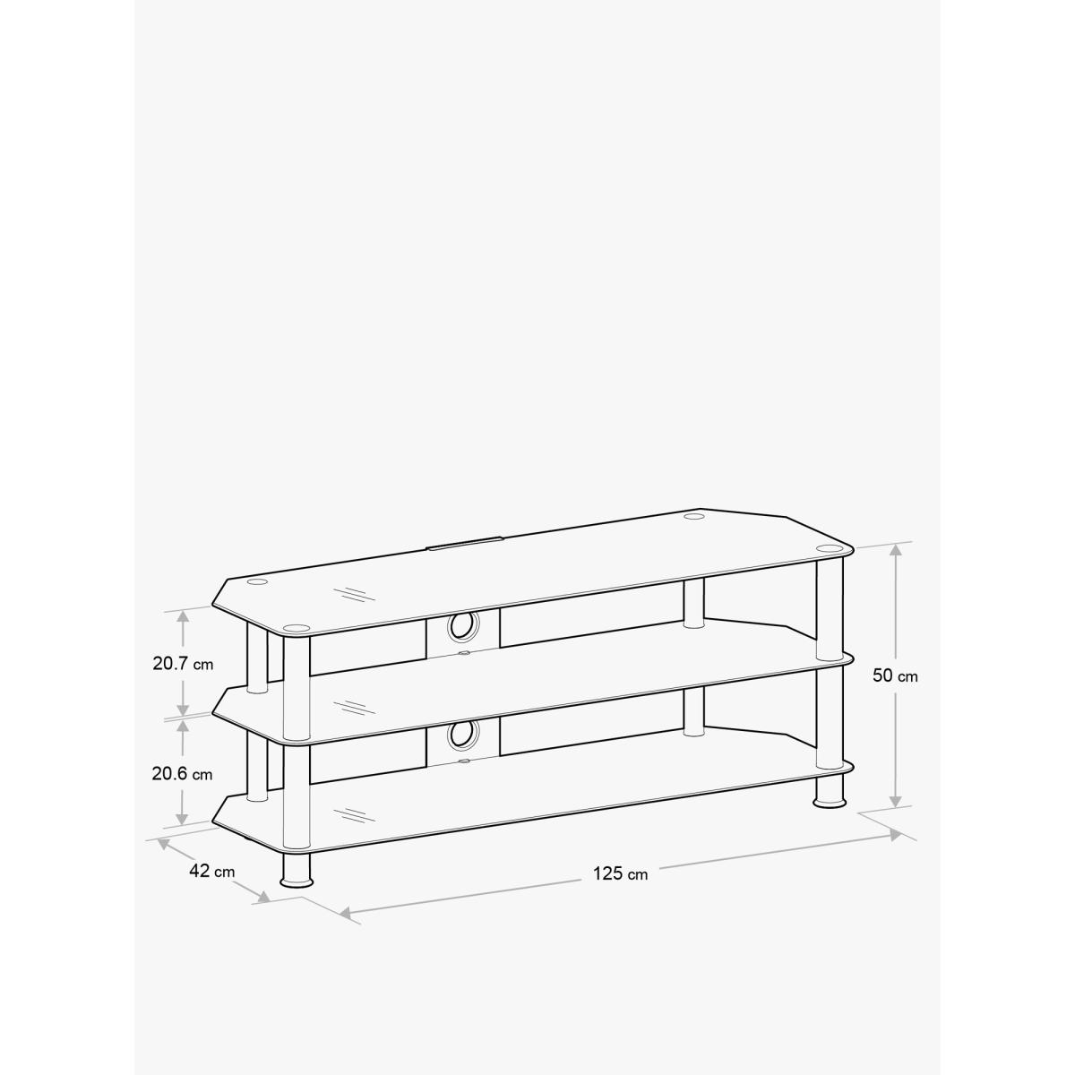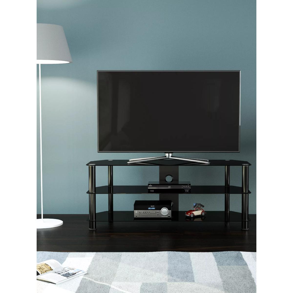 Easy to construct, this versatile home entertainment unit has contemporary styling. Clear, tempered safety glass and durable stainless steel legs bring a modernity to any interior, while angled corners save space by making it ideal for the corner of the room. Two lower shelves offer ample room for your media players and AV equipment, and the built-in cable management column at the rear keeps unsightly wires out of view. Features an open-back design and is perfect for corners Cable management features keep wires neatly out of sight Easy to assemble Any maximum TV size quoted is a recommendation only and the exact dimensions of the TV's pedestal/feet should be checked to ensure it fits prior to purchase.