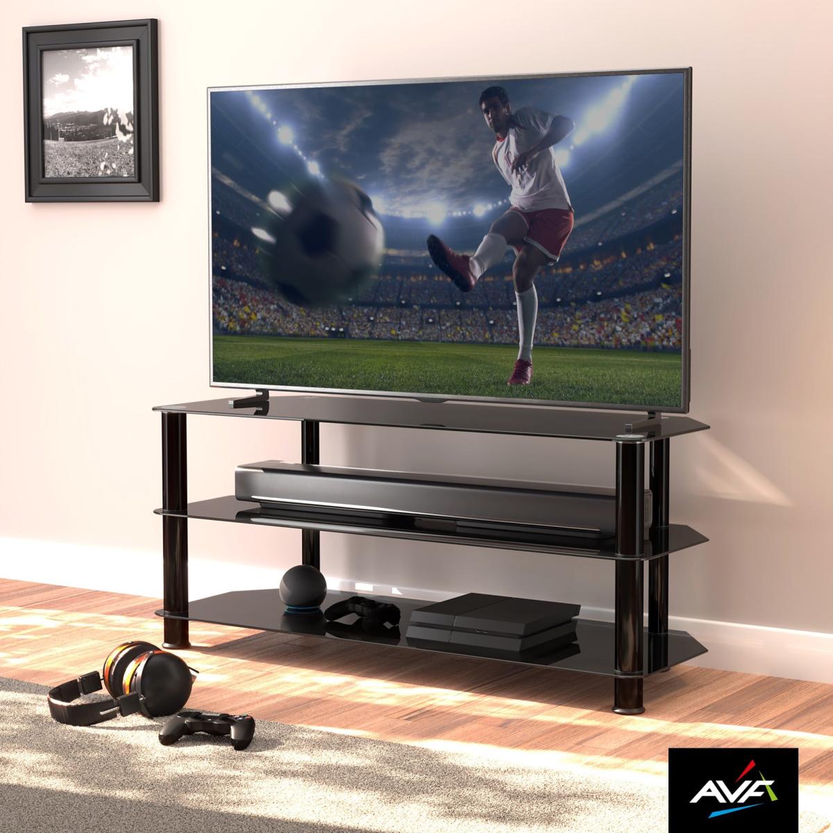 I love this black glass TV stand for its sleek and modern look, which adds a touch of sophistication to any living space. It works well in contemporary interiors, especially those with monochrome or minimalist themes, but can also provide a stylish contrast in more eclectic or traditional rooms. Practical styling tips include pairing it with other black or metallic accents to create a cohesive look, and adding some decorative vases or books on the shelves to bring warmth and personality. Its open design makes it easy to keep clean and allows for easy access to your media devices, making it as functional as it is stylish.
