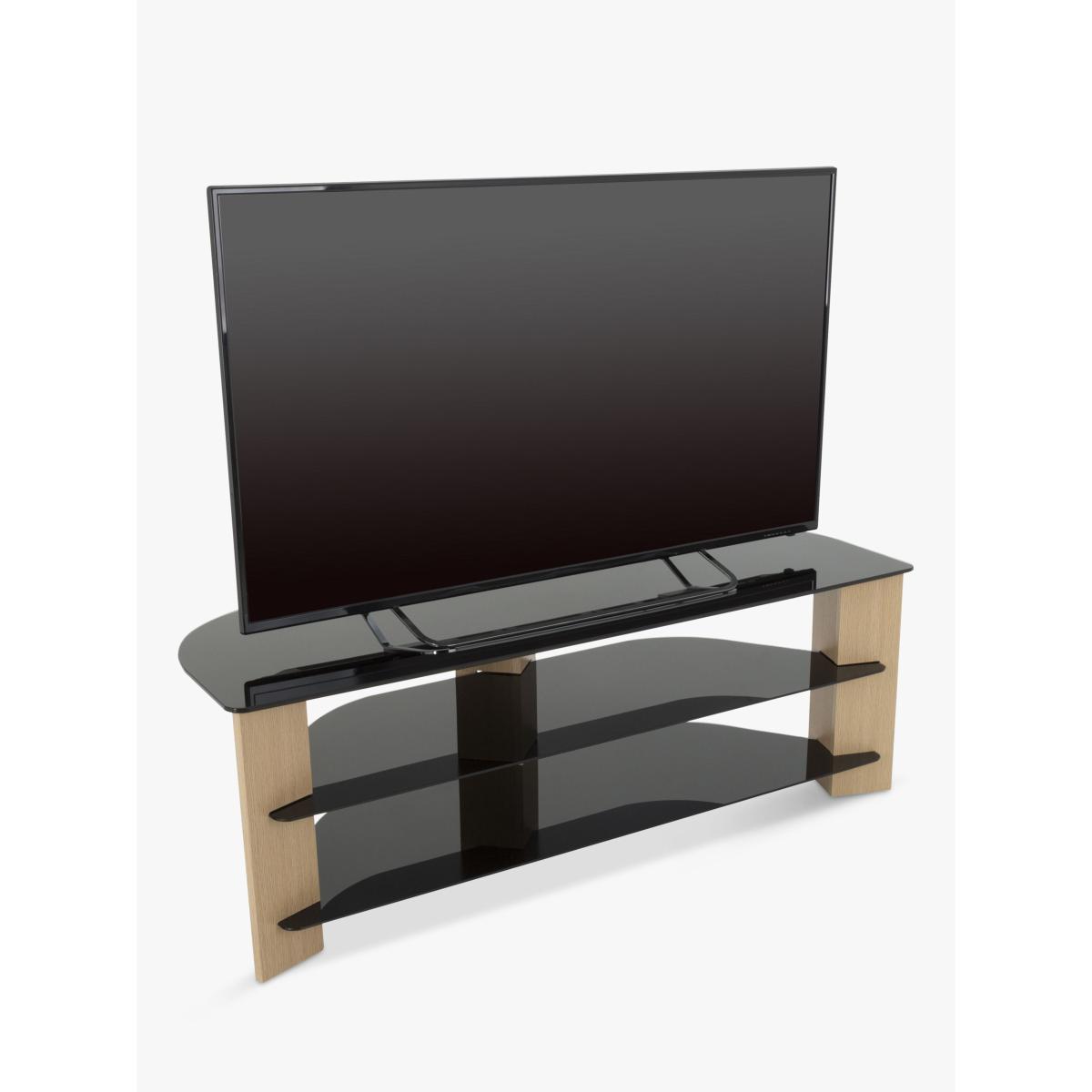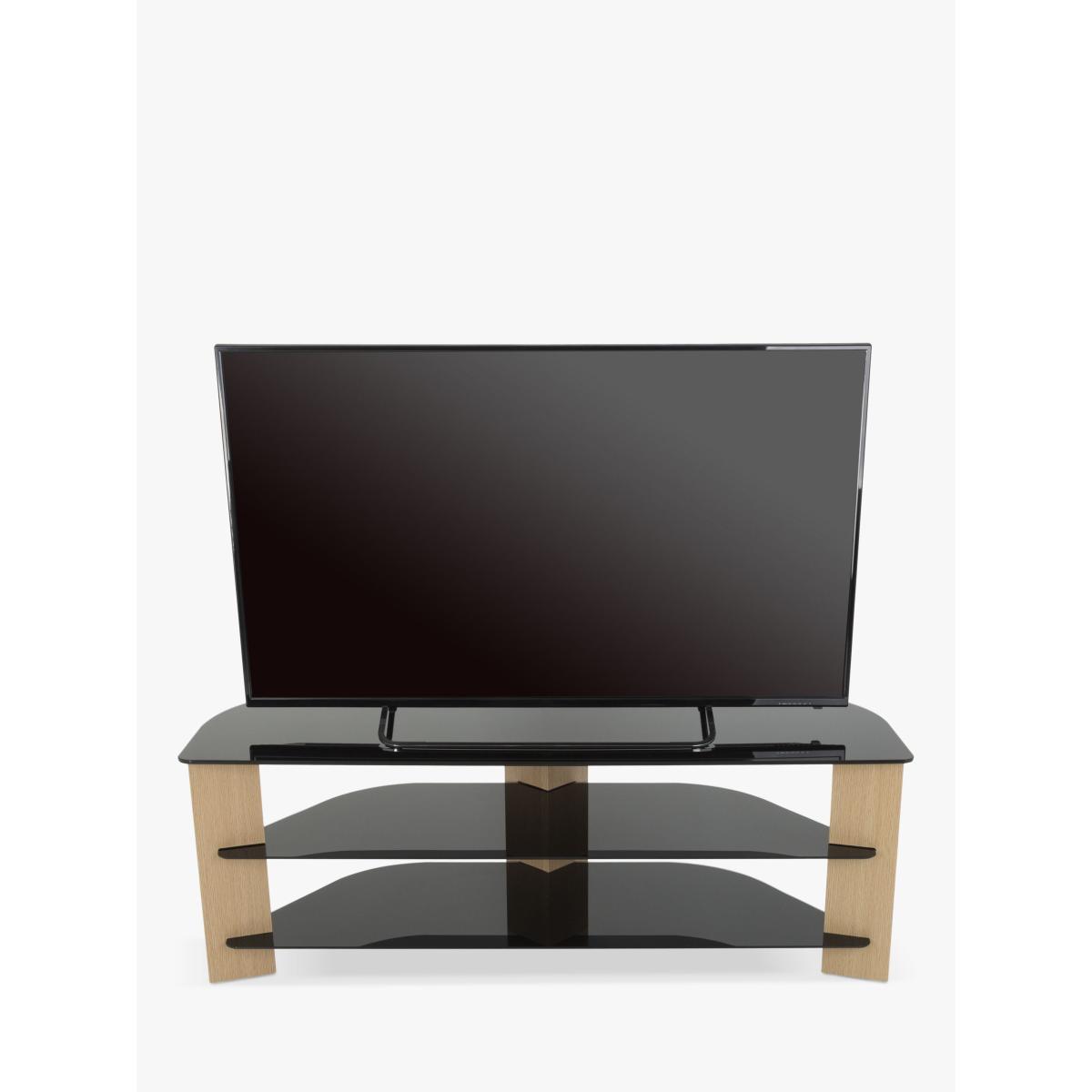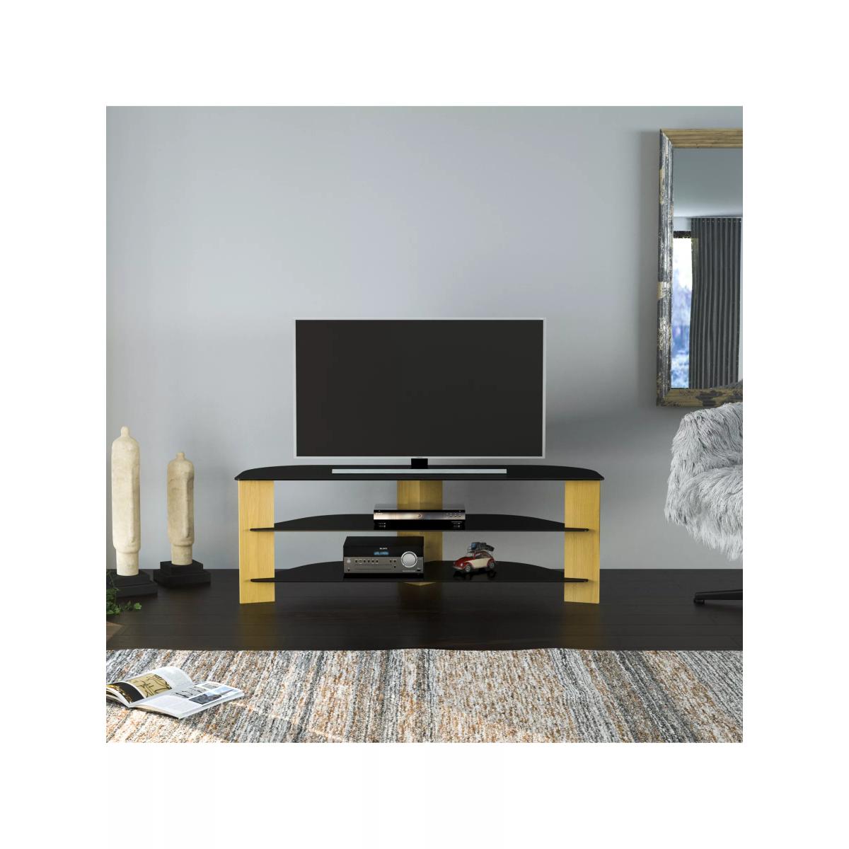With three beautiful glass shelves, the Varano 1300 gives you generous and easy access storage for all your home entertainment equipment. Its angled legs mean it fits just as well in a corner as flat against a wall. Two lower shelves ensure a large capacity for your receivers, media players and games consoles. Suitable for TVs up to 65", the top shelf supports weights up to 50kg, and its two lower shelves 10kg each. Fits in a corner or flat against a wall Black tempered safety glass top surface and lower shelving Cable management features keep wires neatly out of sight Easy to assemble Any maximum TV size quoted is a recommendation only and the exact dimensions of the TV's pedestal/feet should be checked to ensure it fits prior to purchase.