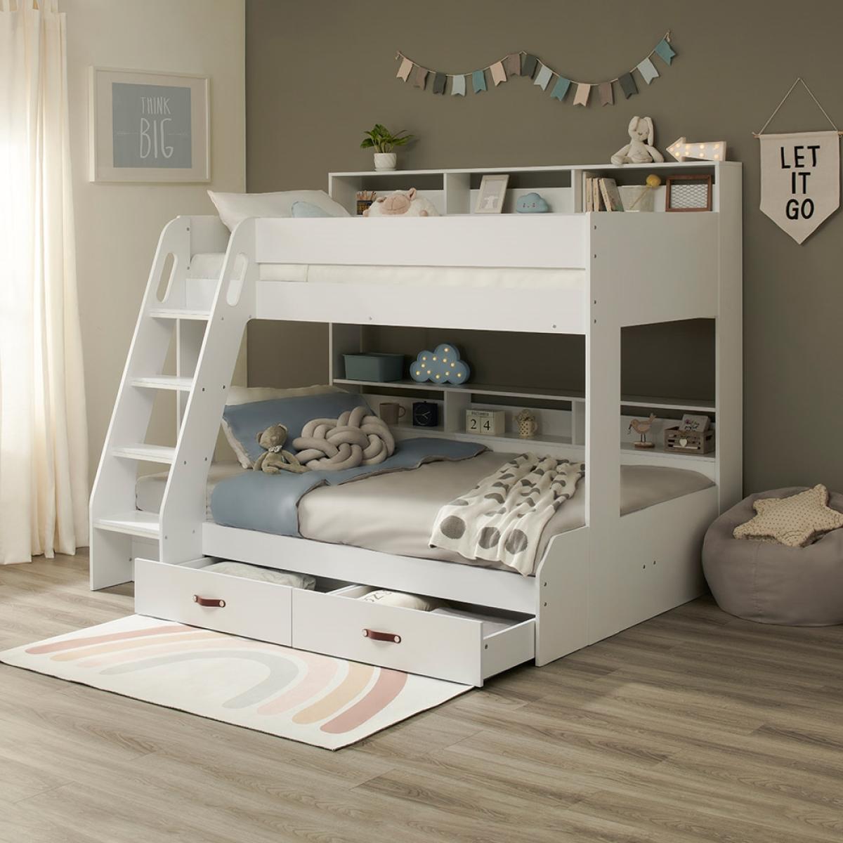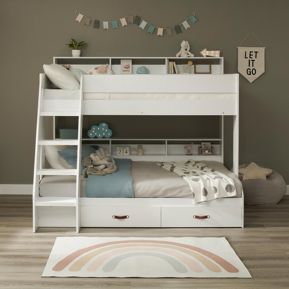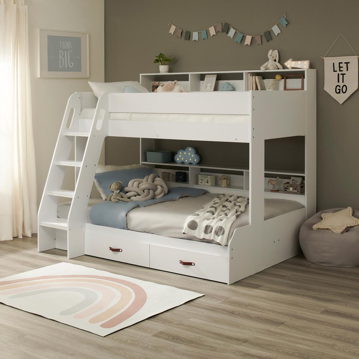 Bunk beds just got a major upgrade. Perfect for sharing kiddies, the. Aviary Triple Sleeper offers up plenty of storage for all of their bits and pieces! With shelving compartments alongside each bed, they can each personalise their space with their favourite books, trinkets and picture frames and keep everything neat and organised. They can even pop their alarm clock and water bottles nearby so they have everything they need! There's also two storage drawers below the bed, for extra bedding, toys and games to be hidden away. Featuring a slanted ladder with handles, whoever is lucky enough to get the top bunk, can safely and easily clamber up to to catch a few z's!Designed with a small double bed at the bottom, it's great for sleepovers too!.