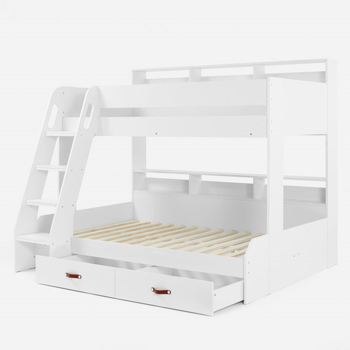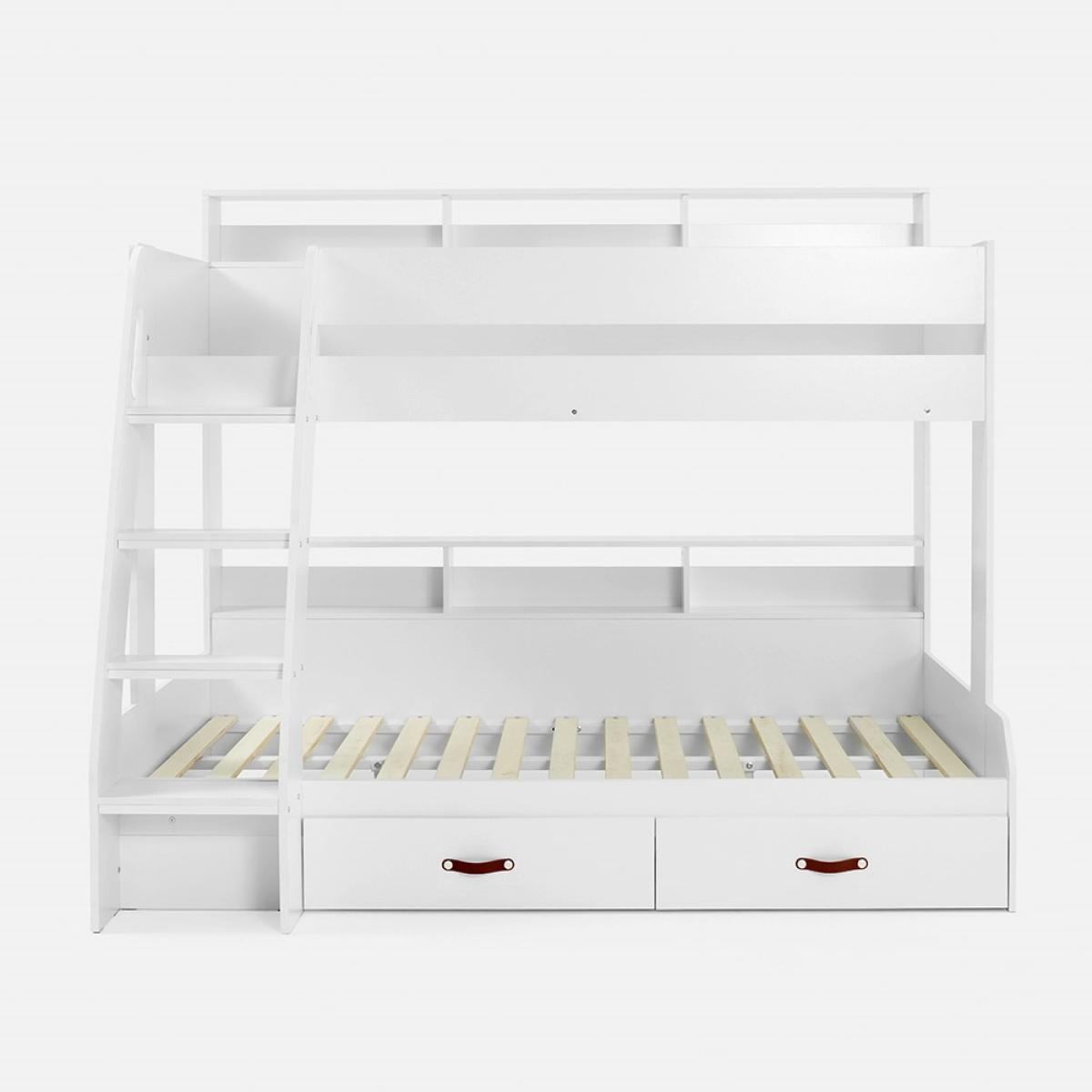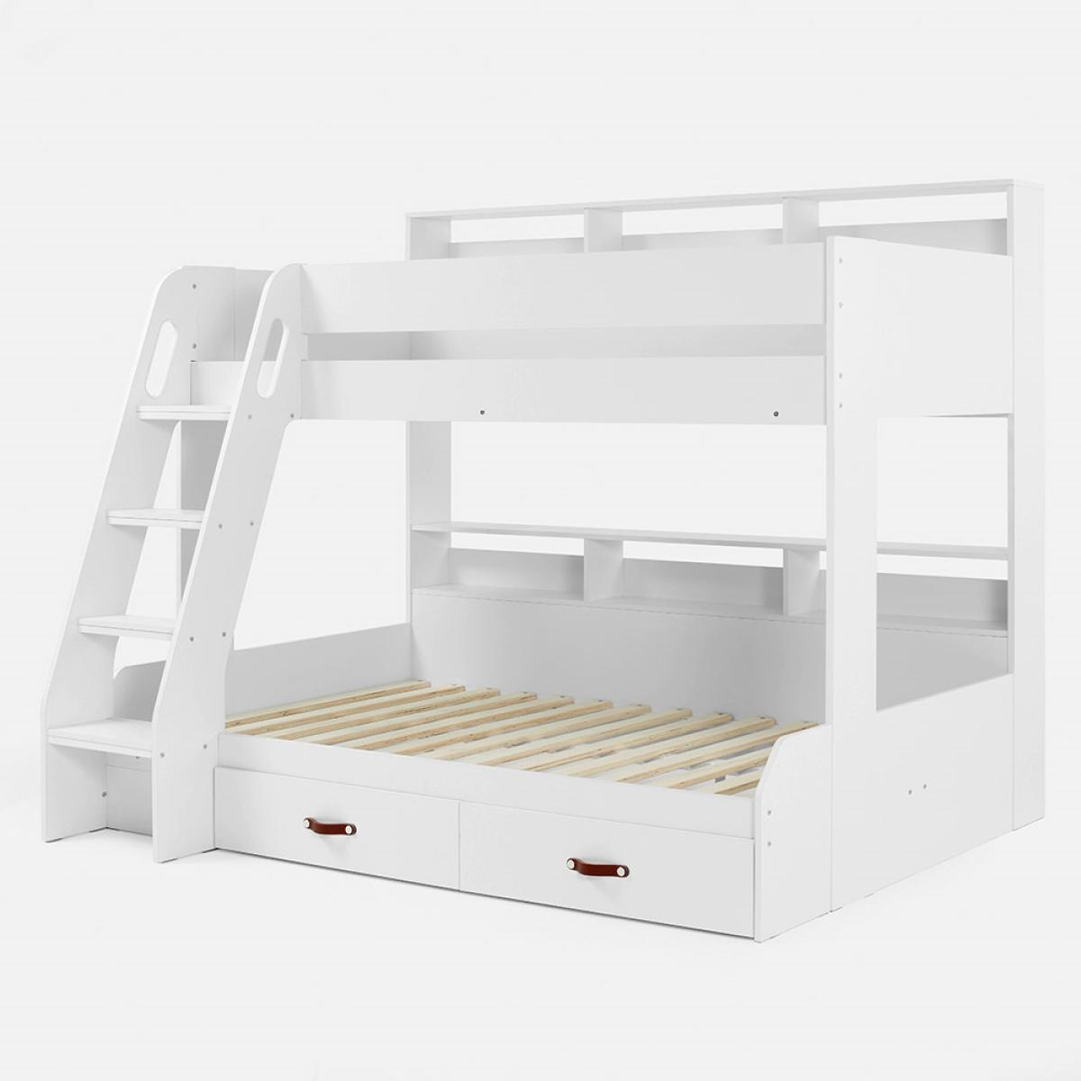 Bunk beds just got a major upgrade. Perfect for sharing kiddies, the. Aviary Triple Sleeper offers up plenty of storage for all of their bits and pieces! With shelving compartments alongside each bed, they can each personalise their space with their favourite books, trinkets and picture frames and keep everything neat and organised. They can even pop their alarm clock and water bottles nearby so they have everything they need! There's also two storage drawers below the bed, for extra bedding, toys and games to be hidden away. Featuring a slanted ladder with handles, whoever is lucky enough to get the top bunk, can safely and easily clamber up to to catch a few z's!Designed with a small double bed at the bottom, it's great for sleepovers too!.