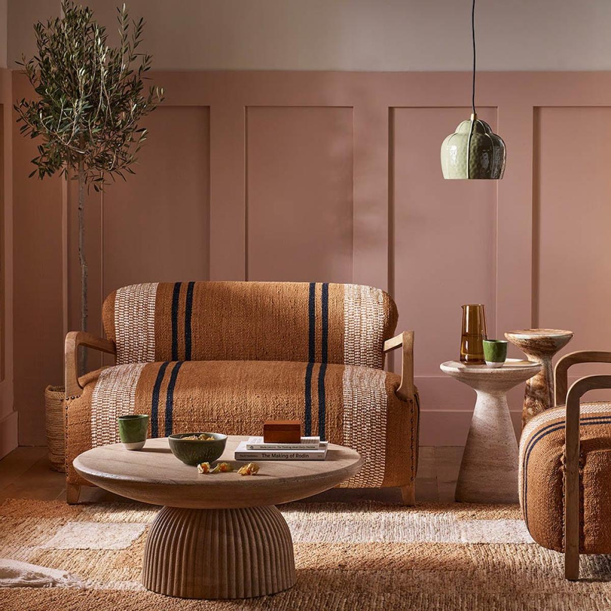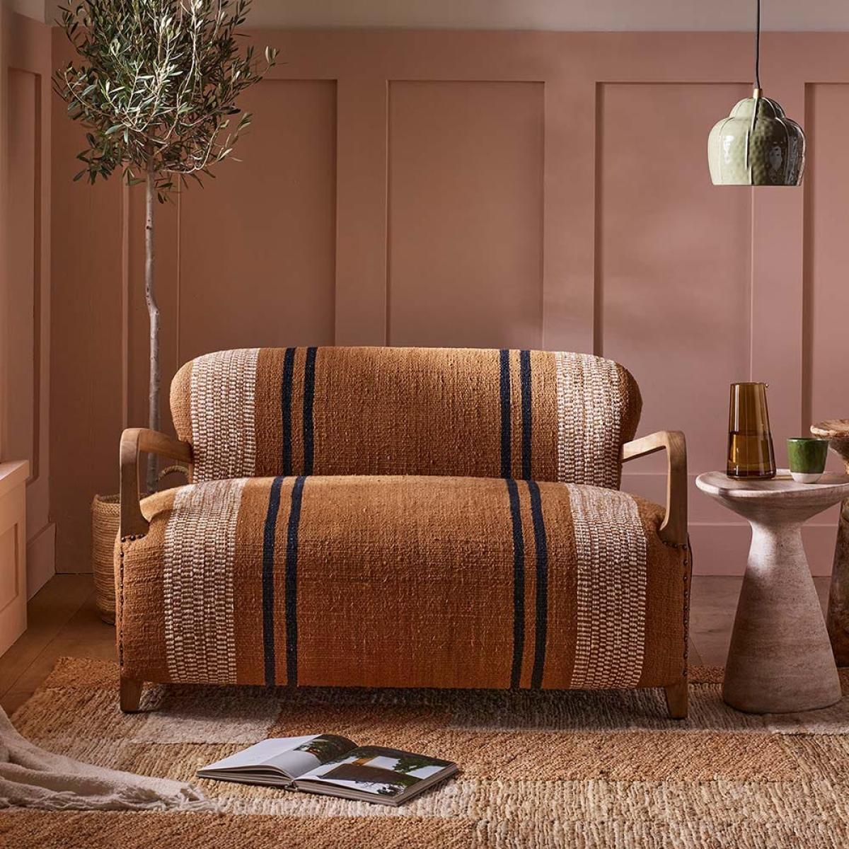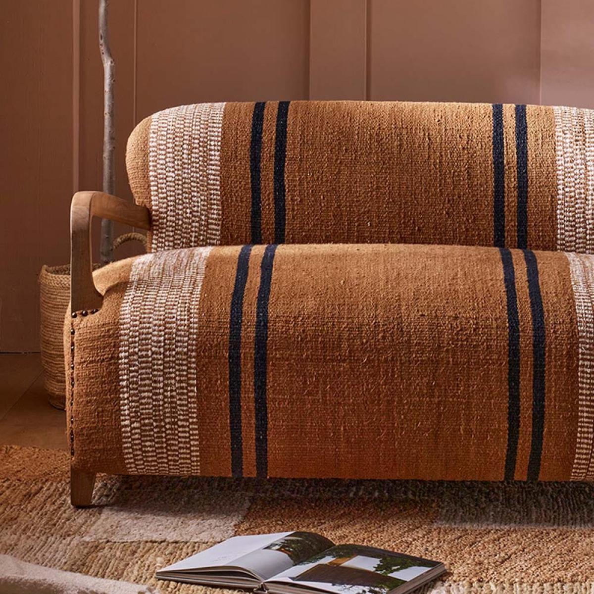 Inspired by the pilot-style armchairs of the 1950s, the Aviator loveseat will add a vintage touch to any living space. The loveseat has been upholstered in a colourful striped cotton that’s been carefully woven by skilled artisans and secured with statement metal studs. The black, clay and white colourway lends a bohemian vibe to the whole thing while the arms and feet are beautifully crafted from mango wood in a natural finish. The upholstered loveseat sofa features a comfortable seat and curved backrest that cradles you in all the right places, meaning you can linger with your date long after dinner is done. Why not fix some drinks – a Manhattan or negroni, perhaps – and settle down for a digestif?