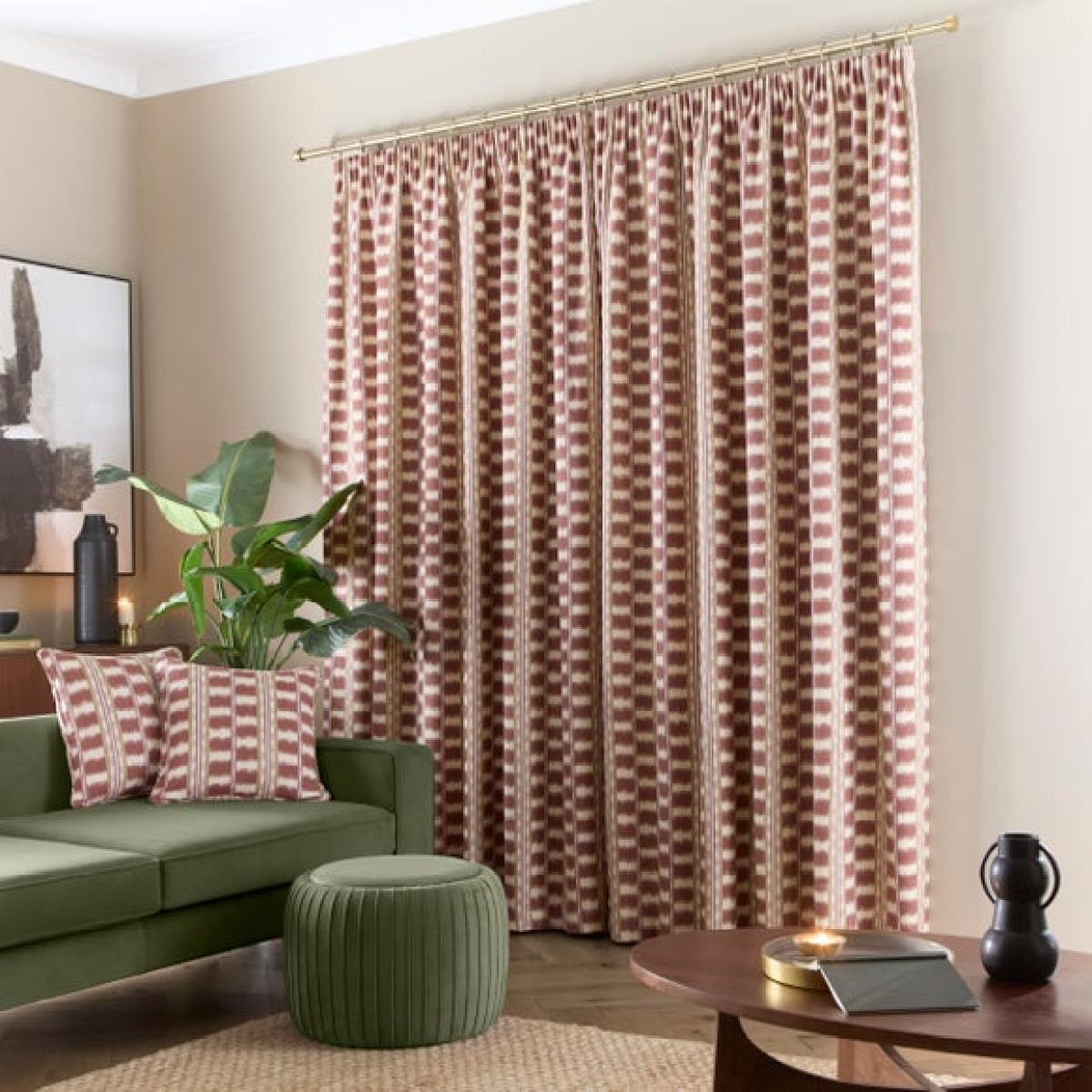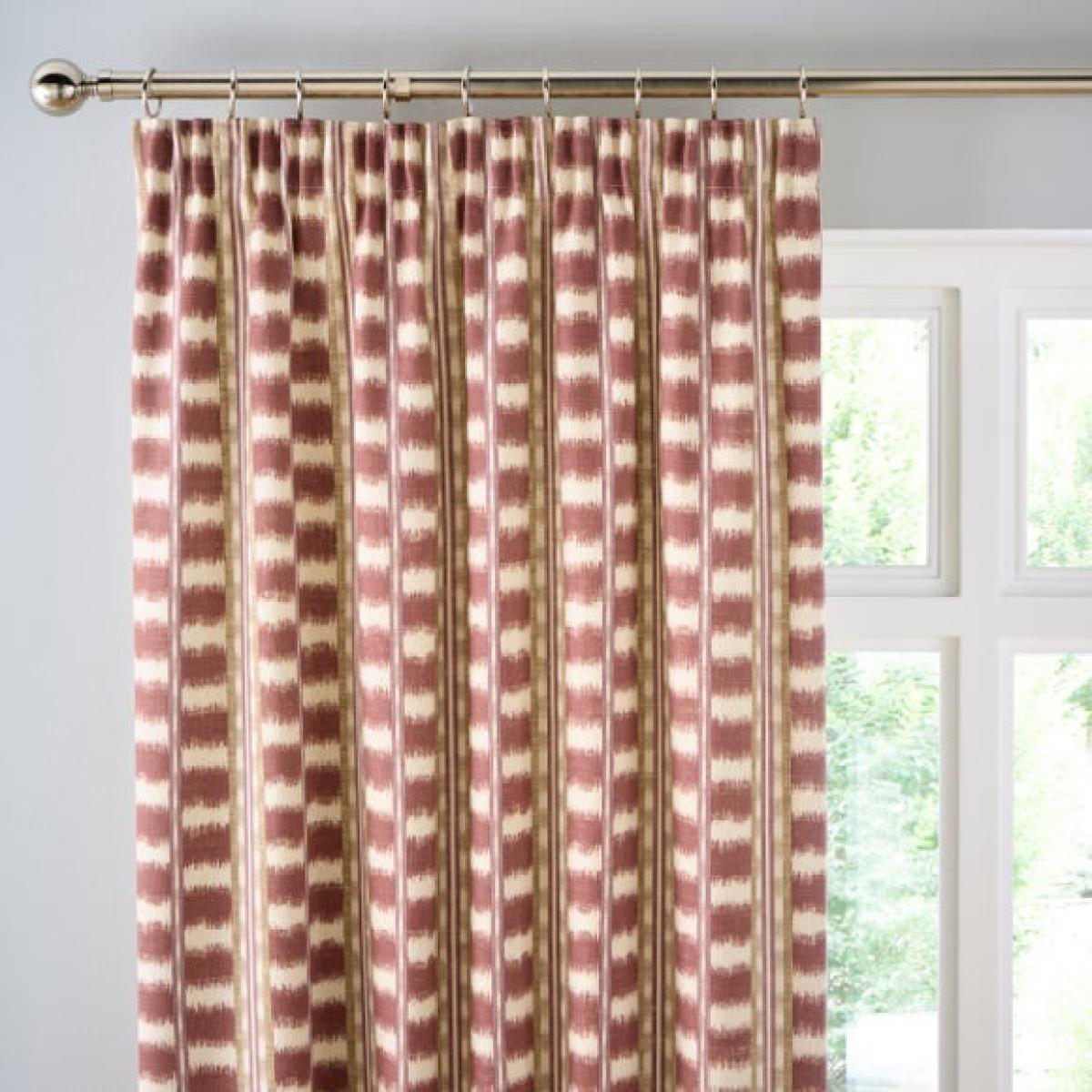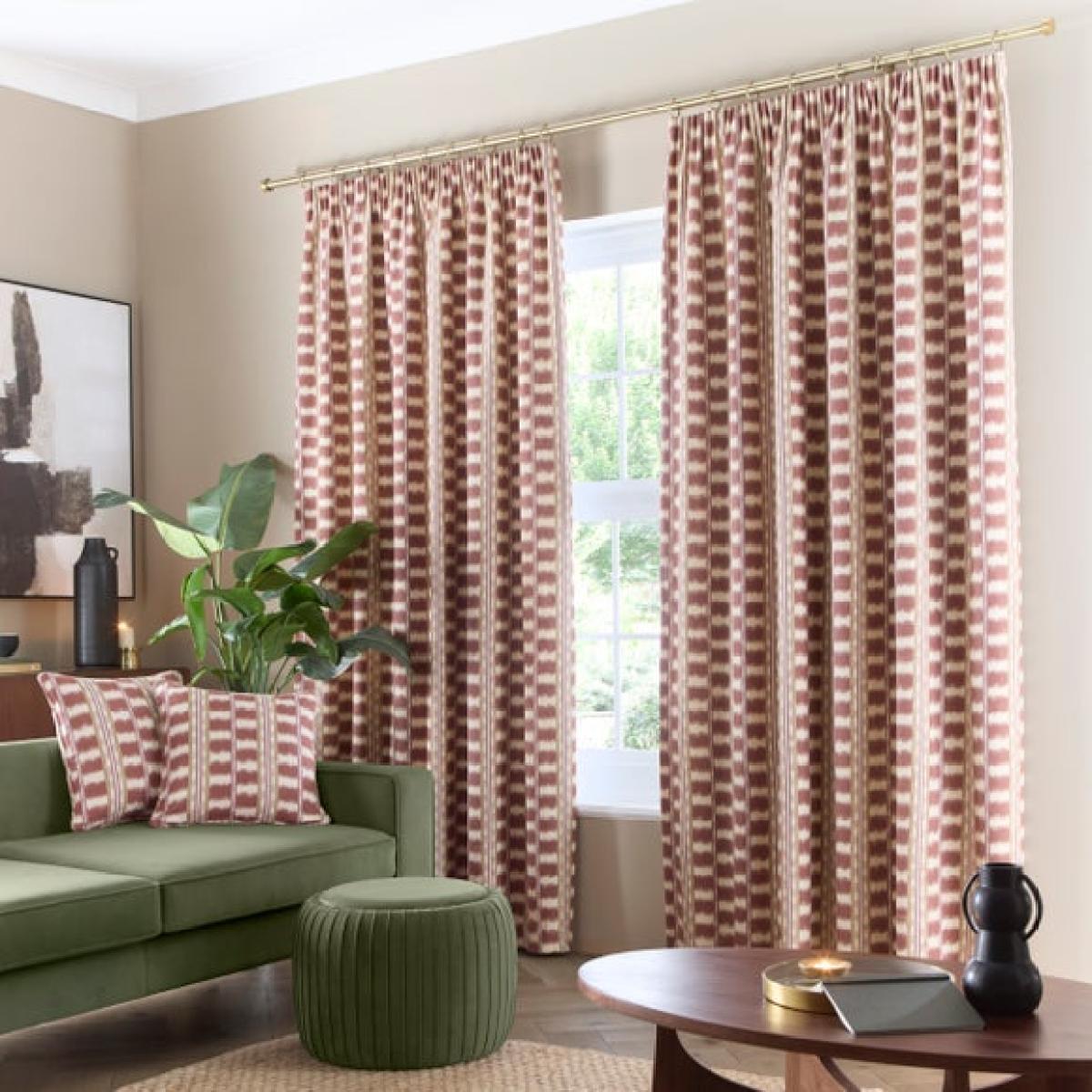 * Soft and crisp cotton face * Bold, patterned design - Perfect for creating a Boho look * Fully Lined * Pencil Pleat Header * Corresponding items available Channel contemporary boho flair with the Avis Stripe Pencil Pleat Curtains, a beautifully bold window treatment designed to bring warmth and character to your interior. Made from a crisp cotton face fabric and printed with a striking stripe design, these curtains are perfect for adding visual interest to minimalist or vintage-inspired spaces. The pencil pleat header offers versatility, allowing you to hang them on both curtain tracks and poles for a tailored, elegant finish. Fully lined to improve drape and reduce light penetration, they are both stylish and functional — a perfect match for expressive interiors.
