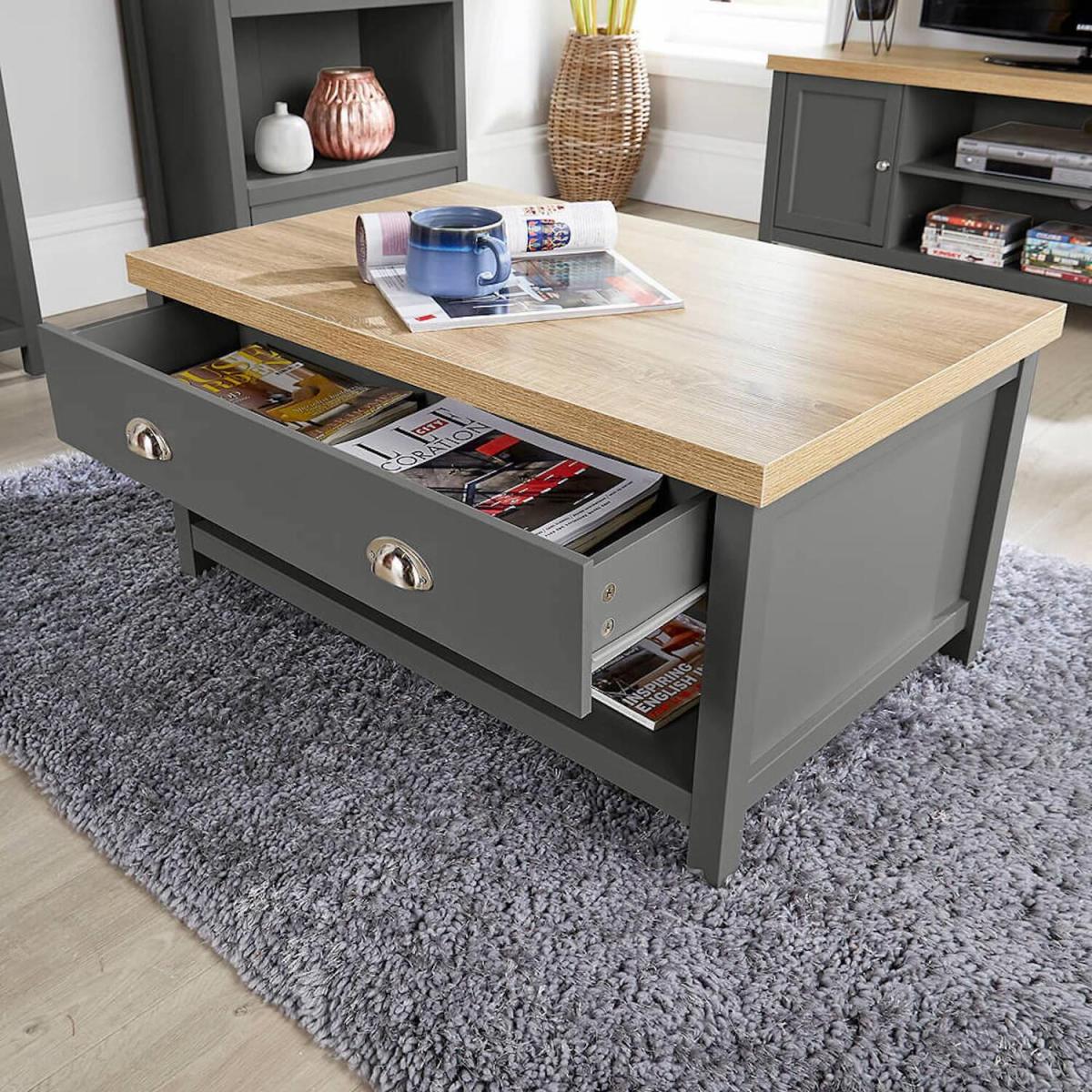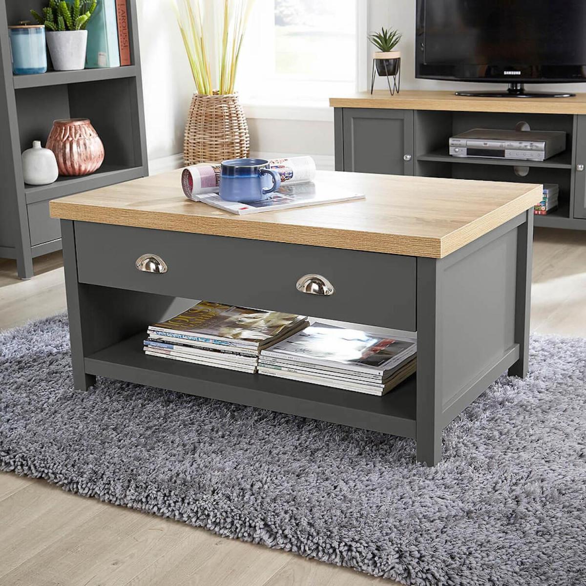Our 2-Drawer Coffee Table is slightly higher than usual, but then it does give you more for your money as it has a contrast Sonoma oak top, plus 2 storage drawers and an undershelf built-in as well. It suits modern dcors thanks to its light grey or graphite finish and goes well next to any armchair or settee. Use it with a lamp on, a vase of flowers or a pot plant, books and magazines or just a convenient place for TV dinners and to rest your drinks, snacks, remote controls and mobile.