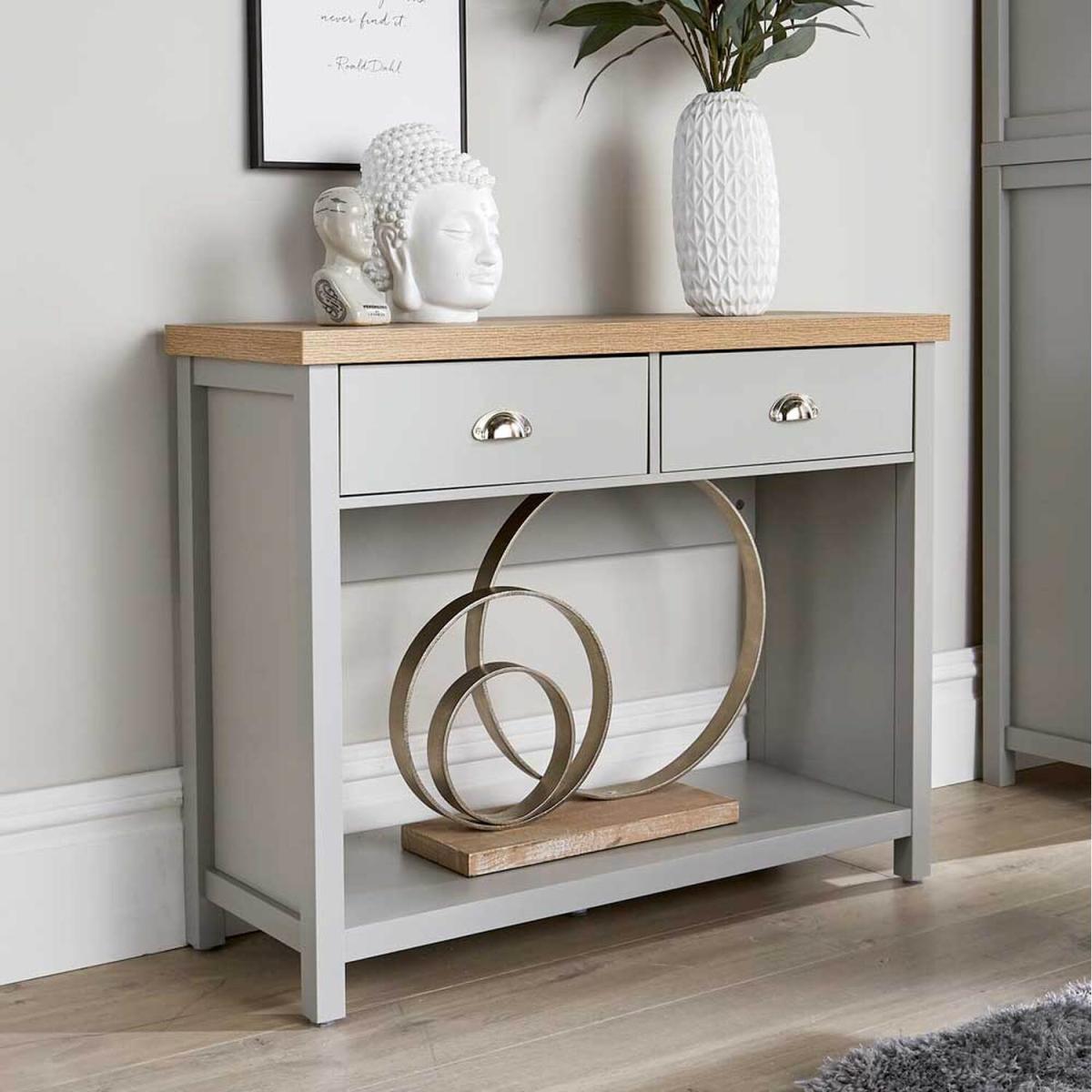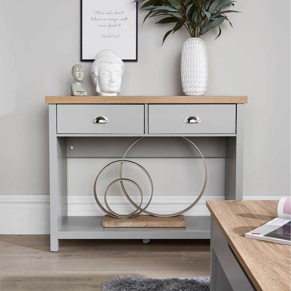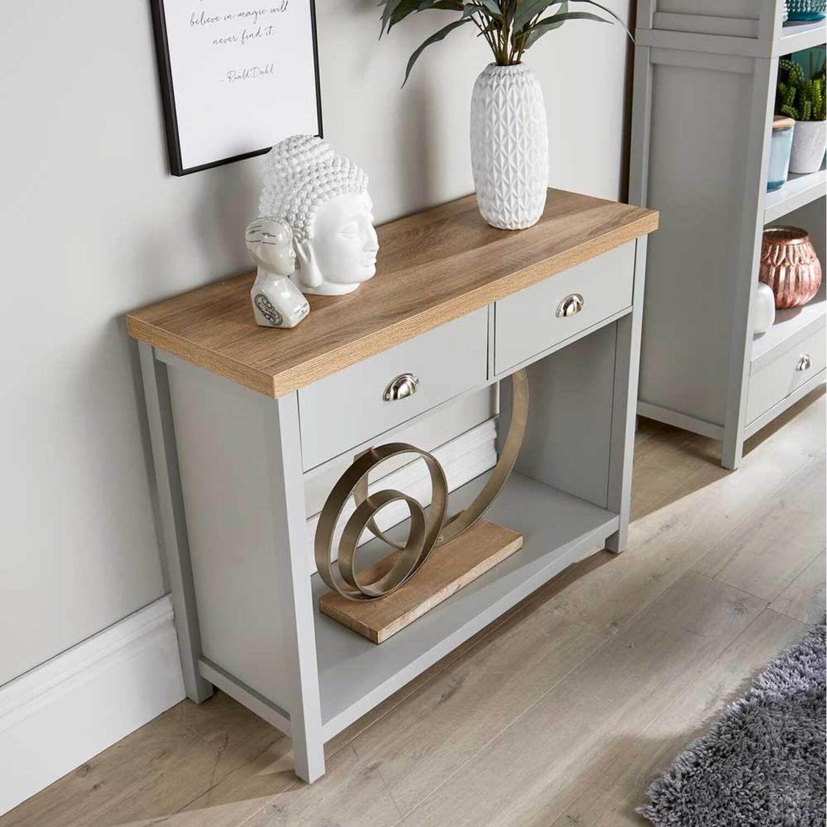 Part of the Avon Collection, this Hallway Console has 2 drawers, a top and bottom shelf, plus a big hole in the middle that's the perfect space for a big flower display or for a prized ornament. Available in Light Grey with Sonoma Oak finish top. This Hallway Console is stylish slimline storage with a contrast wood grain top, plus two storage drawers underneath and a base shelf as well. So the top is ideal for sorting the post that's come through your door, or as the one place you always put your keys, or a great place for a slimline lamp or ornament.