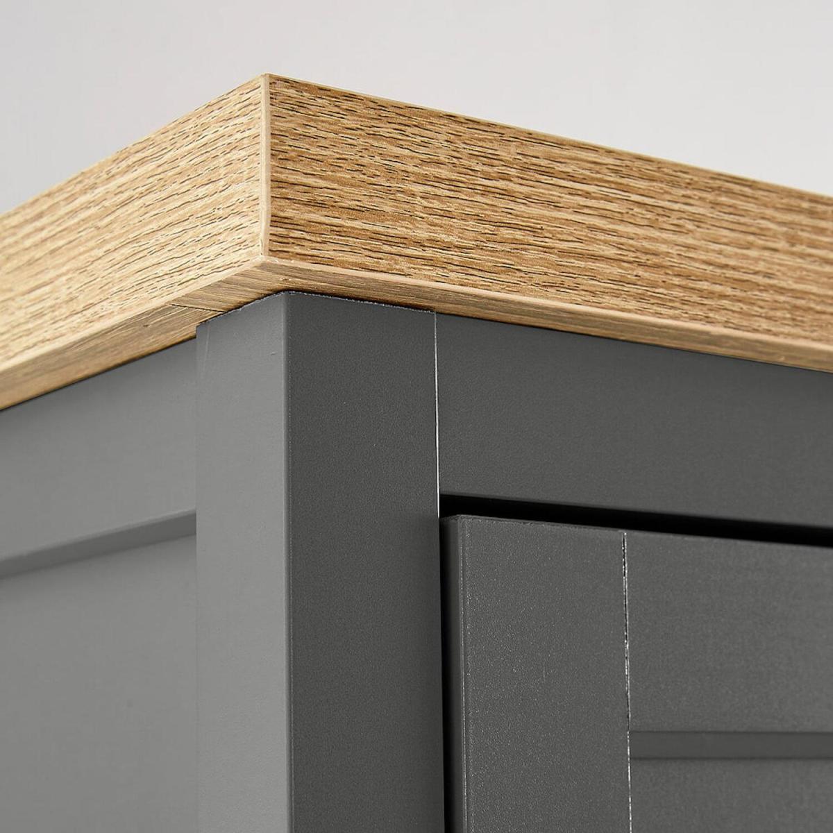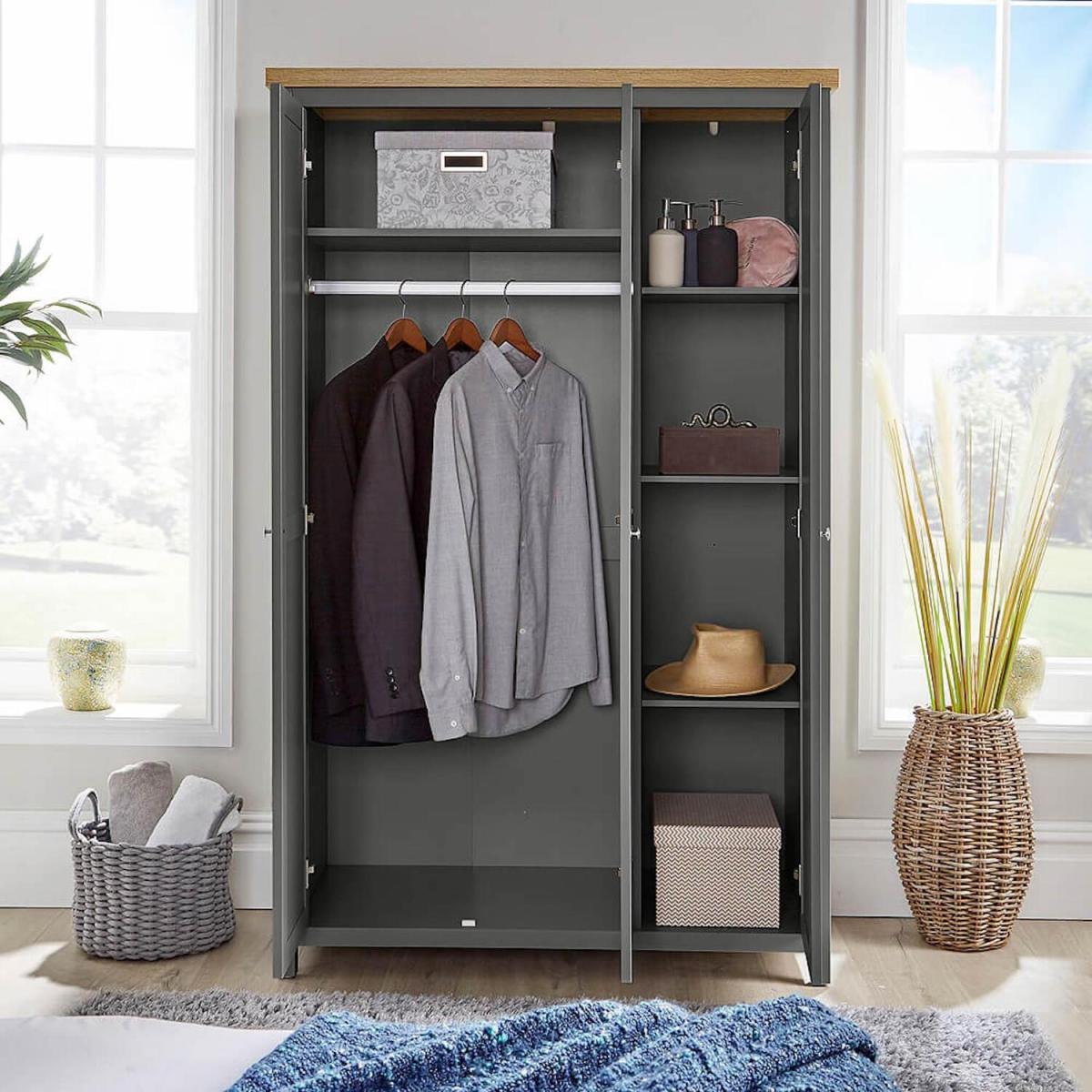 Bring your bedroom to life with this modern triple wardrobe. Extremely stylish, each of the three doors features a panelled design with decorative silver handles for that added detail. The graphite or grey finish and two tone oak top are contemporary and stylish. Store clothing and shoes behind each door, with a hanging rail plus ample shelving available. A practical choice for any bedroom