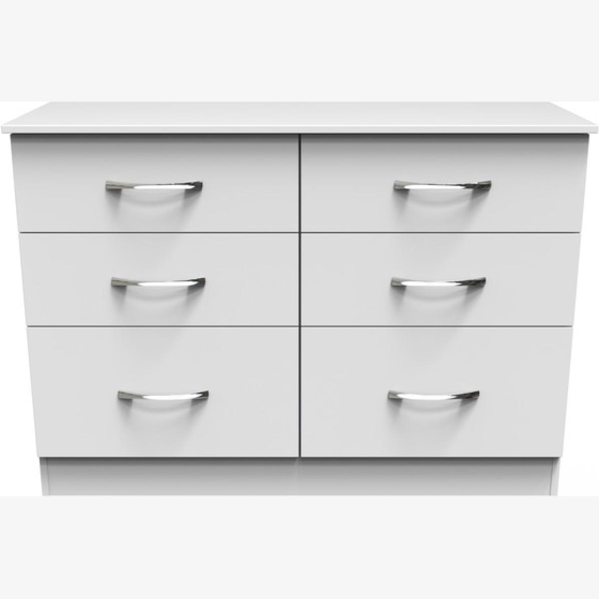 This double width 6 drawer chest of drawers is practical and stylish. Perfect for any home as a free standing storage unit. A great-value furniture range with a sleek classic look and feel that just right for any interior. The simple, no-fuss design features clean lines and stylish chrome handles. A timeless design that will withstand the changes of fashion. All our furniture is made in the United Kingdom, to the highest quality. It is delivered direct to your location of choice by one of our two man delivery teams, and come full assembled (although legs may be removed to prevent damage in transit).