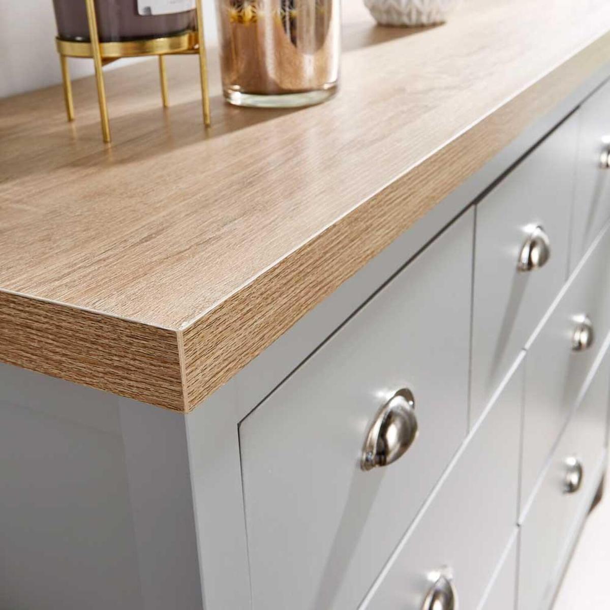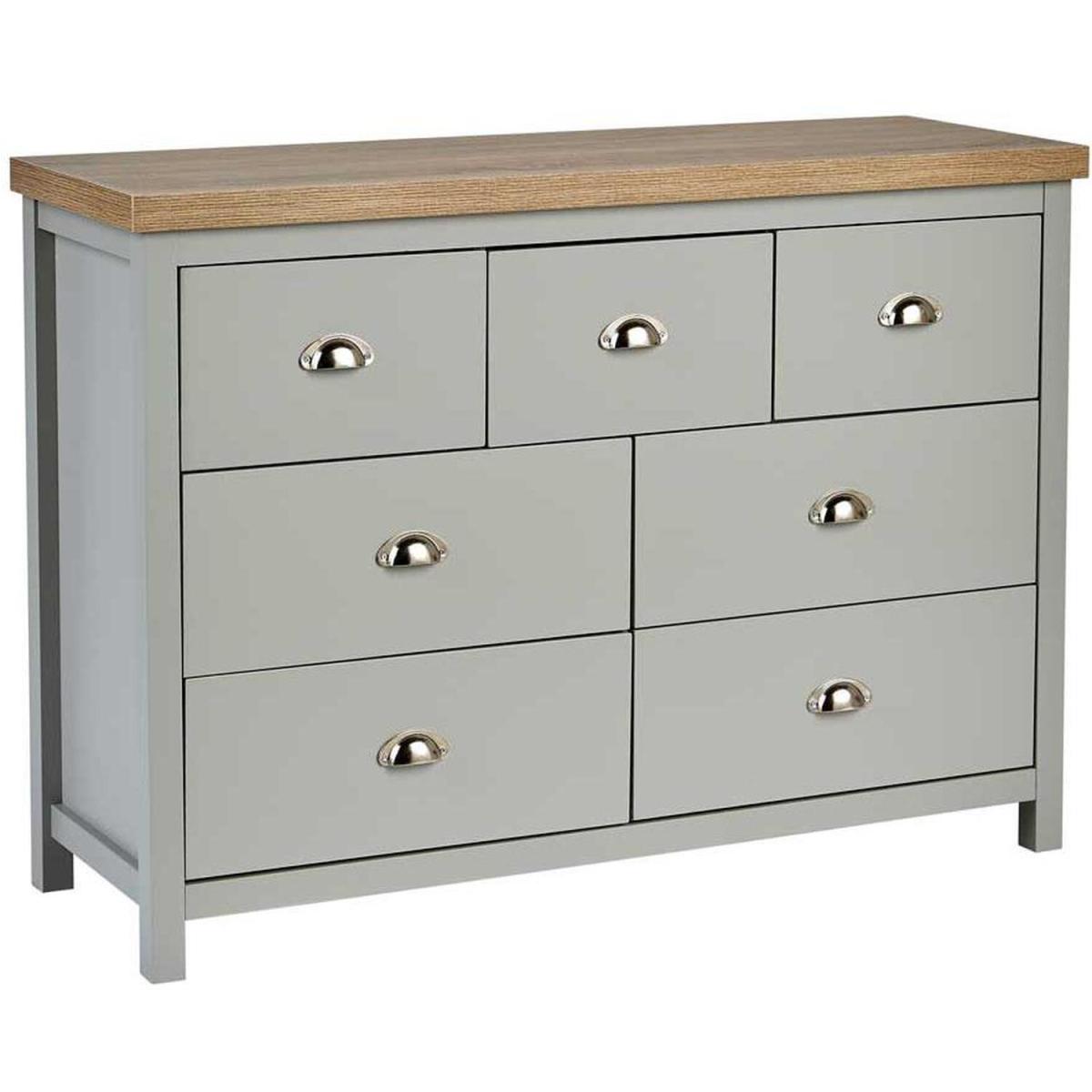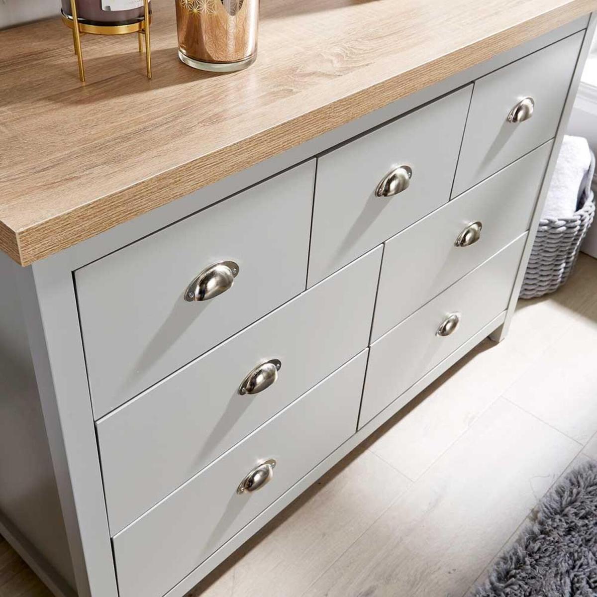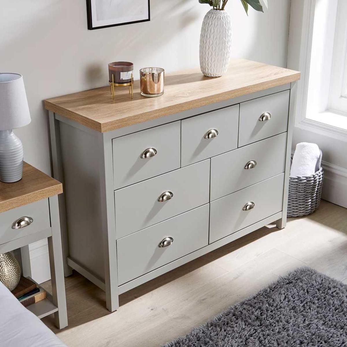 I’m a fan of this grey seven-drawer chest for its clean lines, solid oak-effect top and versatile storage. It sits neatly in Scandi-inspired, coastal or contemporary bedrooms, and the muted grey finish pairs well with soft pastels or monochrome schemes. To style, place a round mirror or simple artwork above, then add a small plant, a ceramic tray for daily essentials and a pair of matching lamps to balance the look. Inside, use drawer organisers to keep linens or clothing sorted, and leave the top clutter-free to let its design speak for itself.