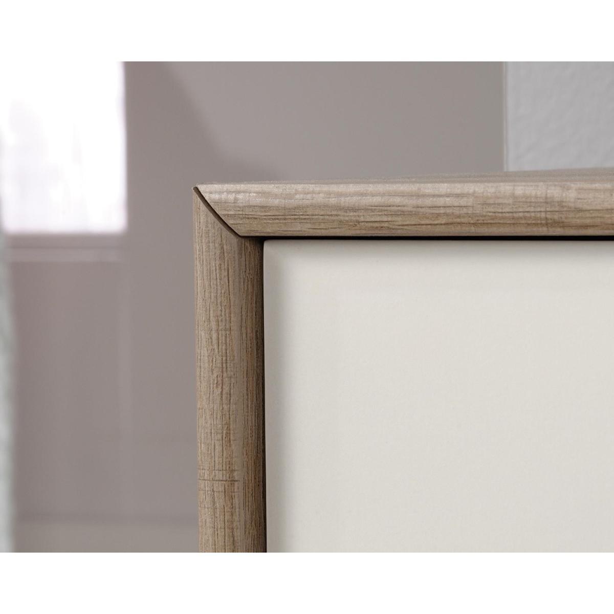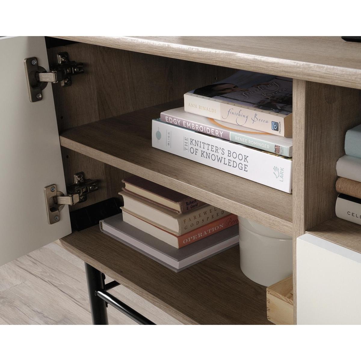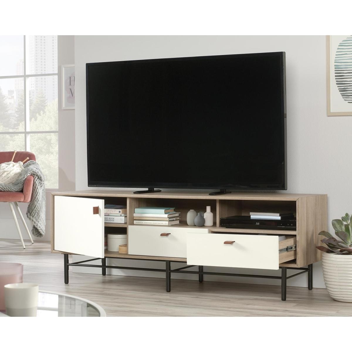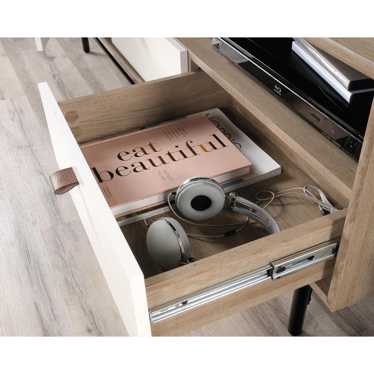 The Teknik Office Avon Leather TV Stand/Credenza is a charming and delightful option for all office and home colour schemes. Beautifully finished in Sky Oak with White accents, this TV /Credenza can accommodate a TV weighing a maximum of 31kg. It has an adjustable shelf which is discreetly hidden behind door for neat organisation while the two easy-glide drawers with full extension slides offer perfect storage space for smaller items, the contrasting leather handles complete the neat look. It also has two open cubbies for additional display items.