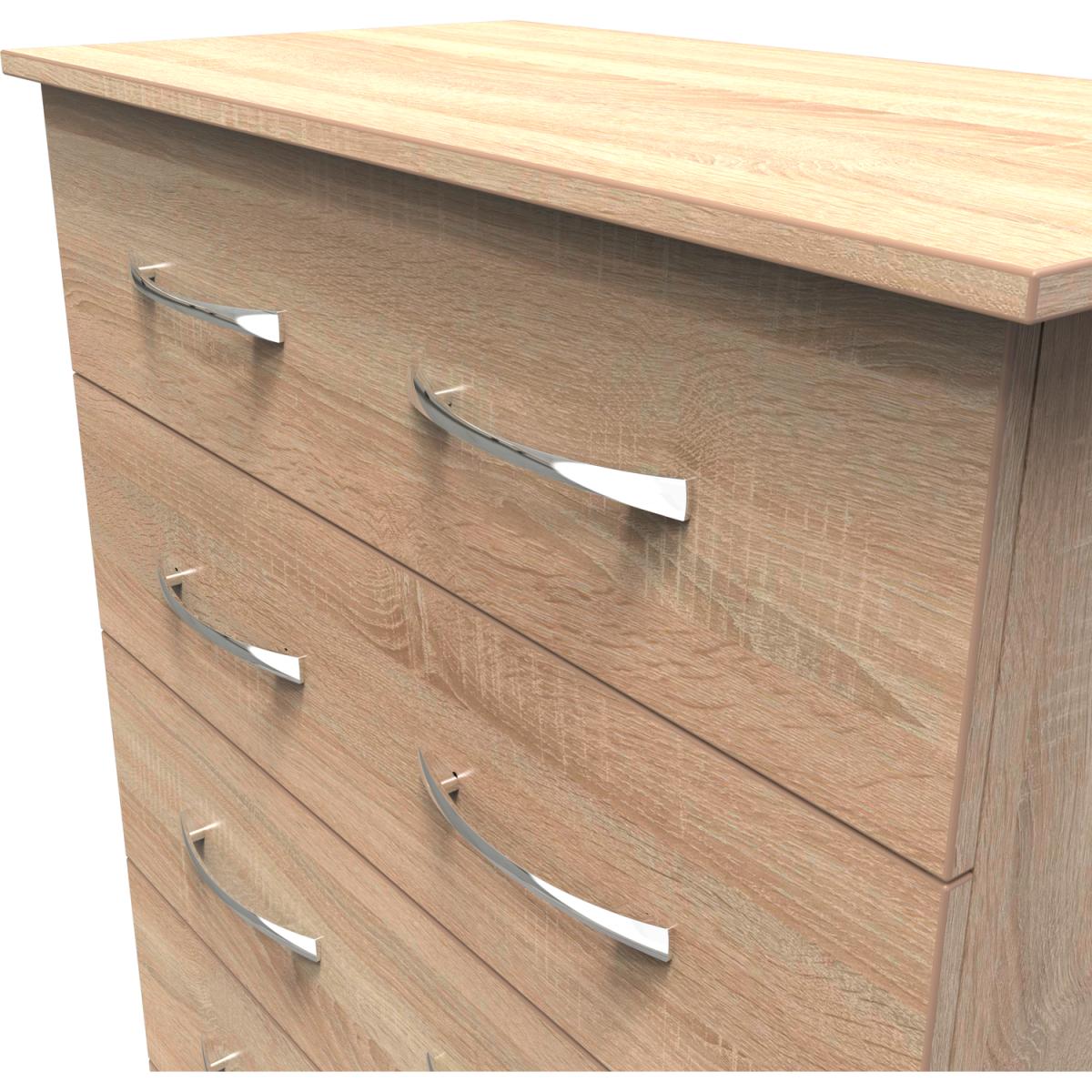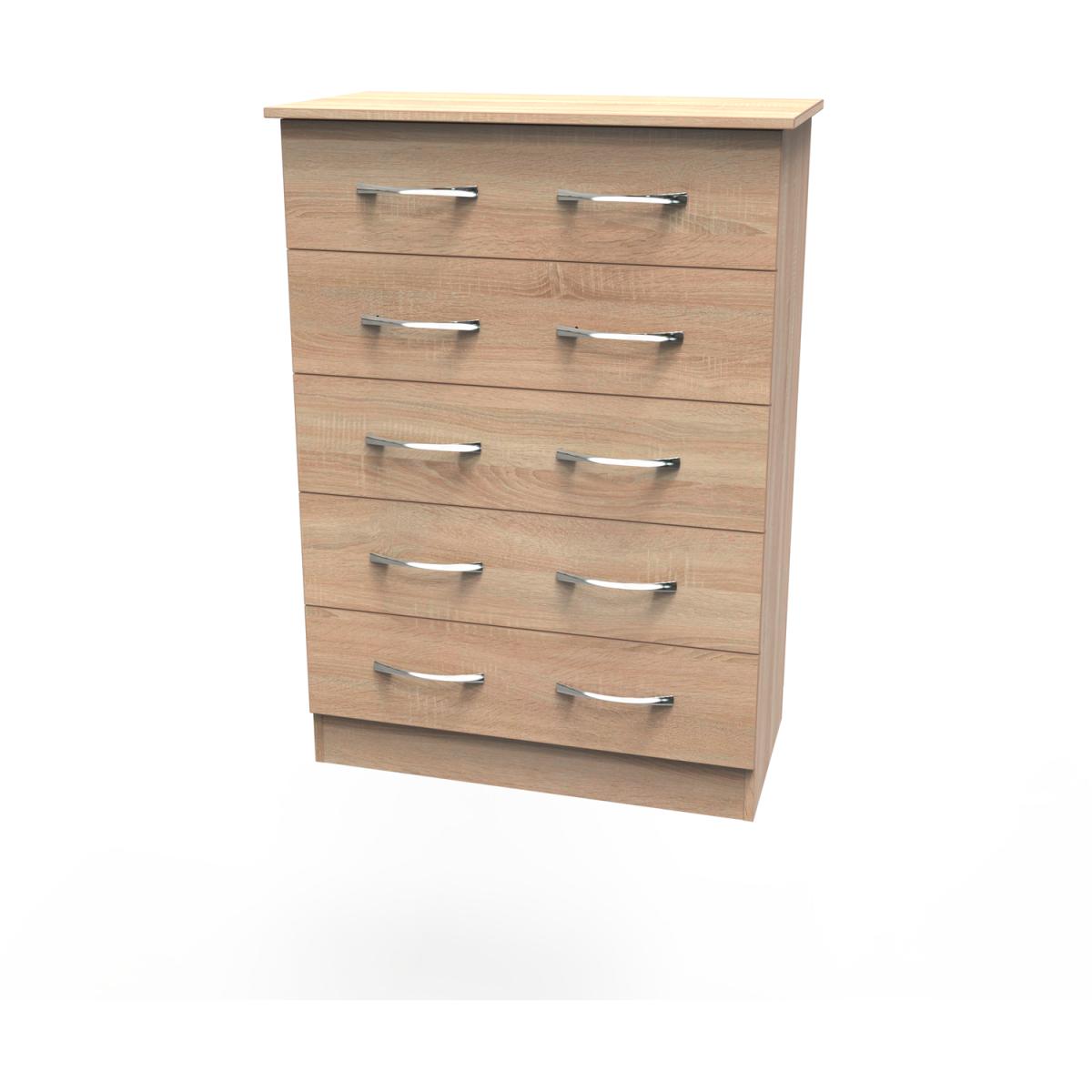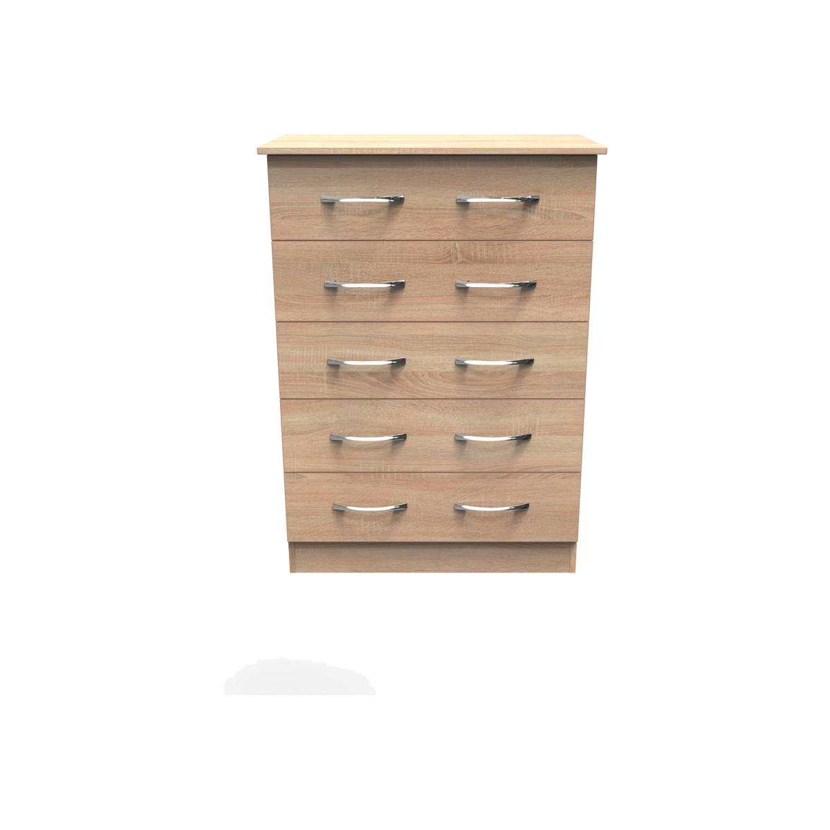 This wide 5 drawer chest of drawers is practical and stylish. Perfect for any home as a free standing storage unit. A great-value furniture range with a sleek classic look and feel that just right for any interior. The simple, no-fuss design features clean lines and stylish chrome handles. A timeless design that will withstand the changes of fashion. All our furniture is made in the United Kingdom, to the highest quality. It is delivered direct to your location of choice by one of our two man delivery teams, and come full assembled (although legs may be removed to prevent damage in transit).