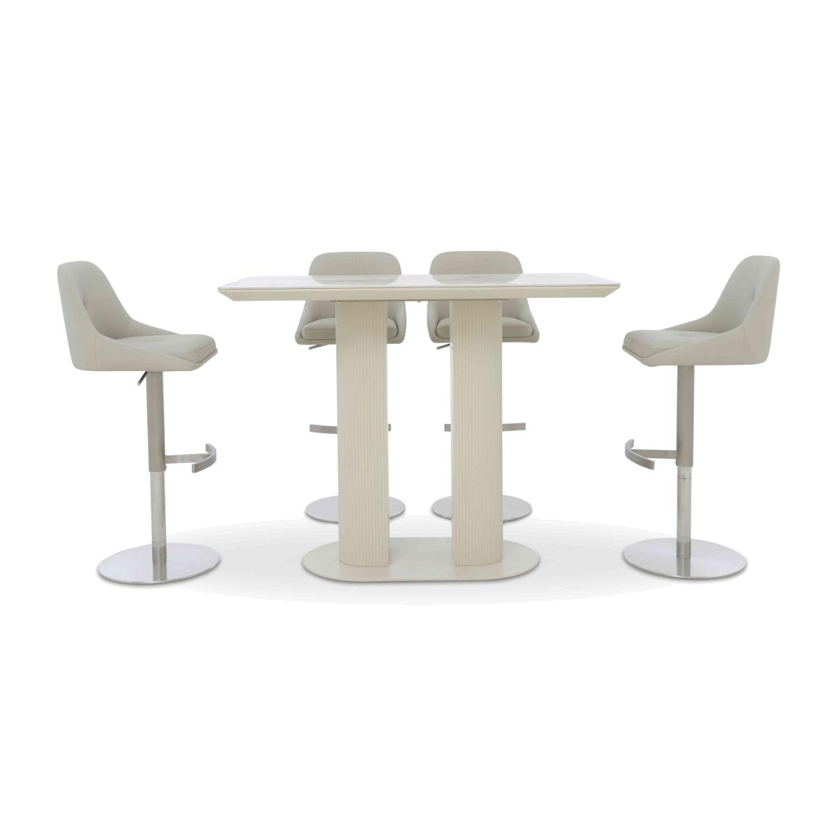 All the high-end style of marble furniture, all the family-friendly durability of ceramic, and all at a great-value price – our Avorio range makes it easy to furnish living and dining spaces in glossy ceramic style. The collection includes both fixed and extending dining tables – and we think you’ll love those slick pop-up and swivel extension mechanisms – dining sets, dining chairs and bar stools, occasional tables, media cabinets and more. Storage and display pieces have sleek rounded edges and decorative fluting that matches the tables’ pedestal bases as well as alcoves and shelves with built-in LED lighting. The Avorio range is exclusive to Furniture Village. Who needs a formal dining room when you can turn a kitchen diner into an elegant dining space with this fabulous bar table set? This set includes four bar stools. Why you'll love it Sleek ceramic style at a great-value price. The bar table’s glossy marble-effect ceramic top is applied by hand. Space-saving, compact and a great choice for stylish family homes. Ceramic is very durable – it’s heatproof and scratch- and chip-resistant. Pedestal base has a very cool fluted finish. Set includes 4 swivel-base bar stools with supportive backrests. Neutral-coloured faux leather with elegant stitching and buttoning detail. Only at Furniture Village. This bar table set is part of our Avorio range. What you need to know Bar stools have metal frames and bases. Cushioned with foam. Table top is made of ceramic bonded to glass. Seats 6. This finish may show surface scratches under certain lighting. We recommend using coasters and placemats at all times. Easy to care for. Simply wipe with a clean damp cloth.