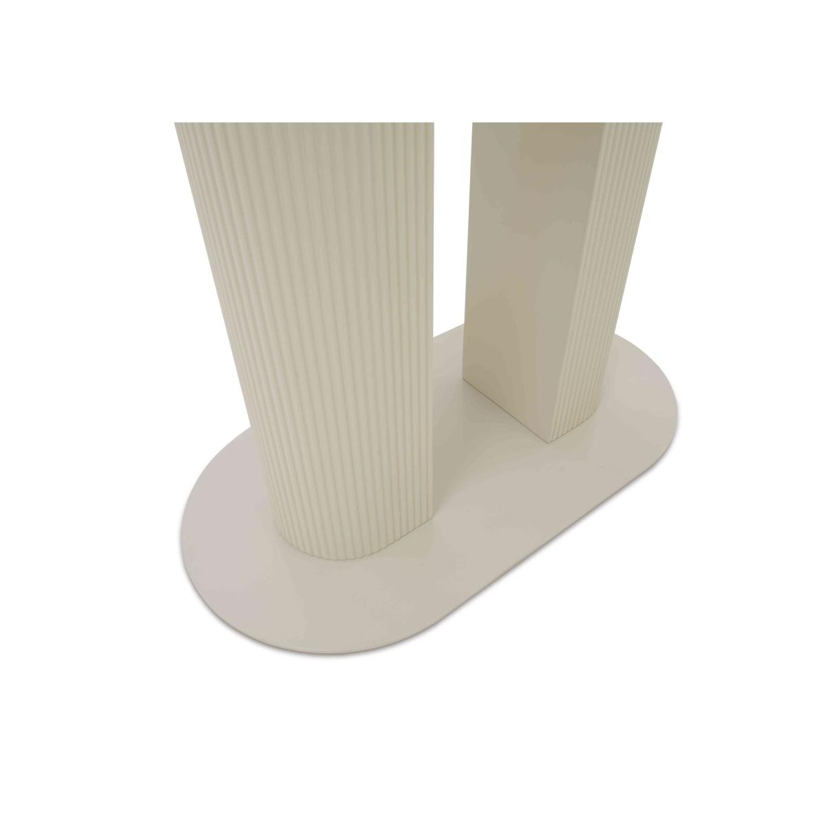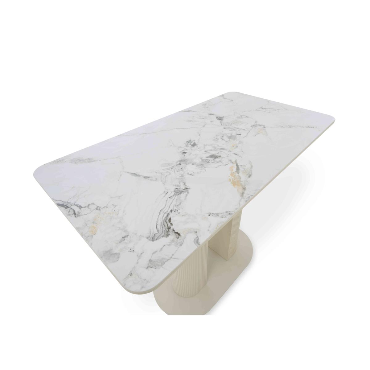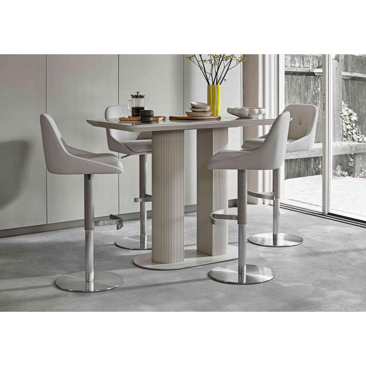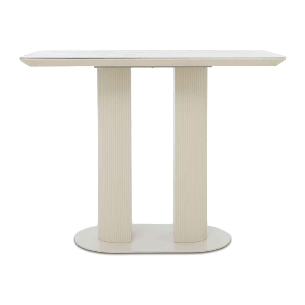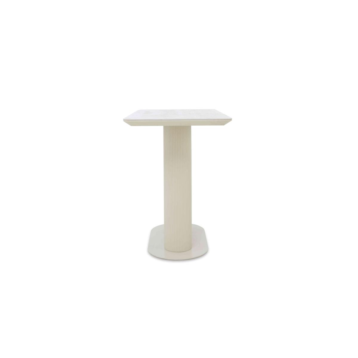 All the high-end style of marble furniture, all the family-friendly durability of ceramic, and all at a great-value price – our Avorio range makes it easy to furnish living and dining spaces in glossy ceramic style. The collection includes both fixed and extending dining tables – and we think you’ll love those slick pop-up and swivel extension mechanisms – dining sets, dining chairs and bar stools, occasional tables, media cabinets and more. Storage and display pieces have sleek rounded edges and decorative fluting that matches the tables’ pedestal bases as well as alcoves and shelves with built-in LED lighting. The Avorio range is exclusive to Furniture Village. This six-seater bar table will quickly elevate your casual dining space style thanks to its high-gloss marble-patterned ceramic top and pedestal base. Why you'll love it Sleek ceramic style at a great-value price. Glossy marble-effect ceramic top is applied by hand. Space-saving, compact and a great choice for stylish family homes. Ceramic is very durable – it’s heatproof and scratch- and chip-resistant. Pedestal base has a very cool fluted finish. Only at Furniture Village. This bar table is part of our Avorio range. What you need to know Top is made of ceramic bonded to glass. Seats 6. This finish may show surface scratches under certain lighting. We recommend using coasters and placemats at all times. Easy to care for. Simply wipe with a clean damp cloth.