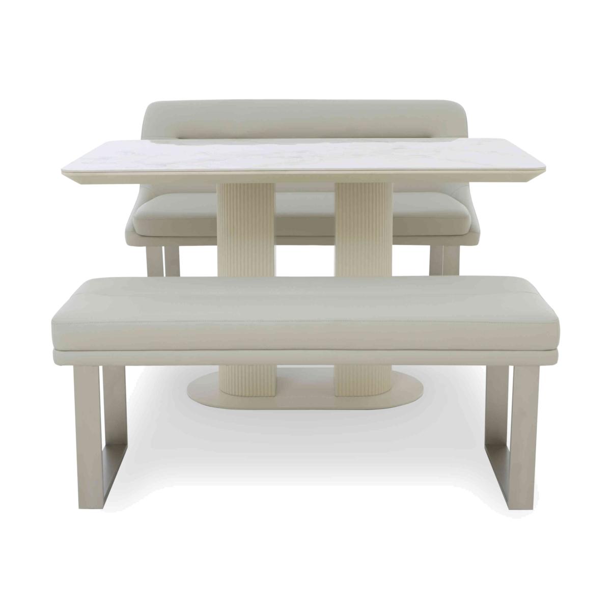 All the high-end style of marble furniture, all the family-friendly durability of ceramic, and all at a great-value price – our Avorio range makes it easy to furnish living and dining spaces in glossy ceramic style. The collection includes both fixed and extending dining tables – and we think you’ll love those slick pop-up and swivel extension mechanisms – dining sets, dining chairs and bar stools, occasional tables, media cabinets and more. Storage and display pieces have sleek rounded edges and decorative fluting that matches the tables’ pedestal bases as well as alcoves and shelves with built-in LED lighting. The Avorio range is exclusive to Furniture Village. Beauty meets practicality in this great-value dining set with durable glossy ceramic dining table and two dining benches. Only at Furniture Village. Why you'll love it Sleek ceramic style at a great-value price. Glossy marble-effect ceramic table top is applied by hand. Space-saving, compact and a great choice for stylish family homes. Ceramic is very durable – it’s heatproof and scratch- and chip-resistant. Pedestal base has a very cool fluted finish. Dining set includes versatile seating – a high-back and a low dining bench. Benches have U-shaped metal legs. Soft faux leather upholstery in a neutral colour with understated stitching detail. Only at Furniture Village. This dining set is part of our Avorio range. What you need to know Low dining bench seats 2 adults. High-back dining bench seats 2 adults. Dining benches have metal frames and legs. Cushioned with foam. Dining table seats 6. Table top is made of ceramic bonded to glass. This finish may show surface scratches under certain lighting. We recommend using coasters and placemats at all times. Easy to care for. Simply wipe with a clean damp cloth.