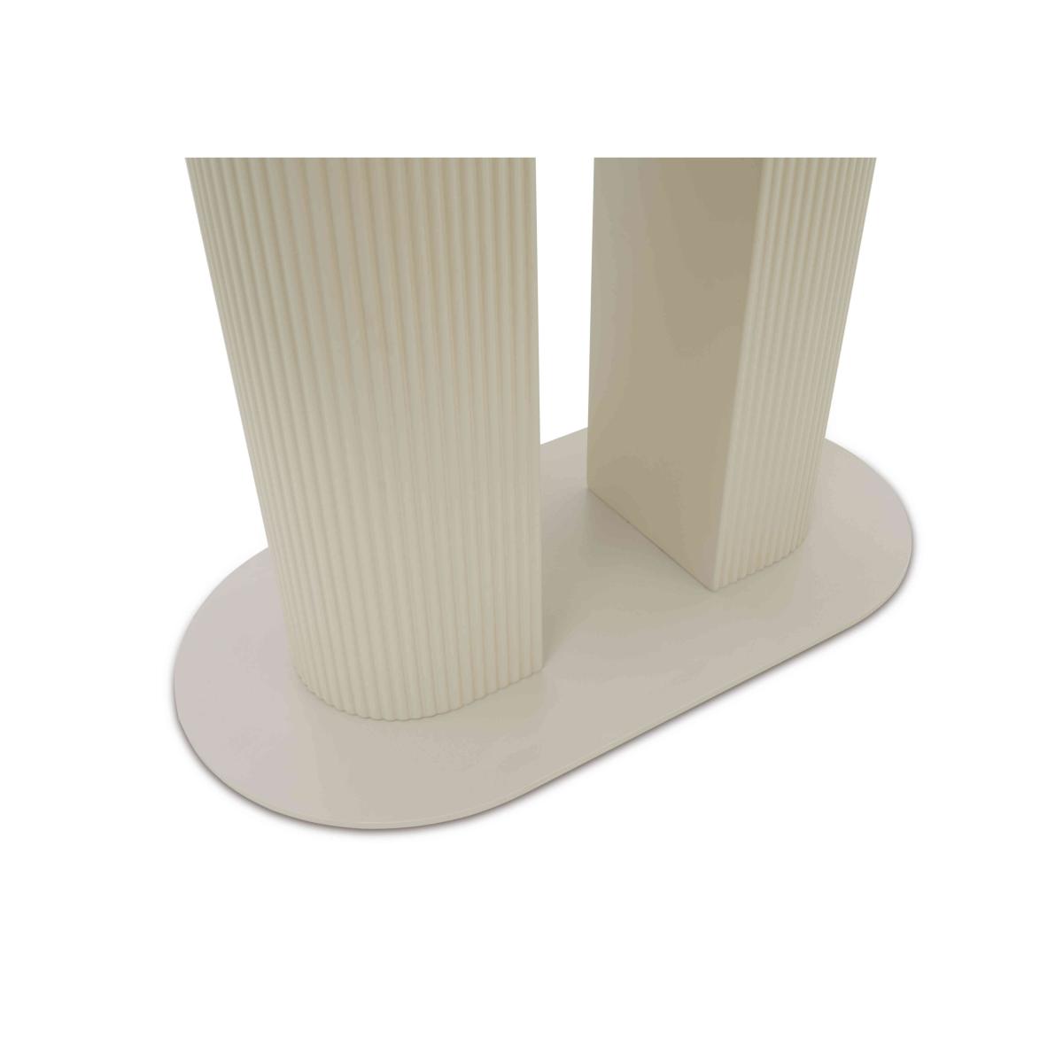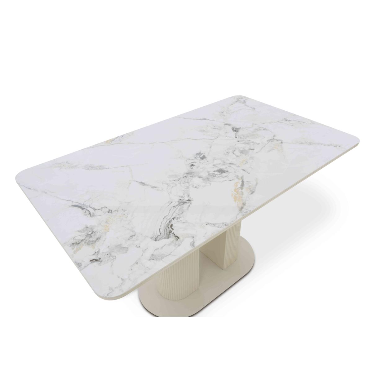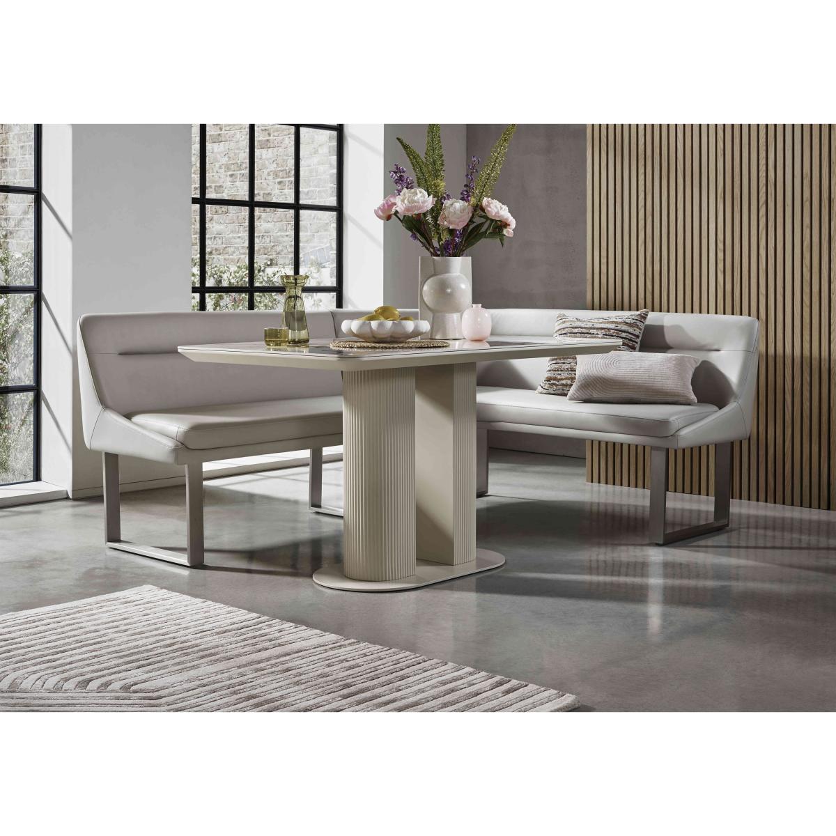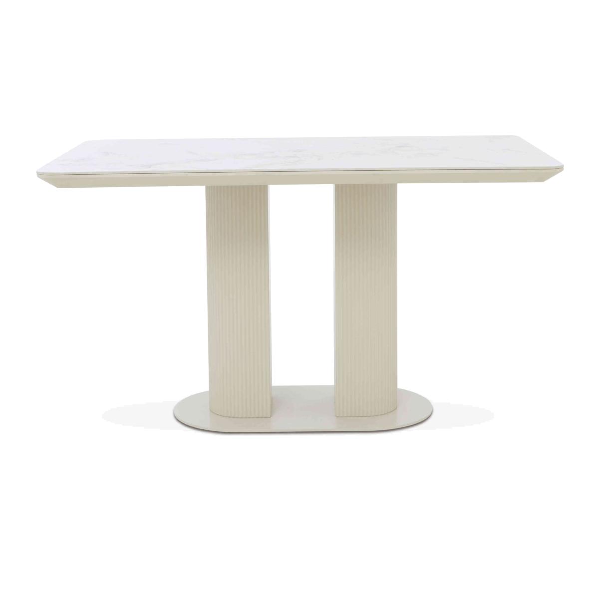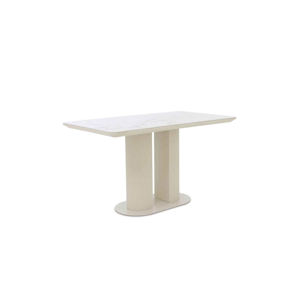 All the high-end style of marble furniture, all the family-friendly durability of ceramic, and all at a great-value price – our Avorio range makes it easy to furnish living and dining spaces in glossy ceramic style. The collection includes both fixed and extending dining tables – and we think you’ll love those slick pop-up and swivel extension mechanisms – dining sets, dining chairs and bar stools, occasional tables, media cabinets and more. Storage and display pieces have sleek rounded edges and decorative fluting that matches the tables’ pedestal bases as well as alcoves and shelves with built-in LED lighting. The Avorio range is exclusive to Furniture Village. Modern glam style that’s ideal for family dining? This compact dining table seats six and has a beautiful marble-patterned ceramic top that's heatproof and scratch-resistant. Great value. Why you'll love it Sleek ceramic style at a great-value price. Glossy marble-effect ceramic top is applied by hand. Space-saving, compact and a great choice for stylish family homes. Ceramic is very durable – it’s heatproof and scratch- and chip-resistant. Pedestal base has a very cool fluted finish. Only at Furniture Village. This dining table is part of our Avorio range. What you need to know Top is made of ceramic bonded to glass. Table seats 6. This finish may show surface scratches under certain lighting. We recommend using coasters and placemats at all times. Easy to care for. Simply wipe with a clean damp cloth.