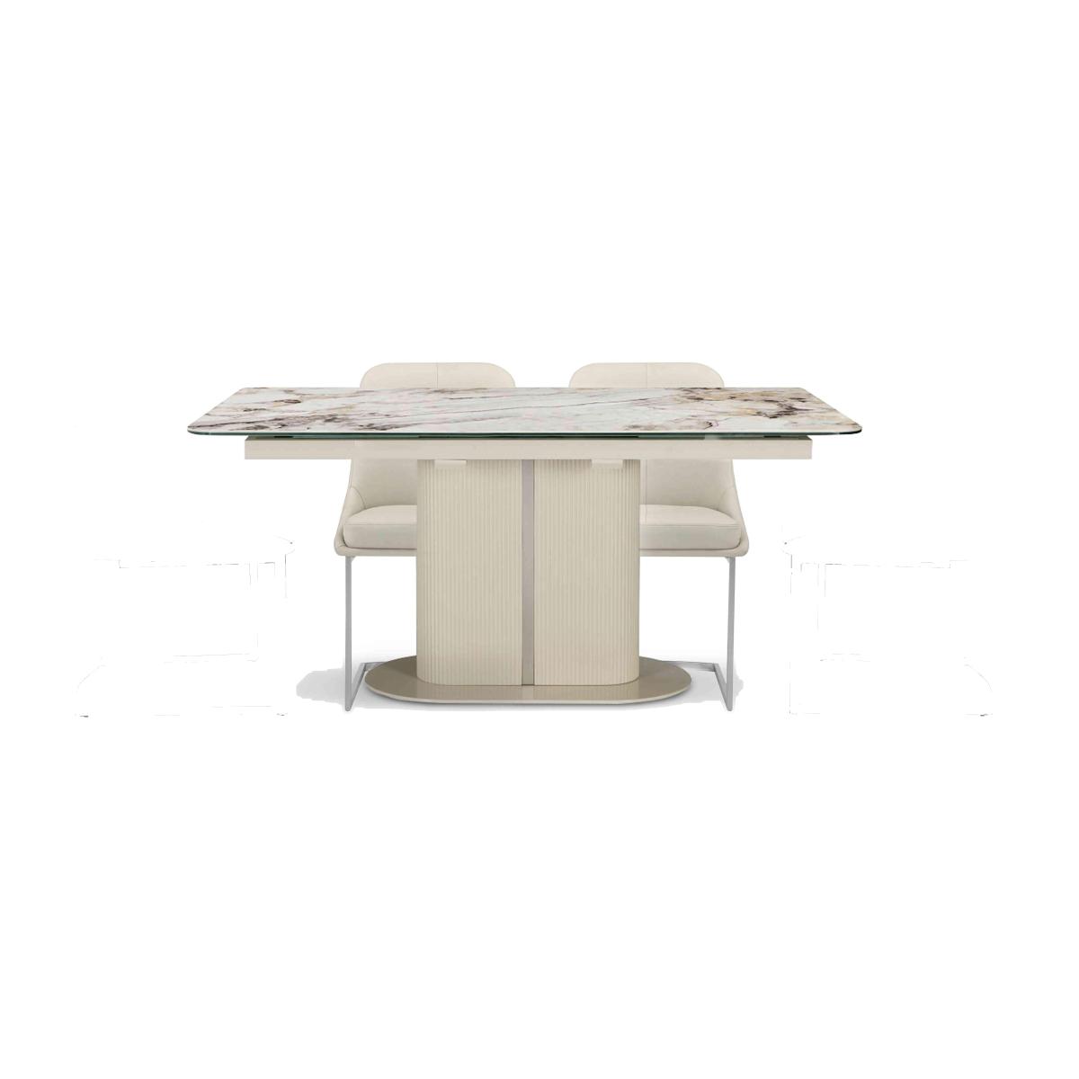 All the high-end style of marble furniture, all the family-friendly durability of ceramic, and all at a great-value price – our Avorio range makes it easy to furnish living and dining spaces in glossy ceramic style. The collection includes two sizes of extending dining table – and we think you’ll love the slick pop-up extension mechanism – dining sets, dining chairs, occasional tables, media cabinets and more. Storage and display pieces have sleek rounded edges and decorative fluting that matches the tables’ pedestal bases as well as alcoves and shelves with built-in LED lighting. The Avorio range is exclusive to Furniture Village. This ceramic-topped dining set with four cantilever-base dining chairs only looks high-end. We think you’ll love the price just as much as its sleek modern style and family-friendly durability. Why you'll love it Sleek ceramic style at a great-value price. Glossy marble-effect ceramic table top is applied by hand. A great choice for stylish family homes. Ceramic is very durable and heat-, scratch- and chip-resistant. Super-easy to extend – just pull on the table ends and an extra leaf pops up into place. Pedestal base has a very cool fluted finish. Available in 2 sizes. Dining set includes 4 cantilever-base dining chairs. Neutral-coloured faux leather upholstery with elegant stitching and buttoning detail. Elegant minimal stitching and buttoning. Only at Furniture Village. This dining set is part of our Avorio range. What you need to know Chairs have metal frames and bases. Cushioned with foam. Table top is made of ceramic bonded to glass. Small 130 cm table seats 4 and extends to 160 cm to seat 6. Large 160 cm table seats 8 and extends to 200 cm to seat 10. This finish may show surface scratches under certain lighting. Please note that ceramic is not 100% heatproof. We recommend using coasters and placemats at all times. Easy to care for. Simply wipe with a clean damp cloth.