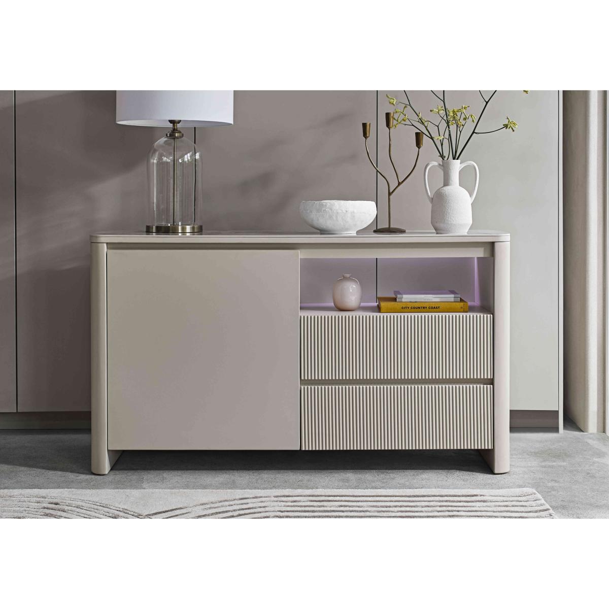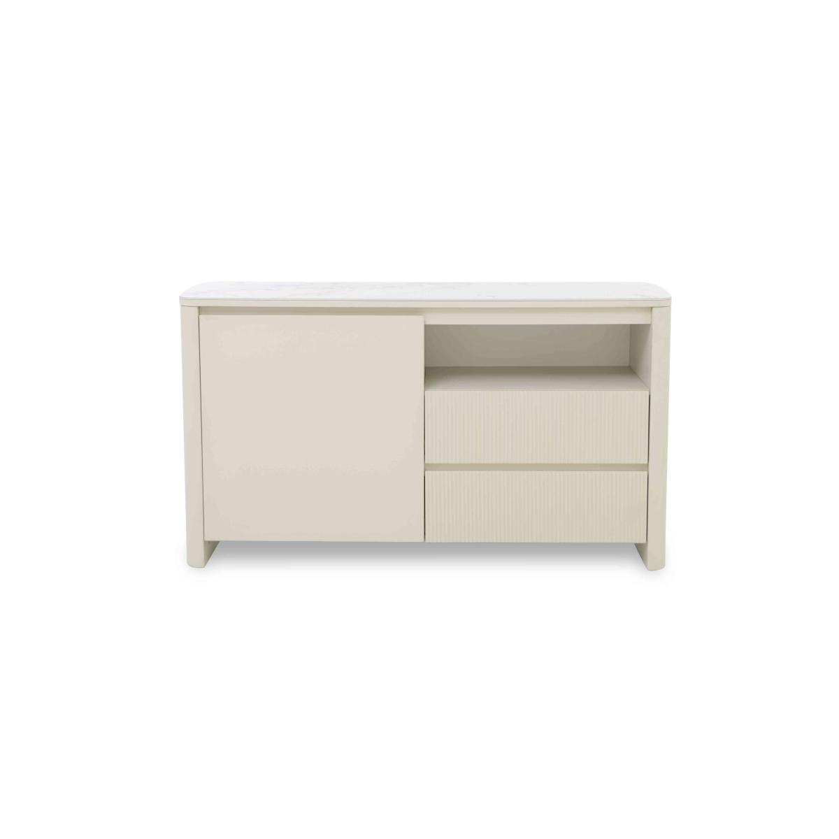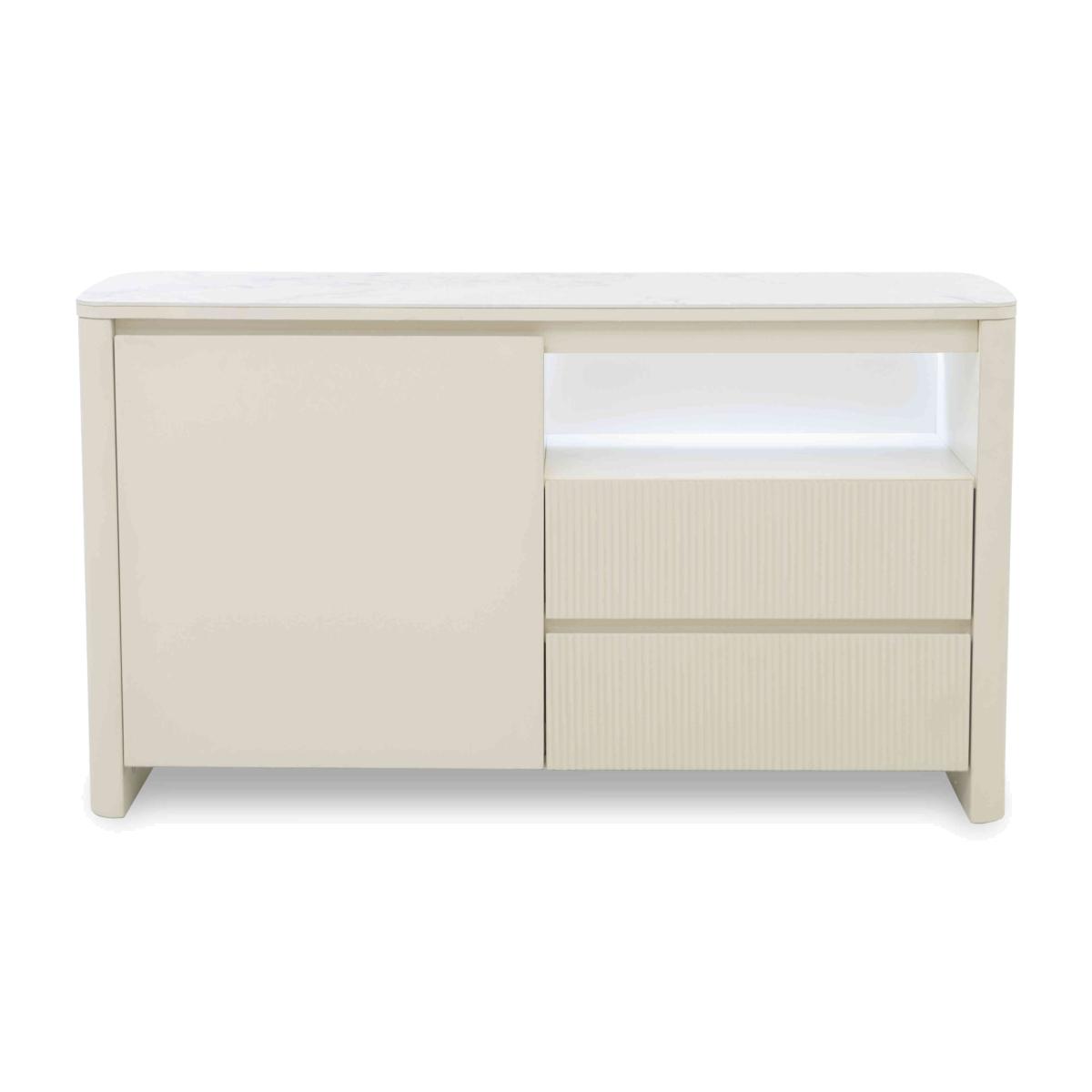All the high-end style of marble furniture, all the family-friendly durability of ceramic, and all at a great-value price – our Avorio range makes it easy to furnish living and dining spaces in glossy ceramic style. The collection includes both fixed and extending dining tables – and we think you’ll love those slick pop-up and swivel extension mechanisms – dining sets, dining chairs and bar stools, occasional tables, media cabinets and more. Storage and display pieces have sleek rounded edges and decorative fluting that matches the tables’ pedestal bases as well as alcoves and shelves with built-in LED lighting. The Avorio range is exclusive to Furniture Village. This glossy ceramic-topped sideboard brings style and storage to a smaller dining room. There's a display alcove with LED lighting, as well as cupboard and drawer storage. Why you'll love it Sleek ceramic style at a great-value price. Glossy marble-effect ceramic top is applied by hand. Space-saving, compact and a great choice for stylish family homes. Ceramic is very durable – it’s heatproof and scratch- and chip-resistant. Integrated LED lighting makes a real feature of this sideboard’s alcove. Curved sides and fluted drawer fronts. Spacious storage with soft-closing drawers and cupboard door. Only at Furniture Village. This small sideboard is part of our Avorio range. What you need to know 2 drawers. 1 cupboard with an adjustable shelf. Top is made of ceramic bonded to glass. This finish may show surface scratches under certain lighting. We recommend using coasters and placemats at all times. Easy to care for. Simply wipe with a clean damp cloth. WARNING!