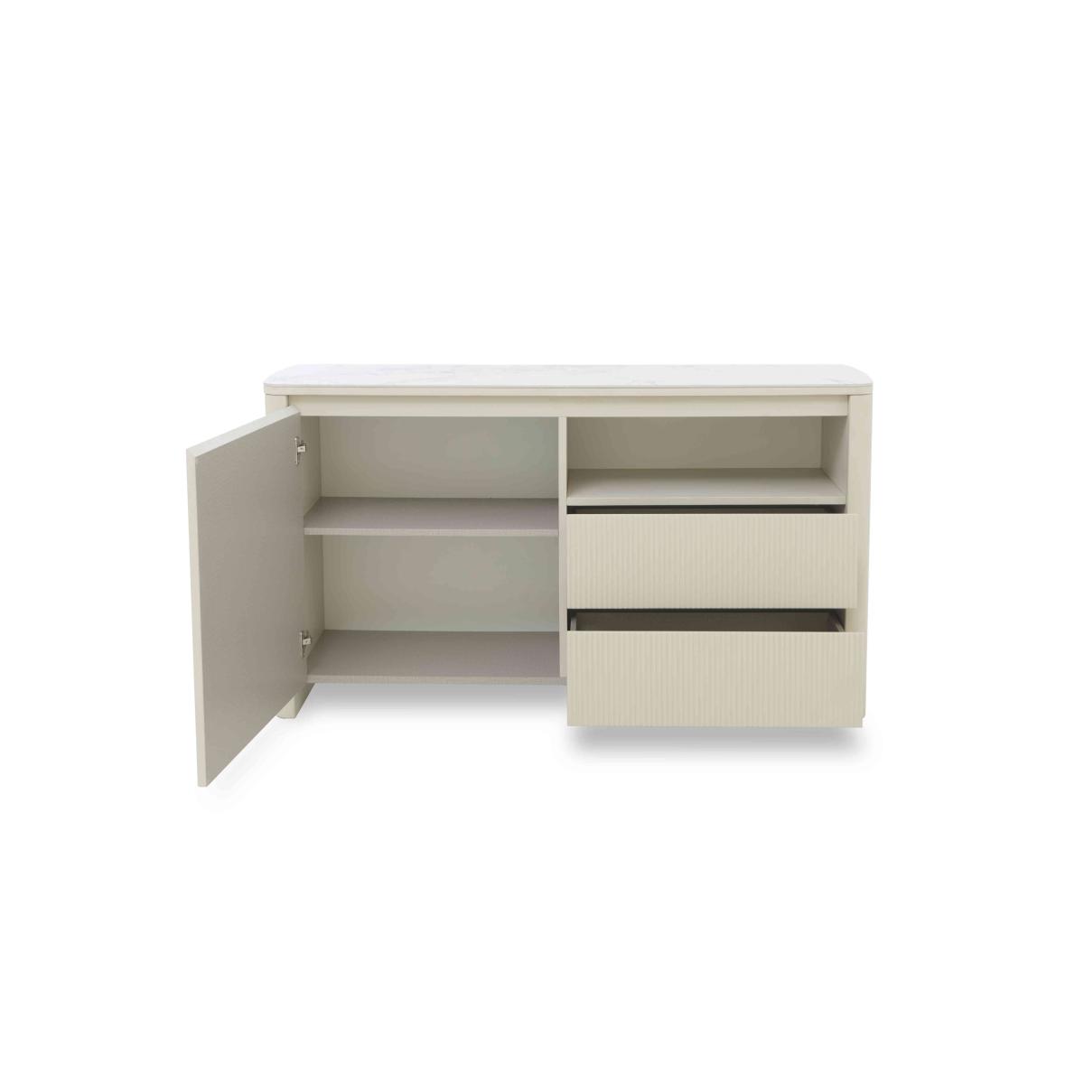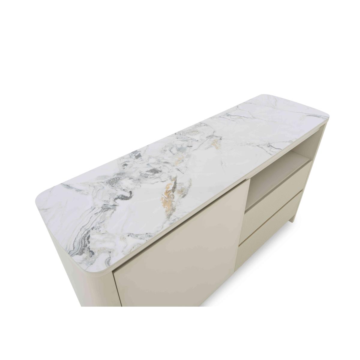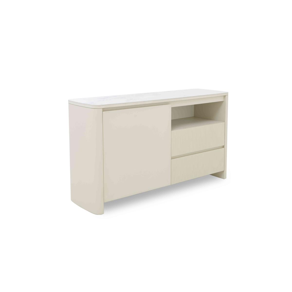 All the high-end style of marble furniture, all the family-friendly durability of ceramic, and all at a great-value price – our Avorio range makes it easy to furnish living and dining spaces in glossy ceramic style. The collection includes both fixed and extending dining tables – and we think you’ll love those slick pop-up and swivel extension mechanisms – dining sets, dining chairs and bar stools, occasional tables, media cabinets and more. Storage and display pieces have sleek rounded edges and decorative fluting that matches the tables’ pedestal bases as well as alcoves and shelves with built-in LED lighting. The Avorio range is exclusive to Furniture Village. This glossy ceramic-topped sideboard brings style and storage to a smaller dining room. There's a display alcove with LED lighting, as well as cupboard and drawer storage. Why you'll love it Sleek ceramic style at a great-value price. Glossy marble-effect ceramic top is applied by hand. Space-saving, compact and a great choice for stylish family homes. Ceramic is very durable – it’s heatproof and scratch- and chip-resistant. Integrated LED lighting makes a real feature of this sideboard’s alcove. Curved sides and fluted drawer fronts. Spacious storage with soft-closing drawers and cupboard door. Only at Furniture Village. This small sideboard is part of our Avorio range. What you need to know 2 drawers. 1 cupboard with an adjustable shelf. Top is made of ceramic bonded to glass. This finish may show surface scratches under certain lighting. We recommend using coasters and placemats at all times. Easy to care for. Simply wipe with a clean damp cloth. WARNING!