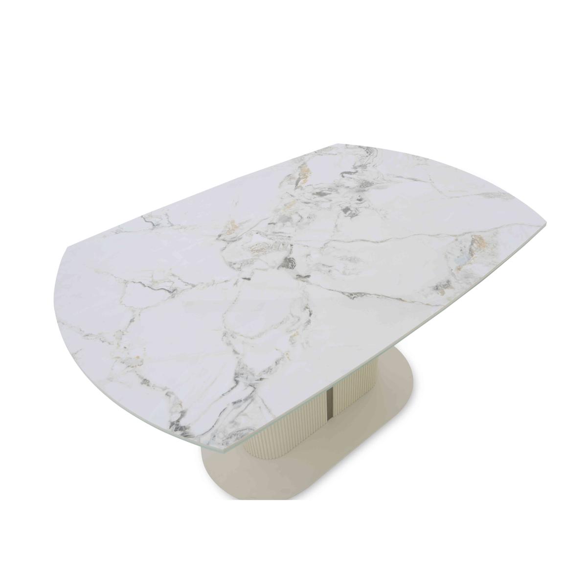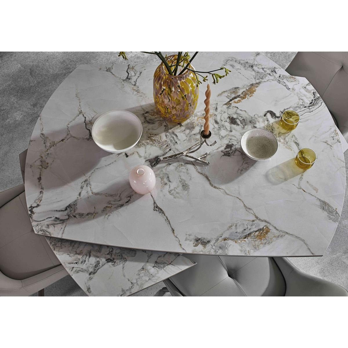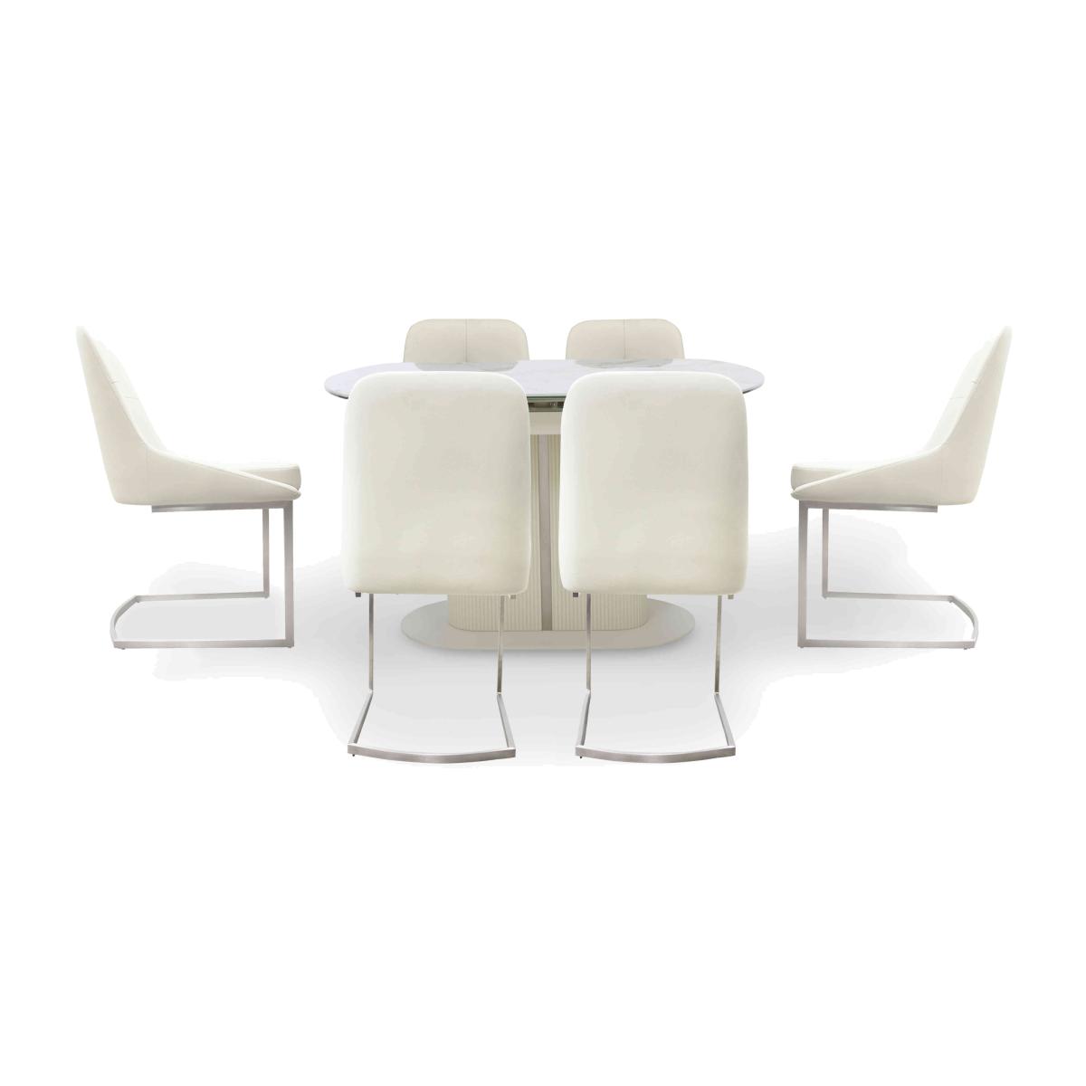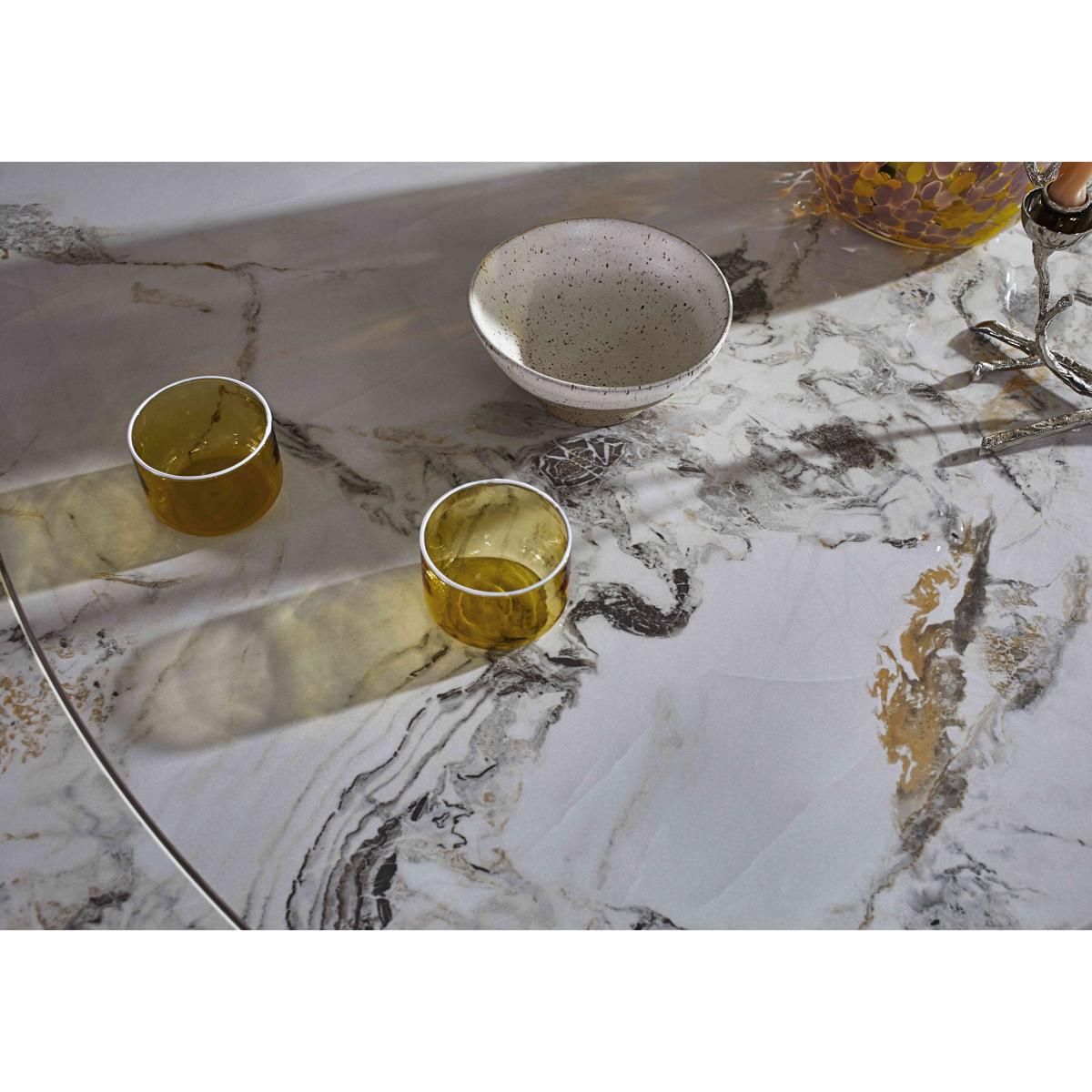 All the high-end style of marble furniture, all the family-friendly durability of ceramic, and all at a great-value price – our Avorio range makes it easy to furnish living and dining spaces in glossy ceramic style. The collection includes both fixed and extending dining tables – and we think you’ll love those slick pop-up and swivel extension mechanisms – dining sets, dining chairs and bar stools, occasional tables, media cabinets and more. Storage and display pieces have sleek rounded edges and decorative fluting that matches the tables’ pedestal bases as well as alcoves and shelves with built-in LED lighting. The Avorio range is exclusive to Furniture Village. This high-gloss dining table has a marble-patterned ceramic top and swivels to extend in one smooth motion. This dining set includes six cantilever dining chairs. Why you'll love it Sleek ceramic style at a great-value price. Glossy marble-effect ceramic top is applied by hand. Space-saving, compact and a great choice for stylish family homes. Ceramic is very durable – it’s heatproof and scratch- and chip-resistant. Simply rotate the swivel table top and it extends to seat 8. Pedestal base has a very cool fluted finish. Dining set includes 6 cantilever-base dining chairs. Neutral-coloured faux leather with elegant stitching and buttoning detail. Only at Furniture Village. This dining set is part of our Avorio range. What you need to know Chairs have metal frames and bases. Cushioned with foam. Table top is made of ceramic bonded to glass. Seats 6 and extends to seat 8. This finish may show surface scratches under certain lighting. We recommend using coasters and placemats at all times. Easy to care for. Simply wipe with a clean damp cloth.