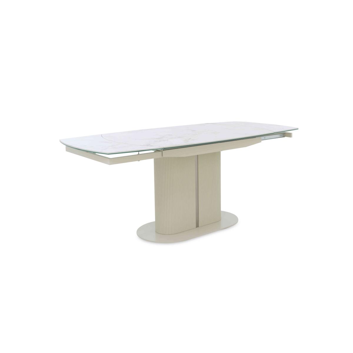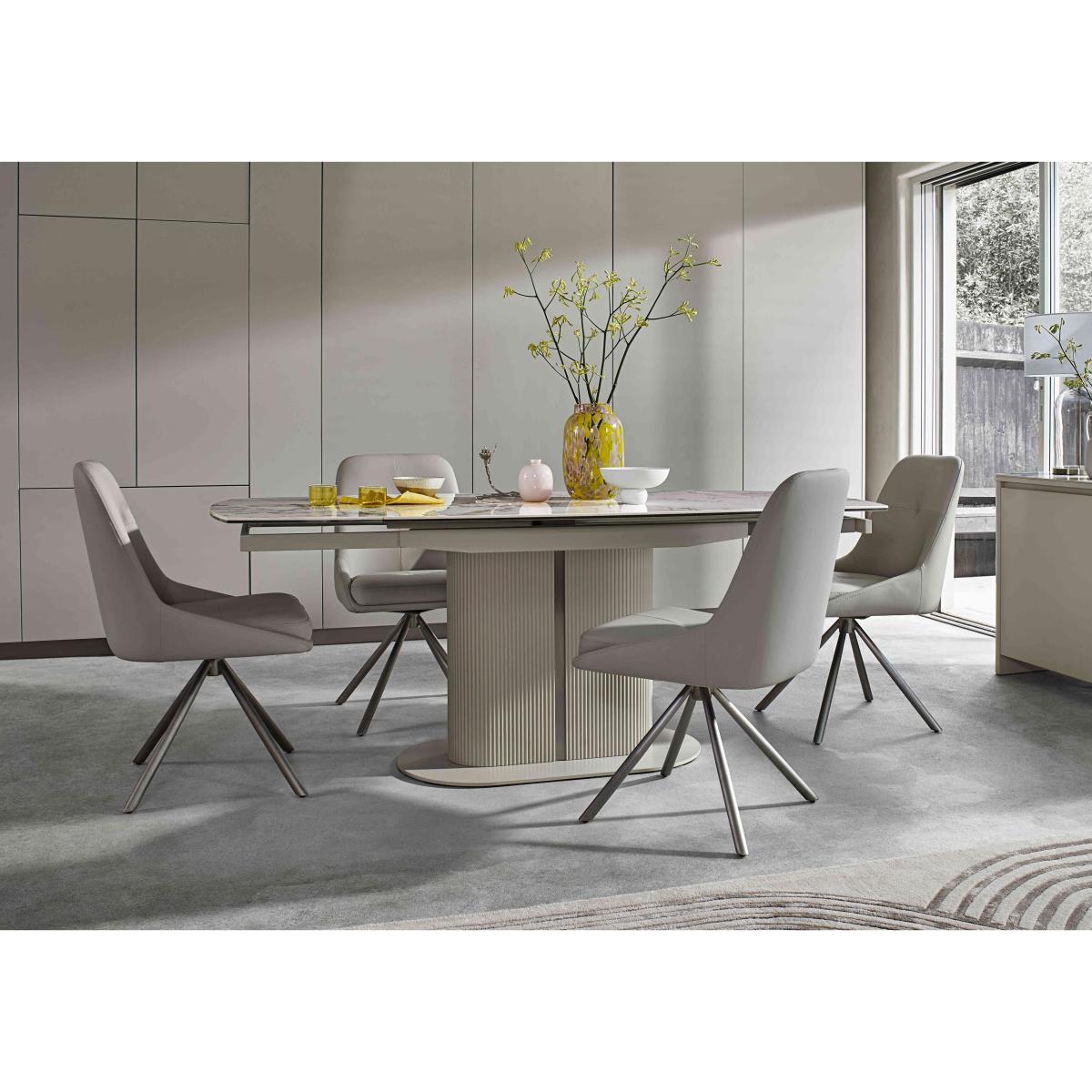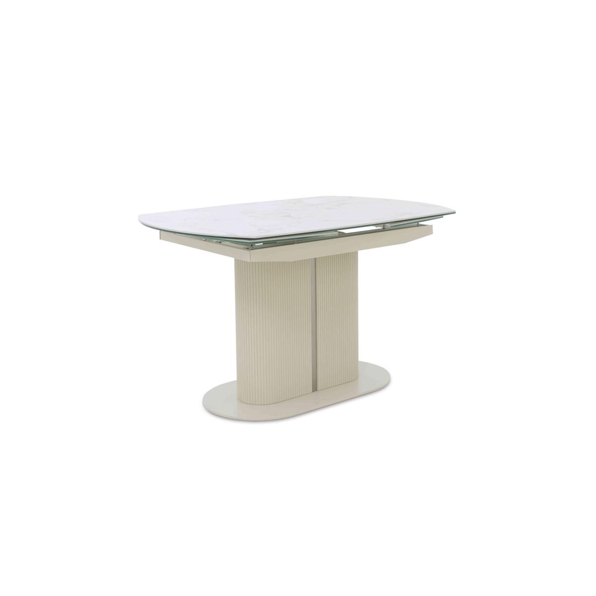 All the high-end style of marble furniture, all the family-friendly durability of ceramic, and all at a great-value price – our Avorio range makes it easy to furnish living and dining spaces in glossy ceramic style. The collection includes both fixed and extending dining tables – and we think you’ll love those slick pop-up and swivel extension mechanisms – dining sets, dining chairs and bar stools, occasional tables, media cabinets and more. Storage and display pieces have sleek rounded edges and decorative fluting that matches the tables’ pedestal bases as well as alcoves and shelves with built-in LED lighting. The Avorio range is exclusive to Furniture Village. This sleek ceramic-topped dining table has a super-cool swivel extension mechanism. Simply rotate the table top and it magically extends to seat eight. Why you'll love it Sleek ceramic style at a great-value price. Glossy marble-effect ceramic top is applied by hand. Space-saving, compact and a great choice for stylish family homes. Ceramic is very durable – it’s heatproof and scratch- and chip-resistant. Simply rotate the swivel table top and it extends to seat 8. Pedestal base has a very cool fluted finish. Only at Furniture Village. This swivel extending dining table is part of our Avorio range. What you need to know Top is made of ceramic bonded to glass. Seats 6 and extends to seat 8. This finish may show surface scratches under certain lighting. We recommend using coasters and placemats at all times. Easy to care for. Simply wipe with a clean damp cloth.
