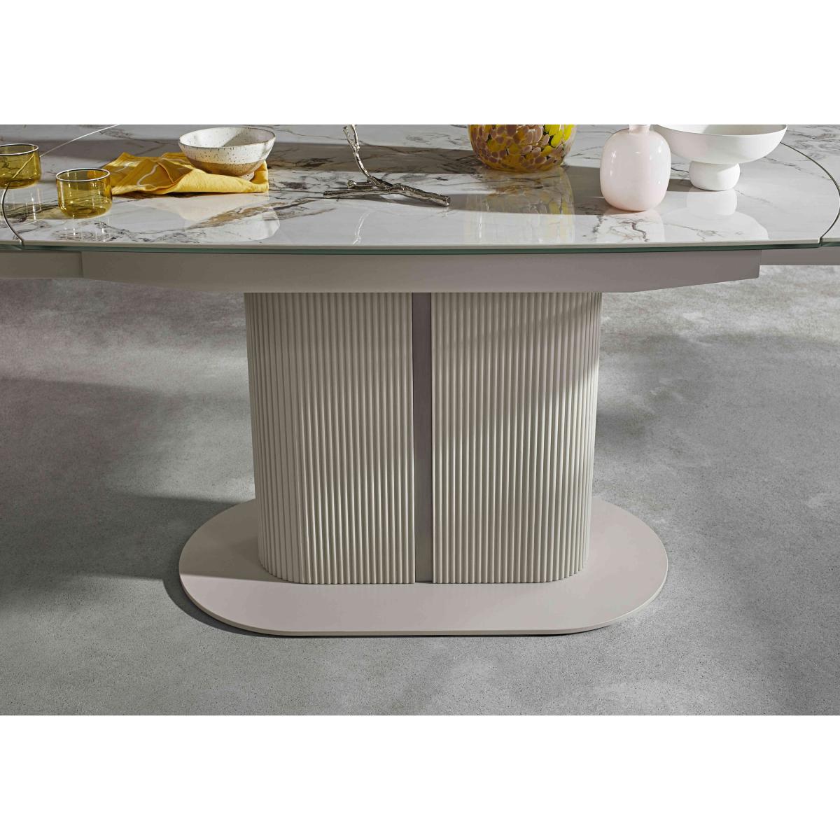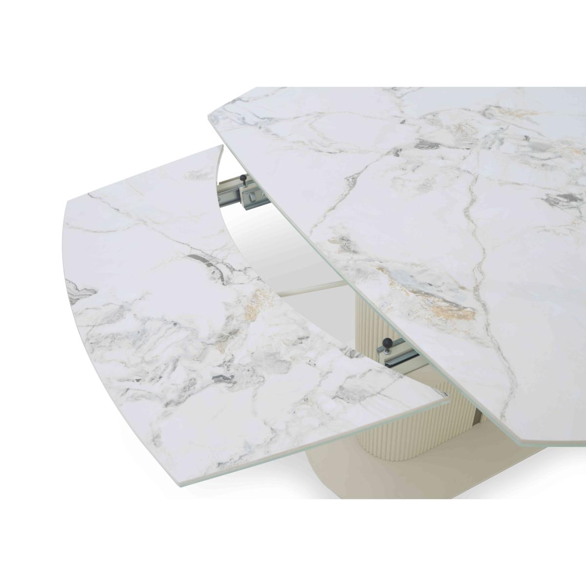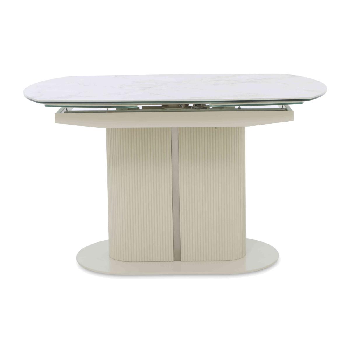 All the high-end style of marble furniture, all the family-friendly durability of ceramic, and all at a great-value price – our Avorio range makes it easy to furnish living and dining spaces in glossy ceramic style. The collection includes both fixed and extending dining tables – and we think you’ll love those slick pop-up and swivel extension mechanisms – dining sets, dining chairs and bar stools, occasional tables, media cabinets and more. Storage and display pieces have sleek rounded edges and decorative fluting that matches the tables’ pedestal bases as well as alcoves and shelves with built-in LED lighting. The Avorio range is exclusive to Furniture Village. This sleek ceramic-topped dining table has a super-cool swivel extension mechanism. Simply rotate the table top and it magically extends to seat eight. Why you'll love it Sleek ceramic style at a great-value price. Glossy marble-effect ceramic top is applied by hand. Space-saving, compact and a great choice for stylish family homes. Ceramic is very durable – it’s heatproof and scratch- and chip-resistant. Simply rotate the swivel table top and it extends to seat 8. Pedestal base has a very cool fluted finish. Only at Furniture Village. This swivel extending dining table is part of our Avorio range. What you need to know Top is made of ceramic bonded to glass. Seats 6 and extends to seat 8. This finish may show surface scratches under certain lighting. We recommend using coasters and placemats at all times. Easy to care for. Simply wipe with a clean damp cloth.