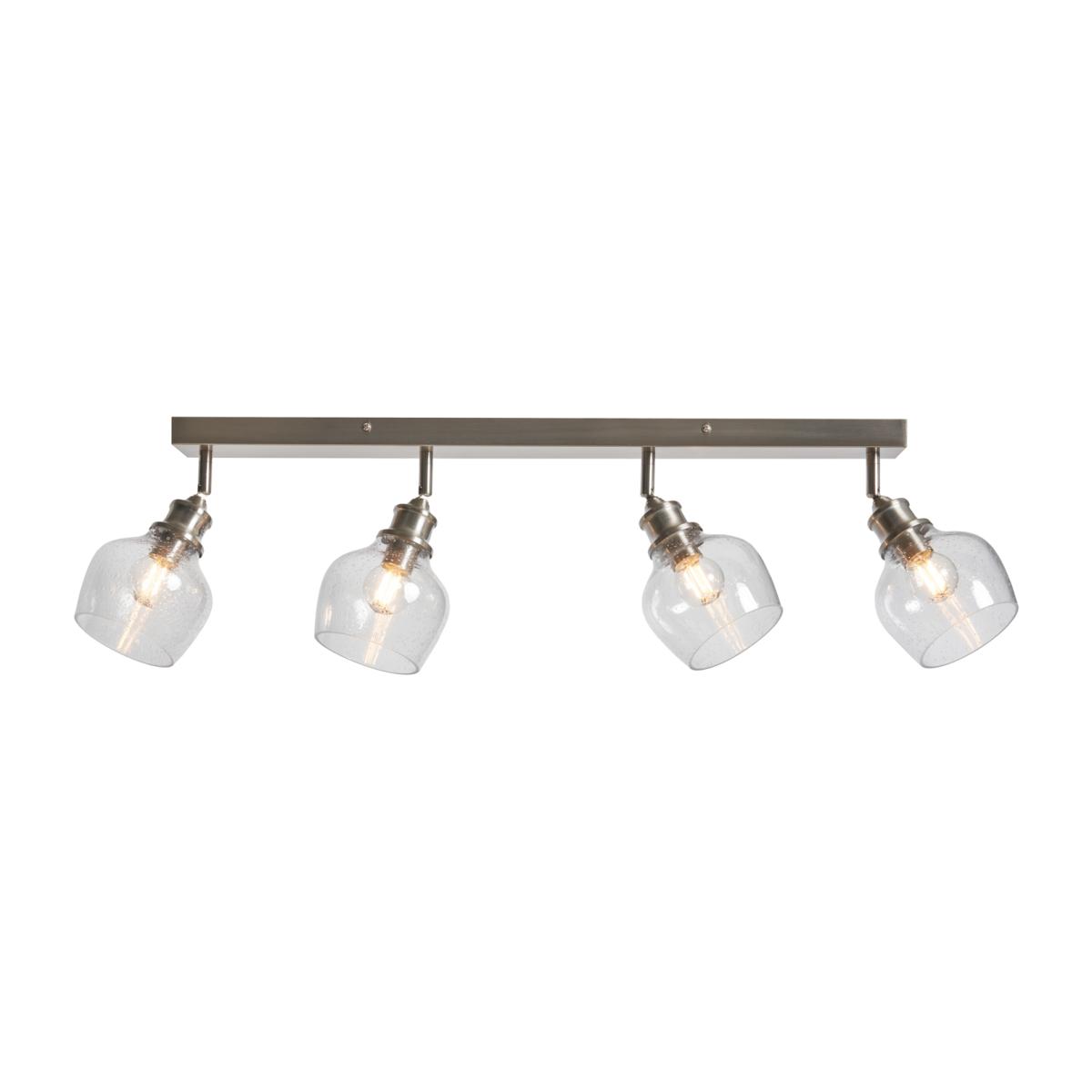 Add directional lighting to your home with the Avril 4 Light Spotlight Bar in satin nickel. Each adjustable spotlight has a gorgeous clear glass shade with bubble-effect details and allows you to highlight different zones, countertops or features in your space. Its sleek, modern finish is ideal for kitchens, hallways, or workspaces needing focused illumination.