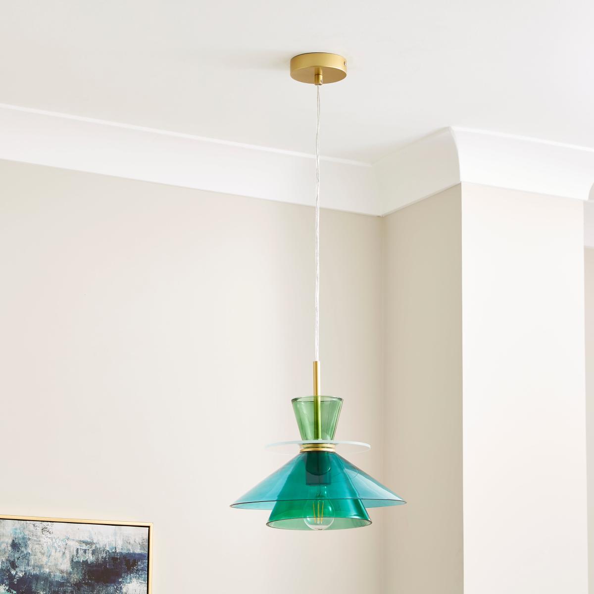 I really like this blue glass pendant fitting for its playful yet sophisticated look. It works particularly well in contemporary or eclectic interiors where colour pops are welcomed, such as a neutral living room or a quirky kitchen. The layered glass design adds visual interest without overpowering the space, making it a good choice for overhead lighting in dining areas or above a breakfast bar. When styling, consider pairing it with other blue or glass accents to create a cohesive look, or let it stand out as a statement piece. Height adjustment is key - hang it at a practical level, ensuring it doesn’t obstruct views or movement, but also showcases its design details. Overall, a versatile piece that can elevate the character of a variety of rooms.