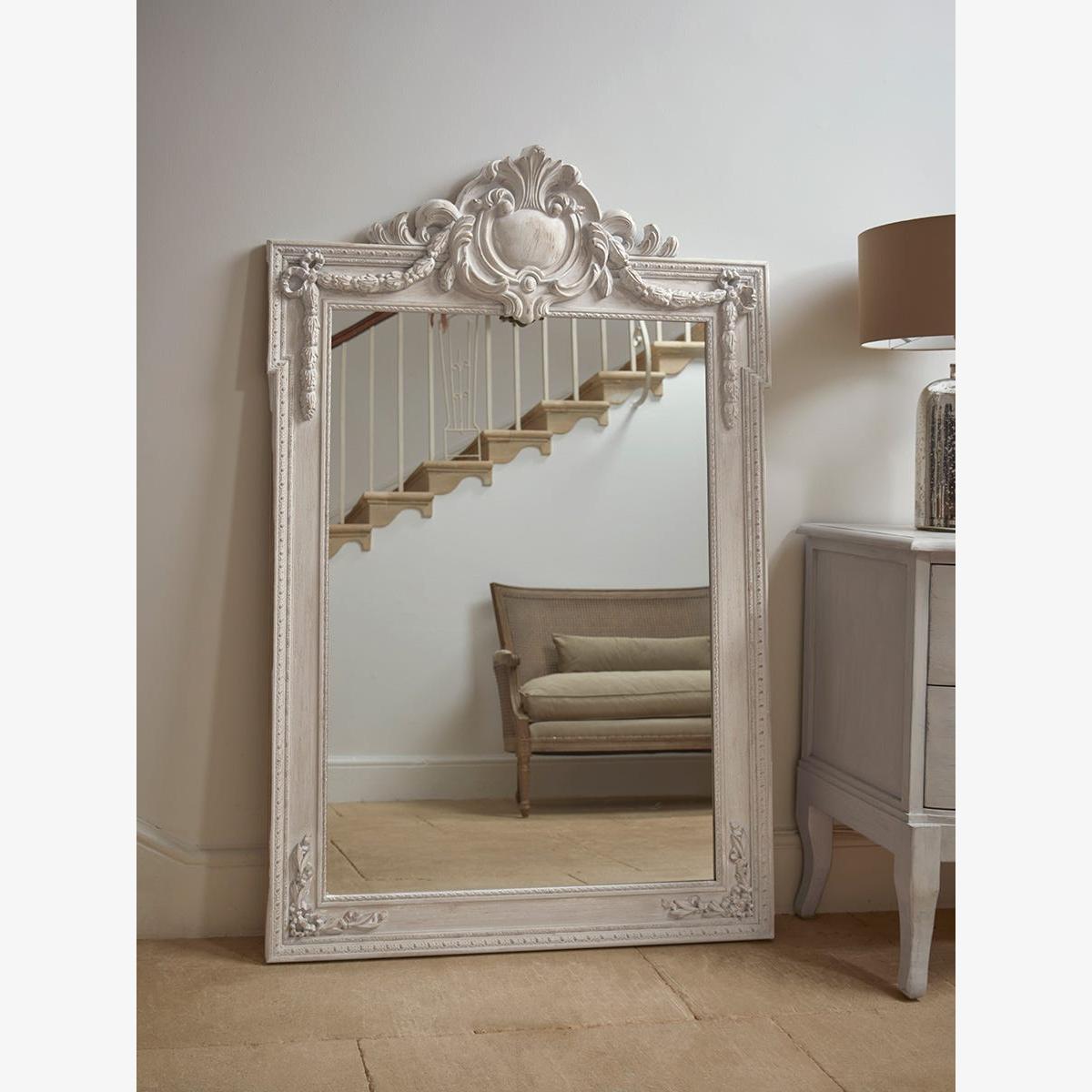 Intricately carved, with swags descending from an imposing central motif, this large mirror is full of charm. The lightly distressed finish to the wooden frame gives it a vintage appeal that will bring elegance to any setting.