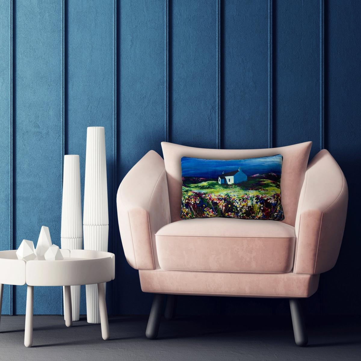 This cushion is a great choice to introduce a pop of colour and texture into a space. The rich blue velvet adds a sense of luxury and works particularly well in contemporary or classic interiors that embrace bold accents. It pairs nicely with neutral tones to create a focal point or complements other blues and jewel tones for a cohesive look. For styling tips, try layering it with patterned or textured cushions on a sofa or armchair to add visual interest. It’s also versatile enough to work in bedrooms or even outdoor covered seating areas, where the vibrant artwork-inspired design can truly stand out. Just keep the placement simple to let the vivid scene be the highlight.
