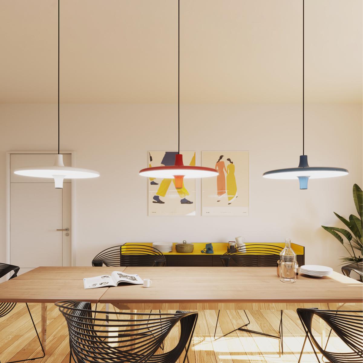 This lamp is essential for remote working and helps when using electrical equipment! Thanks to AVRO, your hunt for a wall socket is over: eat, work or play, all at the same table. Remote working has become increasingly common and has completely changed our way of working and living. Studio Natural designed the AVRO pendant light with remote working in mind, creating a elegant, understated light with a concealed socket in the lower part of its diffuser. The Avro pendant light features a stylish, practical, aluminium design consisting of a 70's style lampshade in the shape of a spinning top. The opaline methacrylate diffuser, below the disc, provides a uniform, practical, non-dazzling light. There's an integrated plug under the diffuser so you can plug in your electronic devices. This ingenious system frees you from the constraints of wall sockets, allowing you to plug in your electronic devices while enjoying continued access to light. The Avro pendant light is ideal suspended over a table, desk or work surface and has been designed to facilitate everyday activities in the home, whether eating, working or playing. Avro allows you to transform your dining table, desk or kitchen work top into a practical space to encourage creativity. You can even add a power strip for easier access to electric outlets. Avro works well in all spaces: study, bedroom, sitting room, kitchen etc. Its retro design contrasts with its innovative features to offer a light that adapts to suit your needs. The integrated LED light source (2700. K, 5000lm, 36. W) is dimmable.