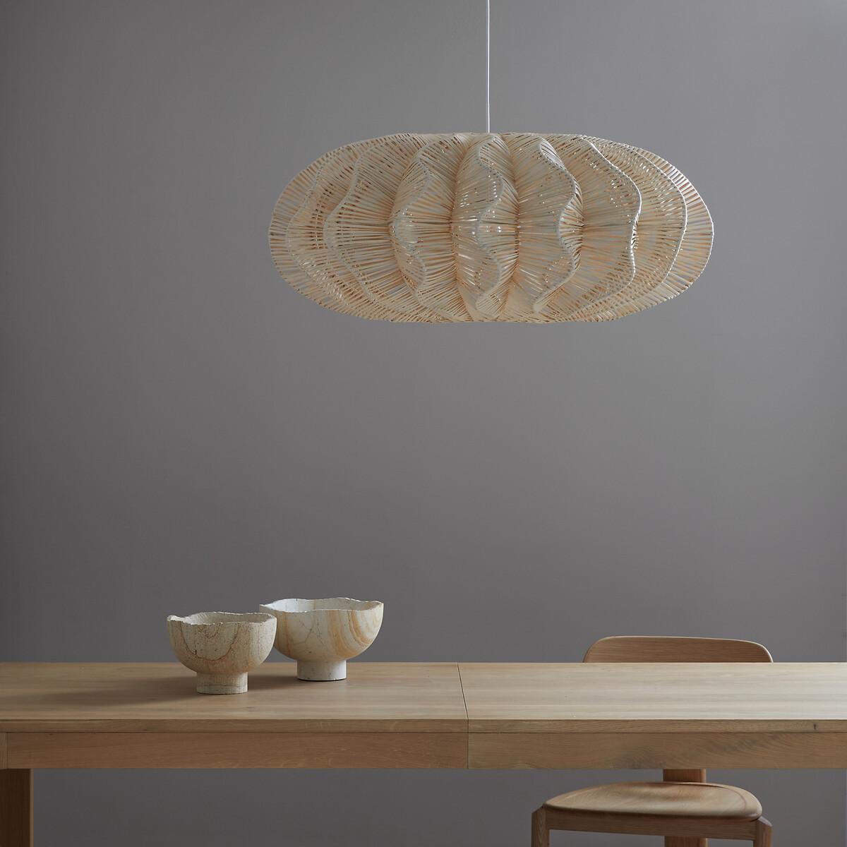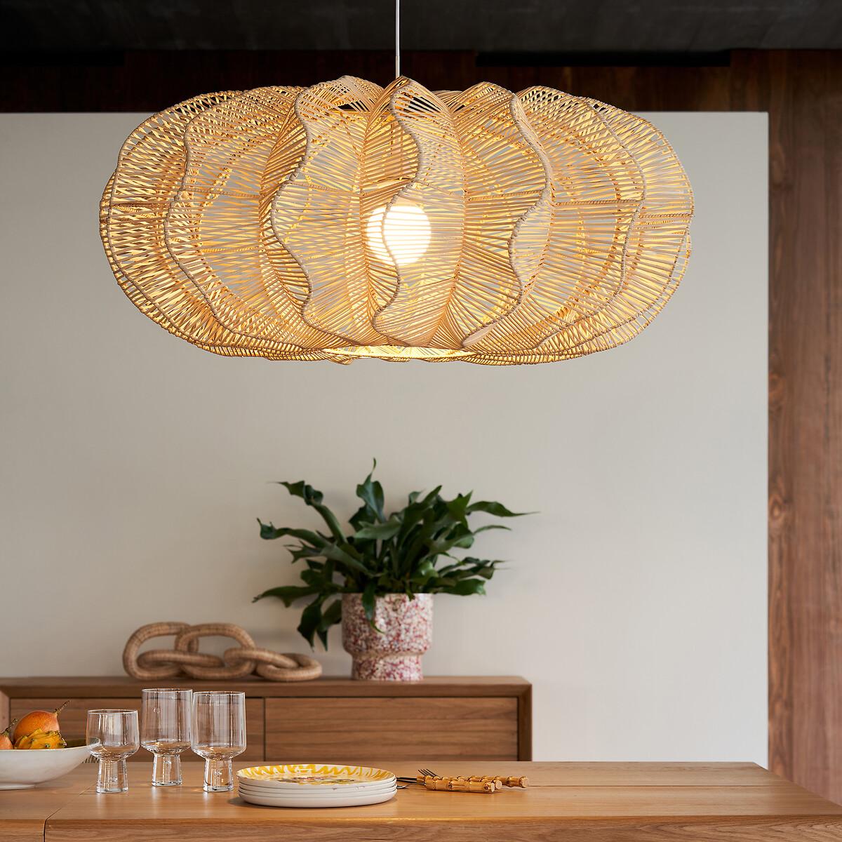 I love this hanging lamp for its natural, artisanal feel and warm, diffused glow-perfect for bringing texture and warmth to a variety of interiors. It works particularly well in pared-back, minimalist spaces, boho, or coastal schemes, where its woven rattan detail can add a touch of organic character. For styling tips, consider pairing it with wooden or neutral-toned furniture and accessories to emphasise its natural vibe. It also looks great when hung centrally over dining tables or breakfast bars, creating a cosy, inviting atmosphere. Practical advice: ensure the cord length is adjustable to perfect the placement, and pair with warm-toned bulbs for enhanced ambience.