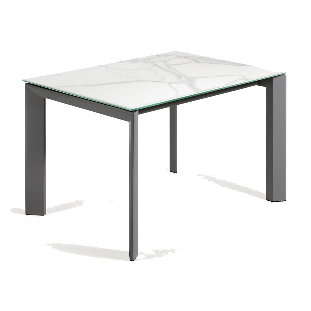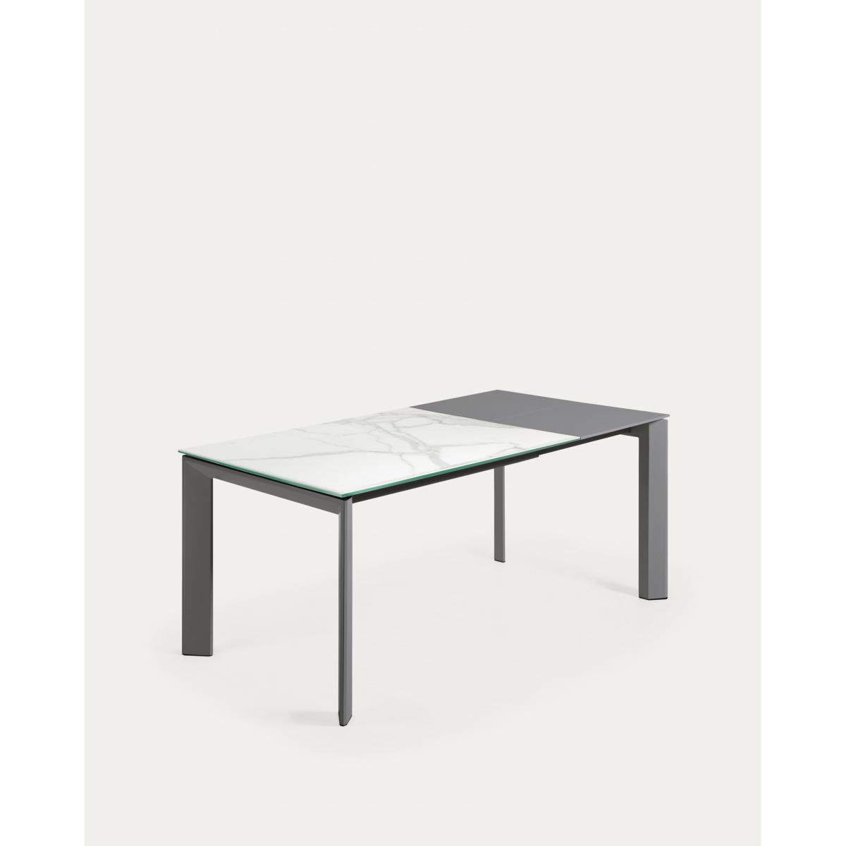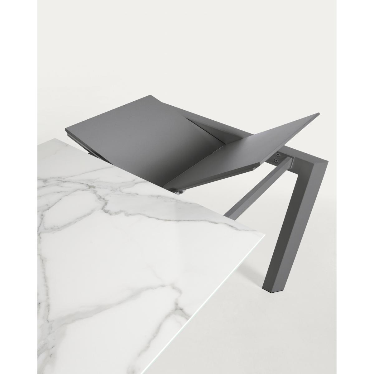 I love this dining table because of its sleek, minimalist design and practical extendable feature, making it versatile for both everyday meals and larger gatherings. The porcelain top in Kalos Blanco keeps the look fresh and modern, while the dark grey legs add a touch of sophistication. It works particularly well in contemporary or Scandinavian interiors, where clean lines and neutral tones are key. For styling, consider pairing it with upholstered dining chairs in muted colours or textured fabrics to add warmth. The extendable feature allows for flexible space use, so it can adapt easily if you frequently host or need a cosy spot for family dinners. Overall, it’s a functional piece with a polished finish that elevates any dining space.