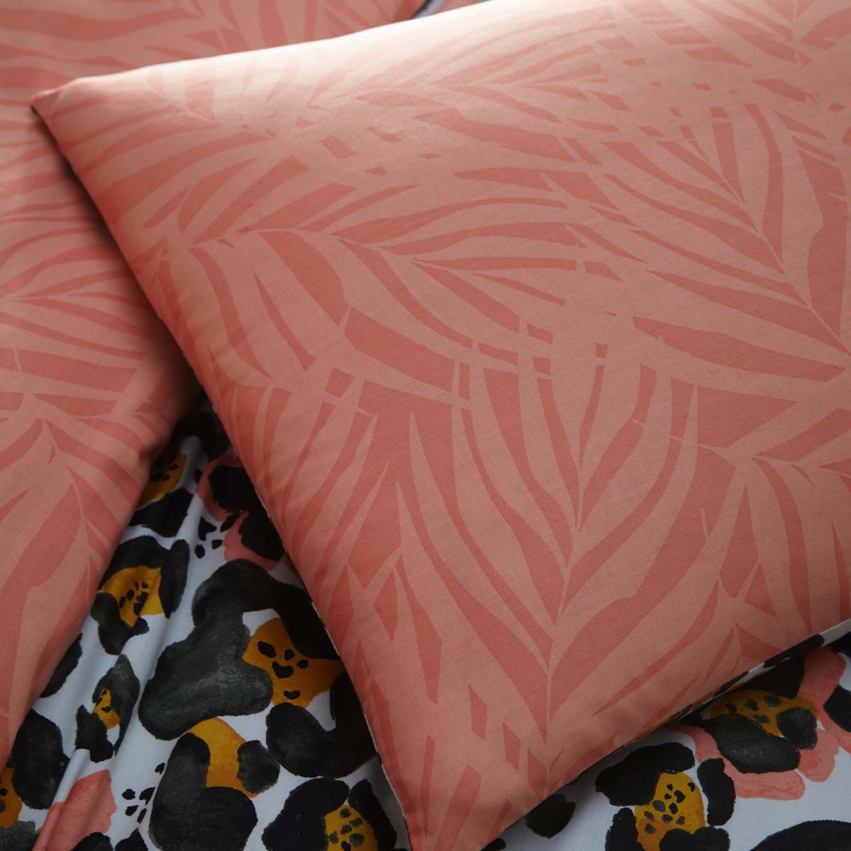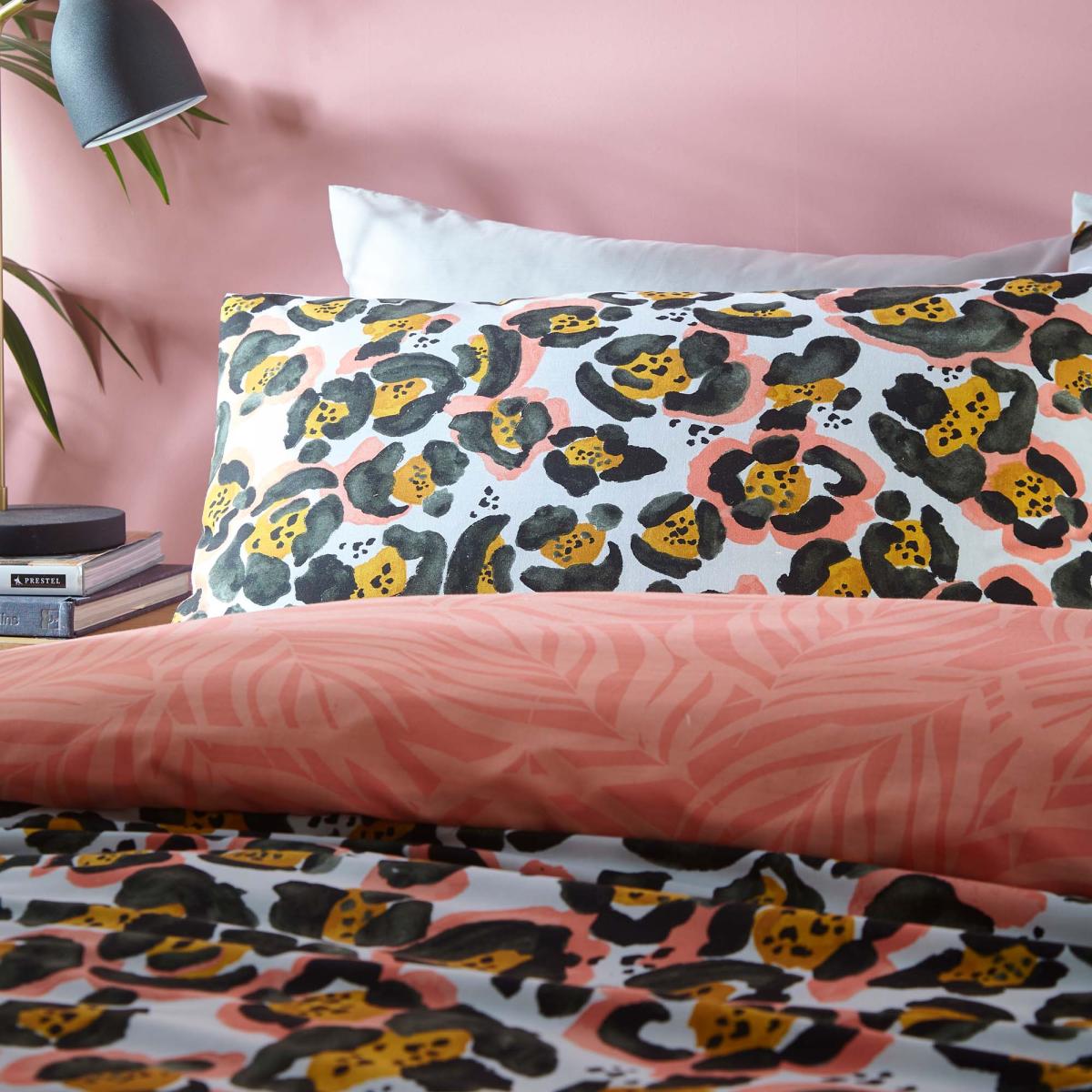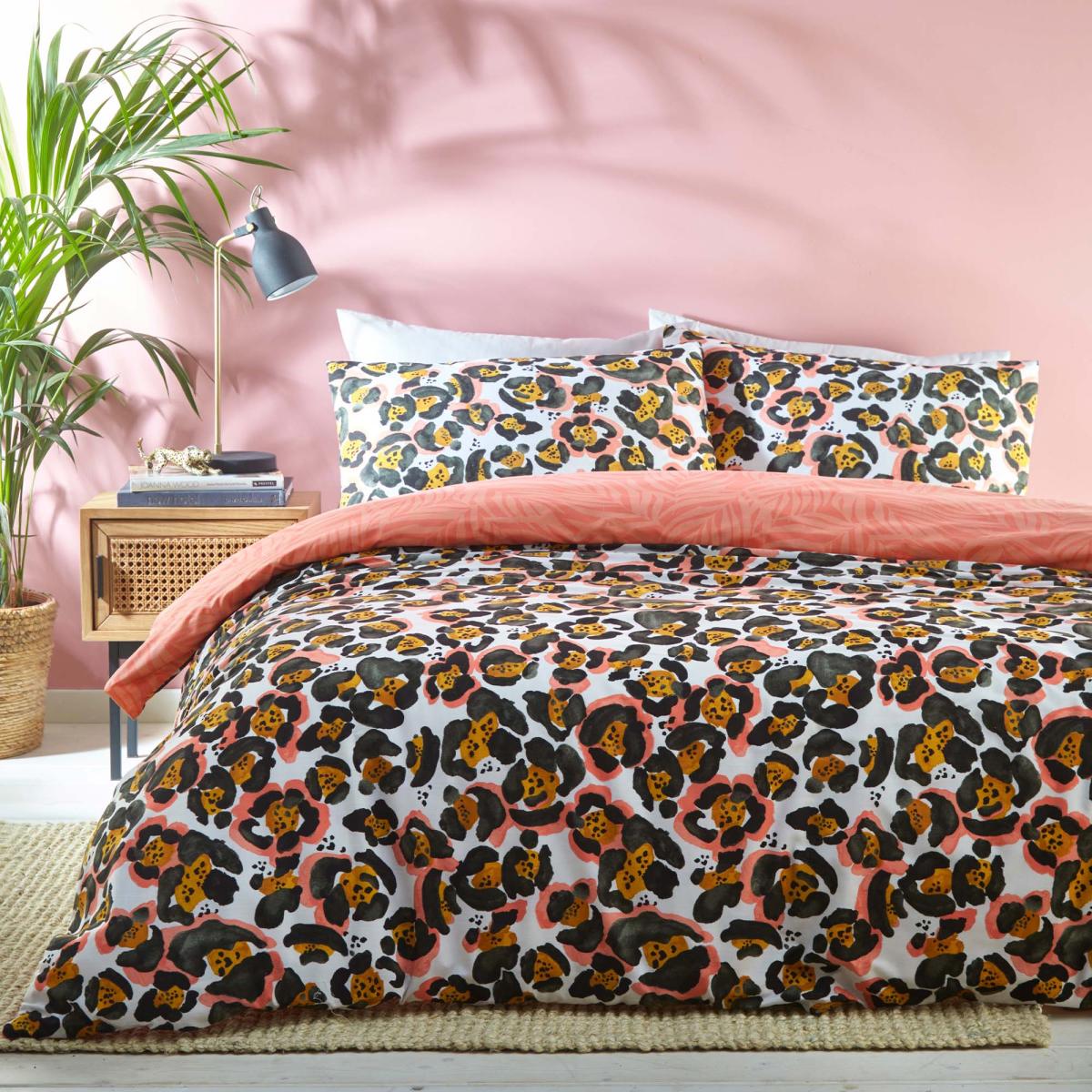 Featuring a lively leopard print themed duvet set in bright coral tones. This vivid animal design and tonal tropical leaf combination is great for versatility with its reversible feature and matching pillow. The energetic tones will brighten up any room while machine washable properties allow easy maintenance and the composition of crisp polycotton provides a soft and hard-wearing feel.