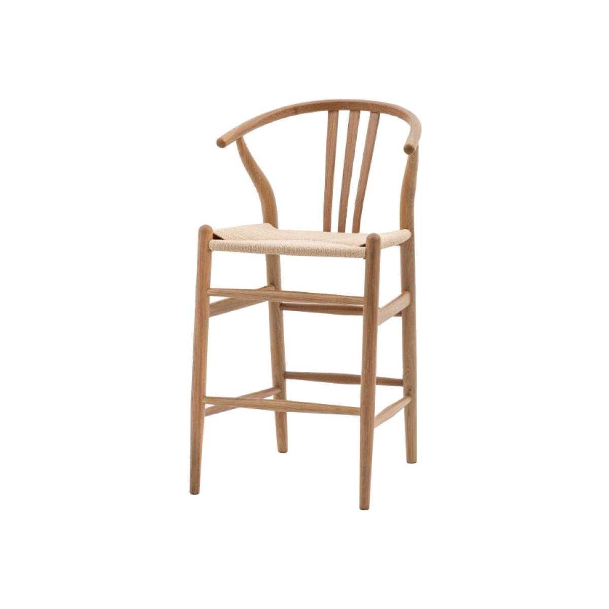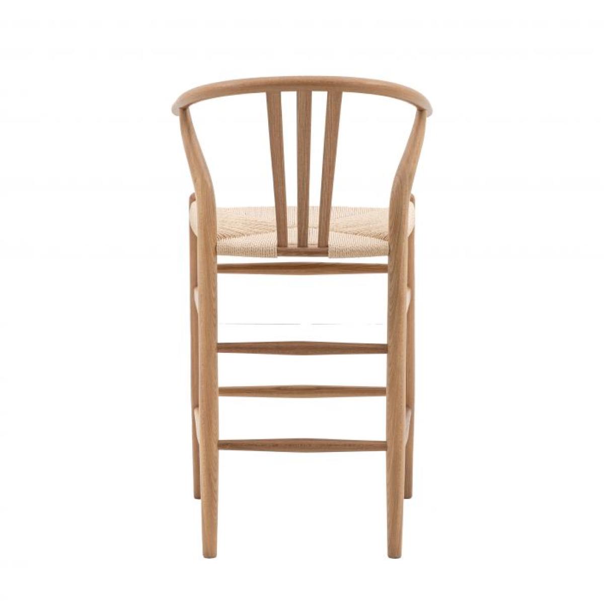 Set of 2 stand out wishbone back bar stools, perfect for modern or vintage inspired kitchens and dining spaces. A contemporary twist on a classic design, this bar stool features elegant sleek lines, a deeply curved back and a distinctive hand woven seat. Material:Elm / Kraft Paper. Colour/Finish: Natural.