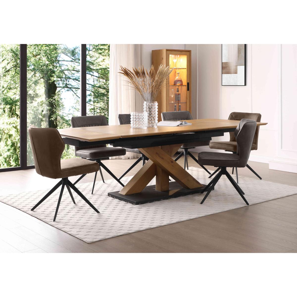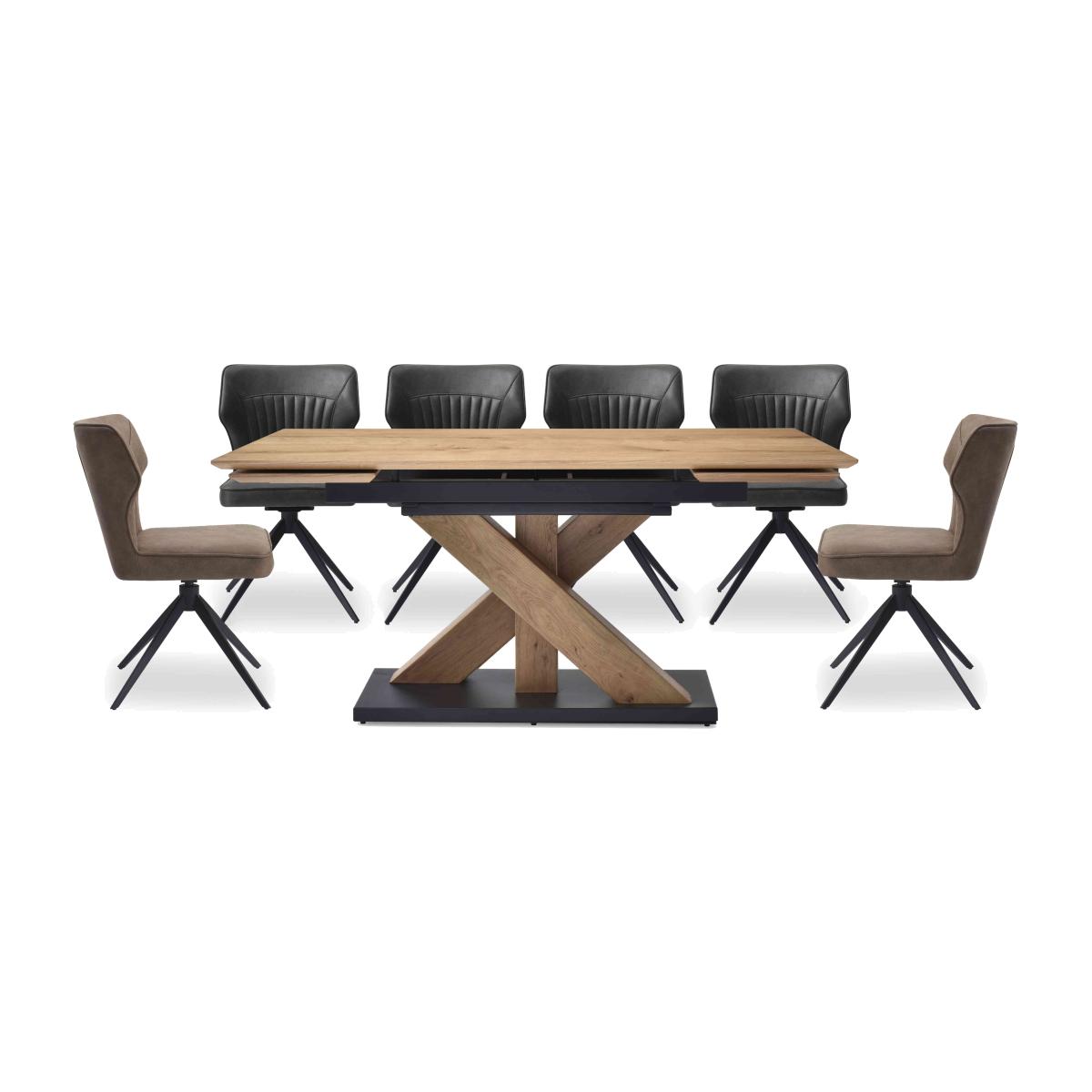 This modern dining set features our large Aydin extending dining table with six swivel dining chairs, four upholstered in dark grey and two in light brown for a fashionably eclectic look. Why you'll love it A stylish fusion of modern, urban and industrial furniture trends. Wonderful craftsmanship at a fantastic-value price. Built to last, this is the perfect dining set for families and entertaining. Extending table has a stunning oak veneer top with authentic grain, texture and markings. So easy to extend – 2 extra leaves simply pull out from the table ends. When extended, the extra leaves perfectly match the top’s oak patterning. Statement base with black metal plinth. Set includes 6 shapely swivel-base dining chairs with on-trend stitching detail. Chairs have soft faux leather upholstery – 4 in dark grey and 2 in light brown. Handcrafted. A Furniture Village exclusive. This dining set is part of our Aydin range. What you need to know Dining chairs have metal frames and legs, foam seat cushioning. Large extending dining table seats 8 and extends to seat 10. Every piece of veneer or solid wood has unique and natural marks, knots and colour variation. Avoid placing in direct sunlight or close to a heat source. We recommend using coasters and placemats at all times. Be sure to browse the full range of Aydin living room and dining room furniture.