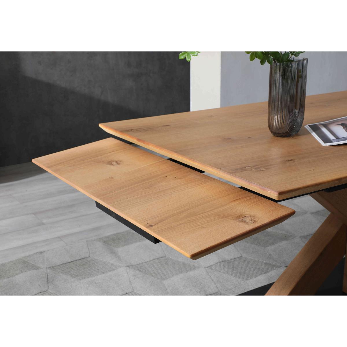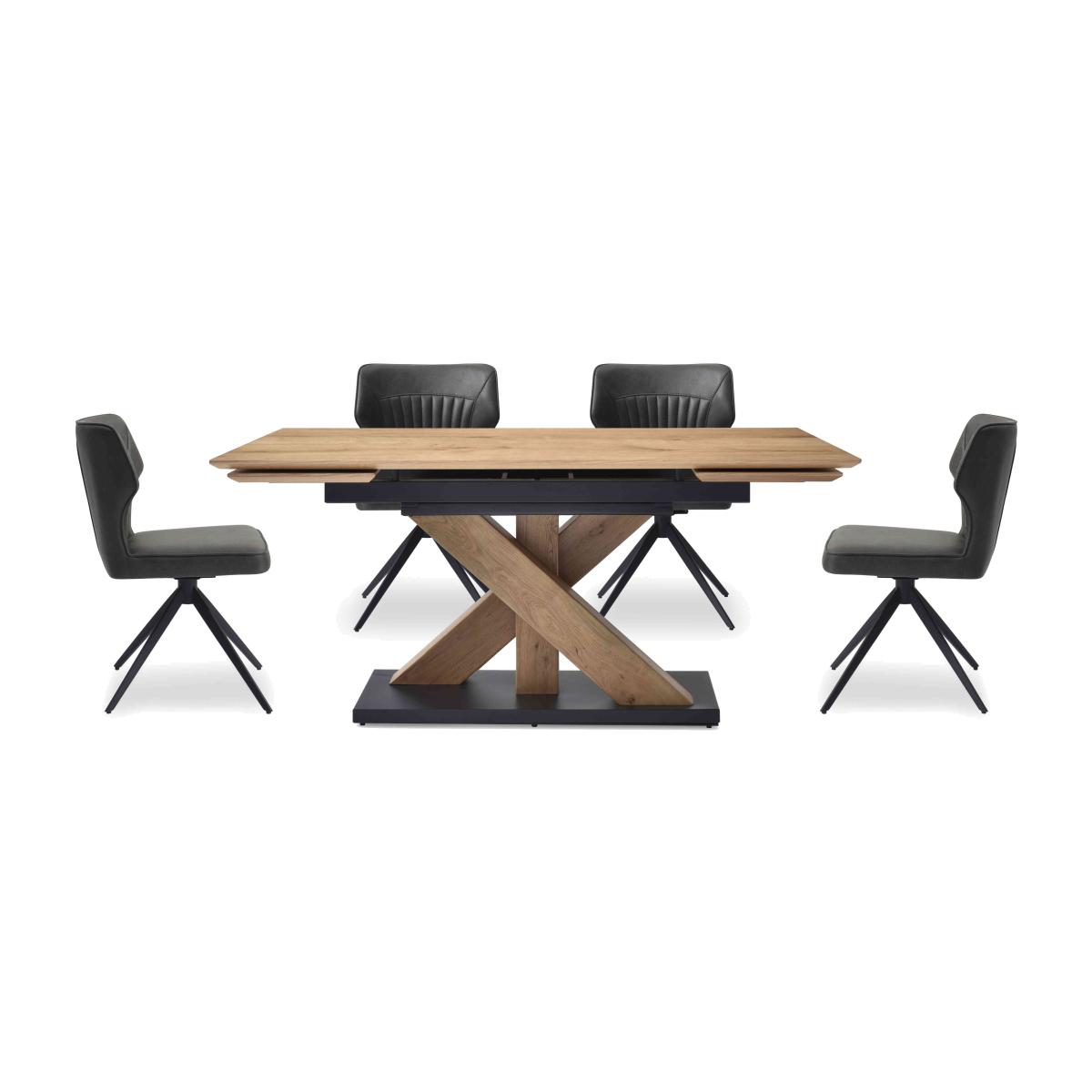 The extending dining table in this modern industrial dining set comes with four swivel-base dining chairs. A perfect example of on-trend modern design. Why you'll love it A stylish fusion of modern, urban and industrial furniture trends. Wonderful craftsmanship at a fantastic-value price. Built to last, this is the perfect dining set for families and entertaining. Extending table has a stunning oak veneer top with authentic grain, texture and markings. So easy to extend – 2 extra leaves simply pull out from the table ends. When extended, the extra leaves perfectly match the top’s oak patterning. Statement base with black metal plinth. Set includes 4 shapely swivel-base dining chairs with on-trend stitching detail. Soft faux leather upholstery in a choice of colours. Handcrafted. A Furniture Village exclusive. This dining set is part of our Aydin range. What you need to know Dining chairs have metal frames and legs, foam seat cushioning. This large extending dining table seats 8 and extends to seat 10. Every piece of veneer or solid wood has unique and natural marks, knots and colour variation. Avoid placing in direct sunlight or close to a heat source. We recommend using coasters and placemats at all times. Be sure to browse the full range of Aydin living room and dining room furniture.