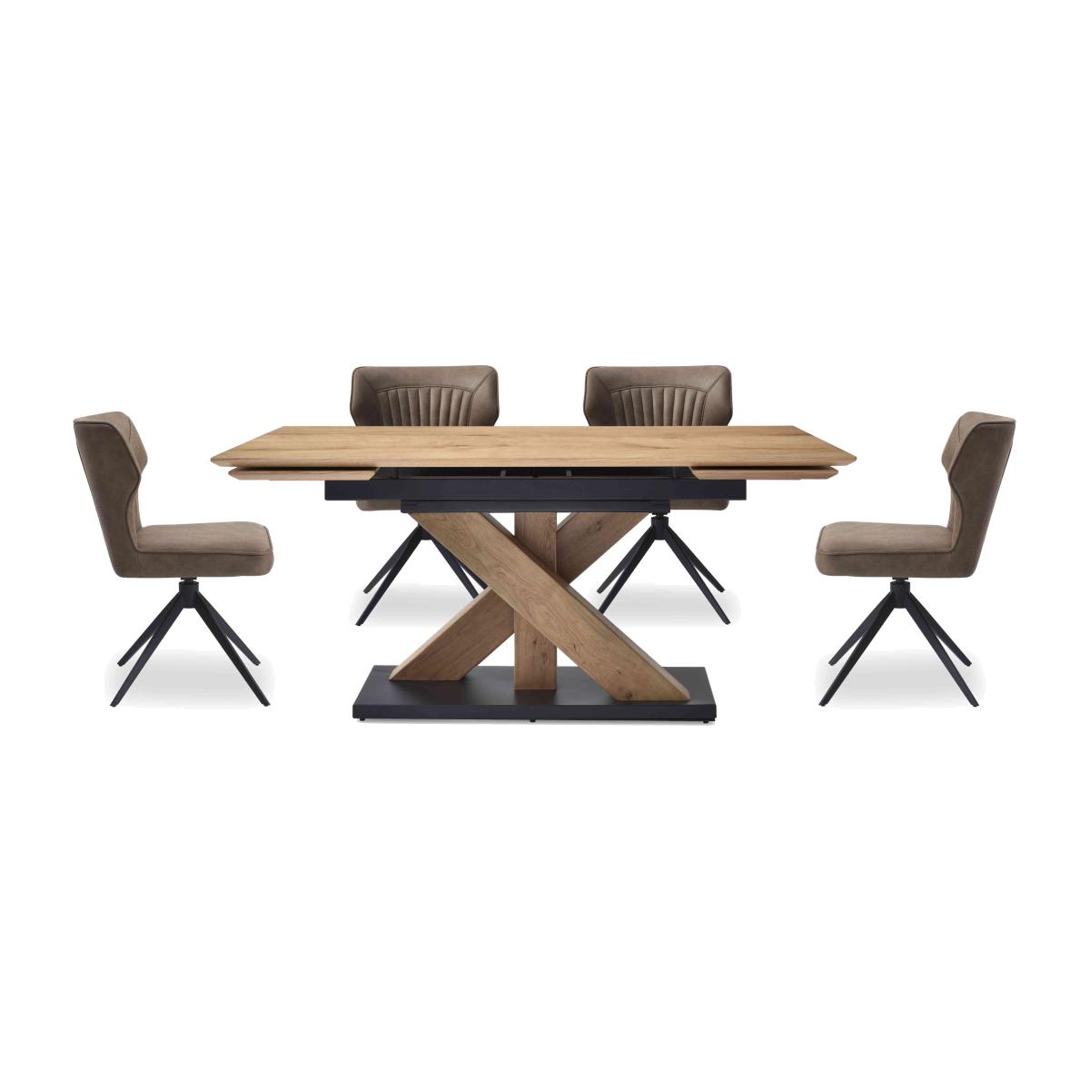 The extending dining table in this modern industrial dining set comes with four swivel-base dining chairs. A perfect example of on-trend modern design. Why you'll love it A stylish fusion of modern, urban and industrial furniture trends. Wonderful craftsmanship at a fantastic-value price. Built to last, this is the perfect dining set for families and entertaining. Extending table has a stunning oak veneer top with authentic grain, texture and markings. So easy to extend – 2 extra leaves simply pull out from the table ends. When extended, the extra leaves perfectly match the top’s oak patterning. Statement base with black metal plinth. Set includes 4 shapely swivel-base dining chairs with on-trend stitching detail. Soft faux leather upholstery in a choice of colours. Handcrafted. A Furniture Village exclusive. This dining set is part of our Aydin range. What you need to know Dining chairs have metal frames and legs, foam seat cushioning. This large extending dining table seats 8 and extends to seat 10. Every piece of veneer or solid wood has unique and natural marks, knots and colour variation. Avoid placing in direct sunlight or close to a heat source. We recommend using coasters and placemats at all times. Be sure to browse the full range of Aydin living room and dining room furniture.