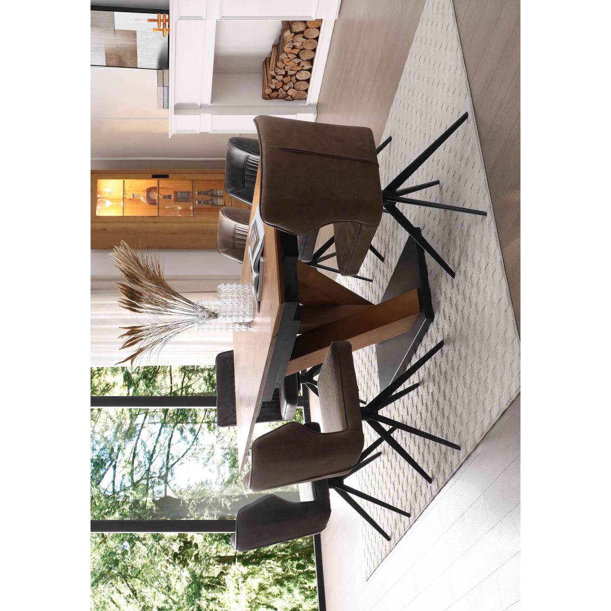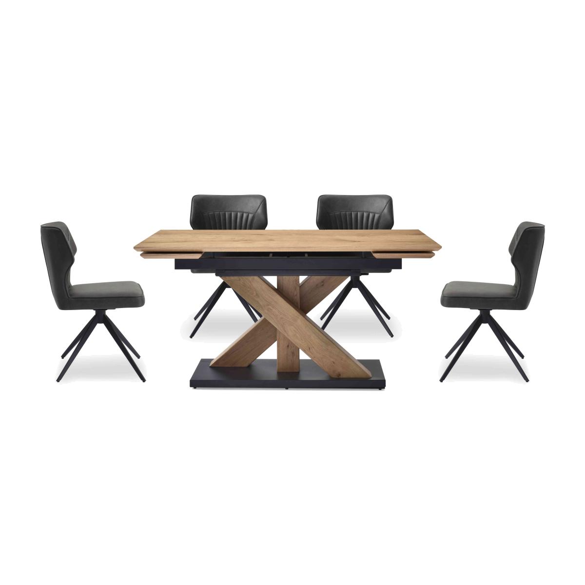 Fusing on-trend design styles, this dining set features an oak veneer extending dining table and four swivel-base dining chairs. Why you'll love it A stylish fusion of modern, urban and industrial furniture trends. Wonderful craftsmanship at a fantastic-value price. Built to last, this is the perfect dining set for families and entertaining. Extending table has a stunning oak veneer top with authentic grain, texture and markings. So easy to extend – 2 extra leaves simply pull out from the table ends. When extended, the extra leaves perfectly match the top’s oak patterning. Statement base with black metal plinth. Set includes 4 shapely swivel-base dining chairs with on-trend stitching detail. Soft faux leather upholstery in a choice of colours. Handcrafted. A Furniture Village exclusive. This dining set is part of our Aydin range. What you need to know Dining chairs have metal frames and legs, foam seat cushioning. This small extending dining table seats 6 and extends to seat 8. Every piece of veneer or solid wood has unique and natural marks, knots and colour variation. Avoid placing in direct sunlight or close to a heat source. We recommend using coasters and placemats at all times. Be sure to browse the full range of Aydin living room and dining room furniture.
