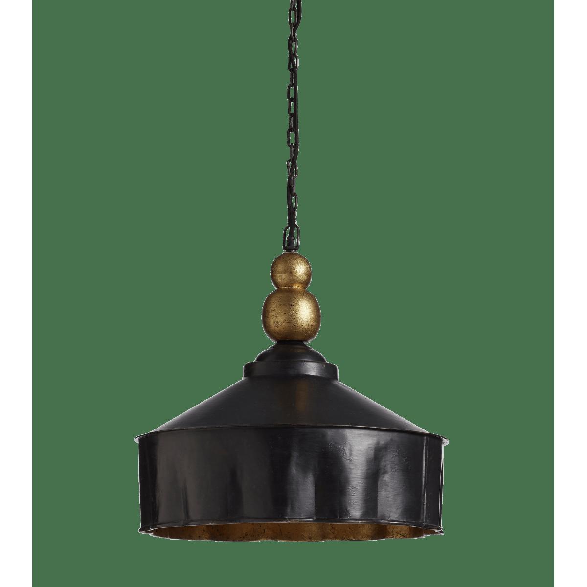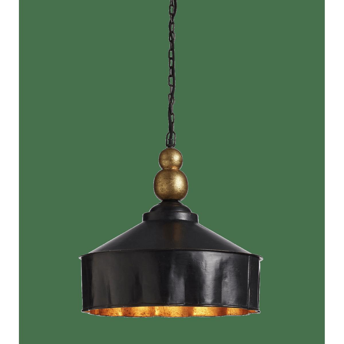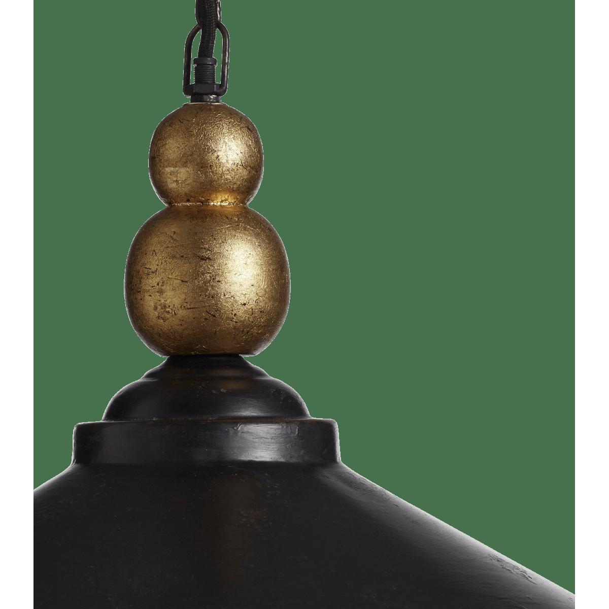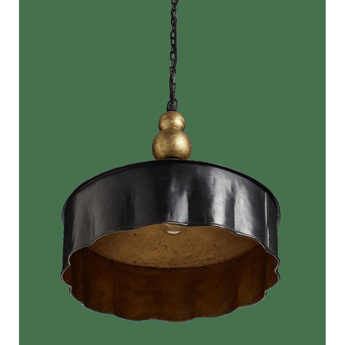 The Ayla’s name was chosen for the many natural and shining influences of the pendant light, with its Hebrew meaning translating to ‘oak tree’, and its Turkish translation being ‘a circle of light around the sun or moon’. Its playfully large round shape is cut and welded from a sheet of iron by skilled artisans, then finished with a charming scalloped edge that softens its metallic form and its contemporary black and gold tones. To achieve the colouring, the metal is sanded for a smooth surface, then rustic colour is applied to the inside and outside before being varnished and foiled. The wooden finials at its top appear like jewellery beads, finished in gold for extra glamour. Due to the artisanal processes that craft this lamp, each piece has individual characteristics.