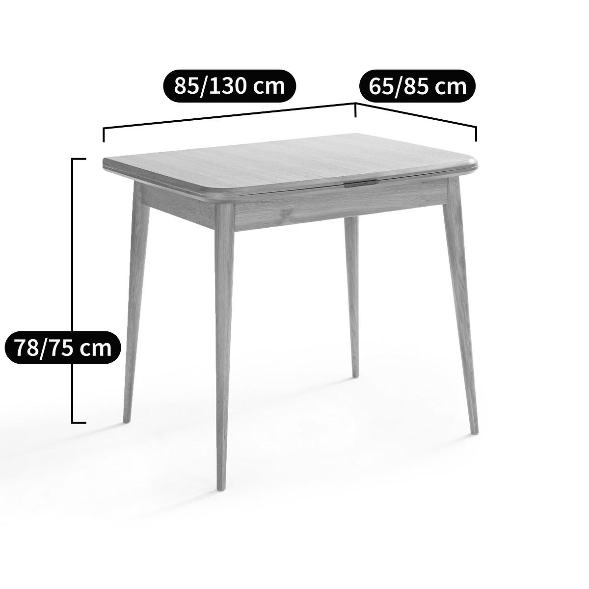 The Aylin extendable dining table. This contemporary and practical dining table features a nod to retro style. Practical thanks to its extension, it transforms into a dining table with 4 to 6 place settings. Product Details • Extension shelf • Top with bevelled edge • Top and frame in oak veneered MDF, nitrocellulose varnish finish • Tapered solid oak legs with nitrocellulose lacquer finish • Invisible platform locking system • Seats 2-6 people • Assembly: Approximately 1 hour, 2 people (minimum)Care instructions • To protect your table, consider trivets, coasters and placemats. Dimensions. Folded • Width: 85cm • Height: 78cm • Depth: 65cm. Extended • Width: 130cm • Height: 75cm • Depth: 85cmDelivery:. This product requires assembly. Available for home delivery. • WOOD FROM SUSTAINABLY MANAGED FORESTS. FSC® certified wood comes from forests that are environmentally, socially and economically well managed. Dimensions and weight of parcel1 parcel • L93 x H19 x D72cm. 23.7kg