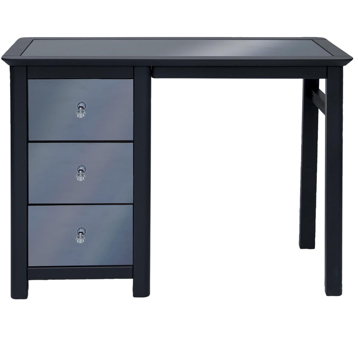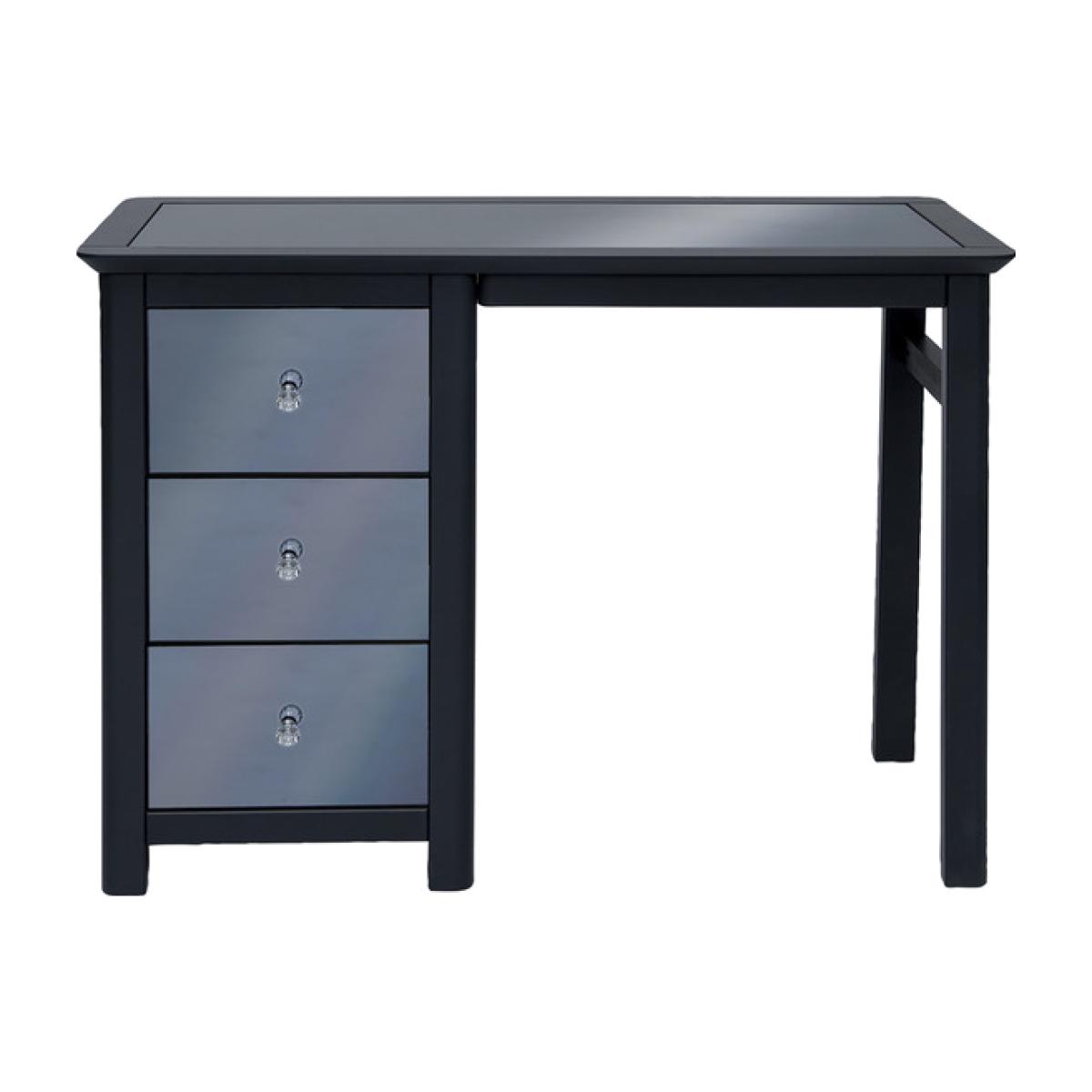 Smoked mirrored glass top helps to protect the dressing table from make up spills and smudges. Three useful drawers in the pedestal are perfect for keeping your make-up and accessories organised. Crystal effect handles add to the luxury appeal of the Aye range and work beautifully with the smoked mirrored glass drawer fronts. The hand-crafted Ayr bedroom furniture range brings you luxurious smoked mirrored glass, dark carbon paint and crystal effect handles. Constructed with a traditional build from solid wood, MDF and glass. Wooden drawer runners. Part of the new Ayr easy self assembly bedroom furniture range.